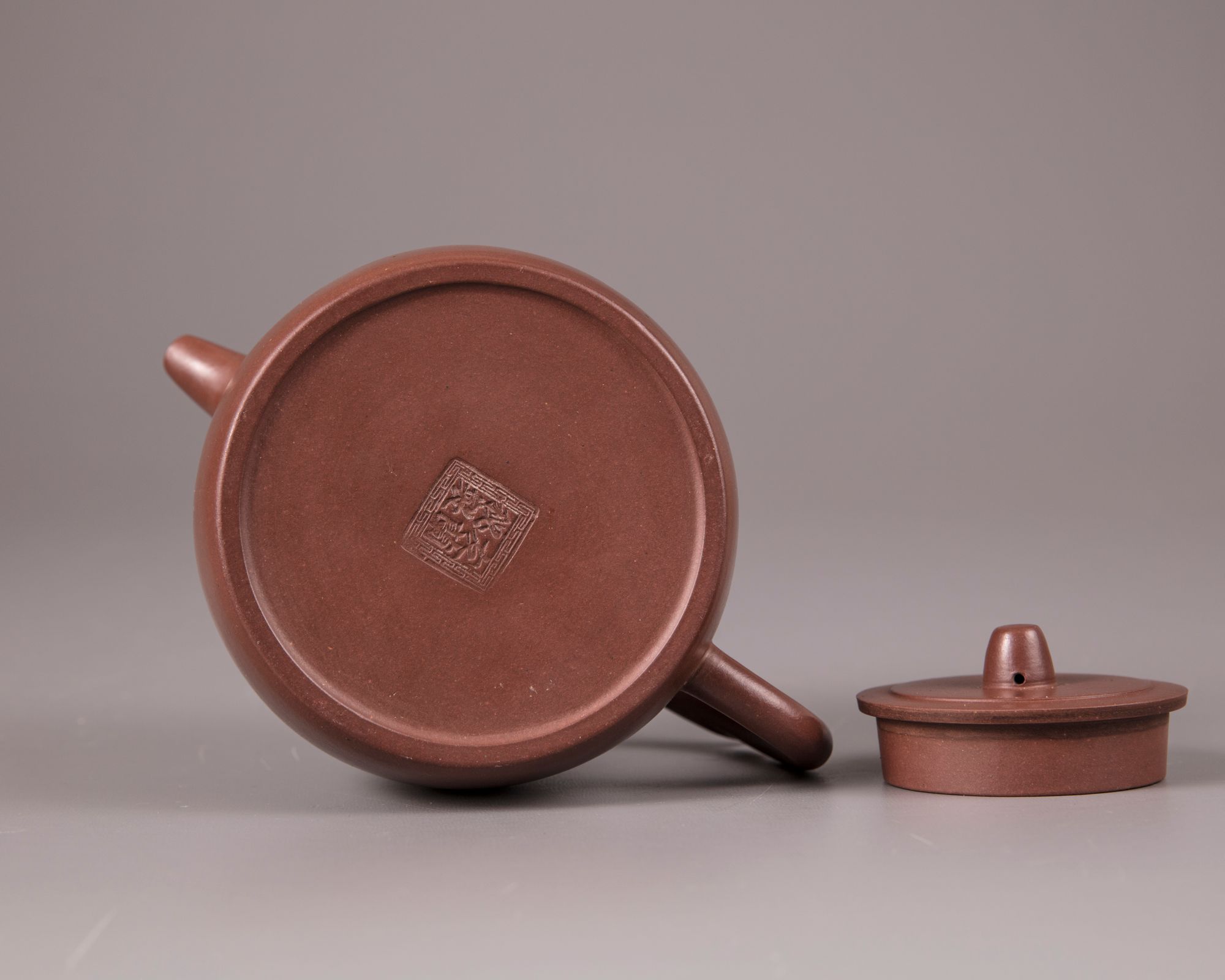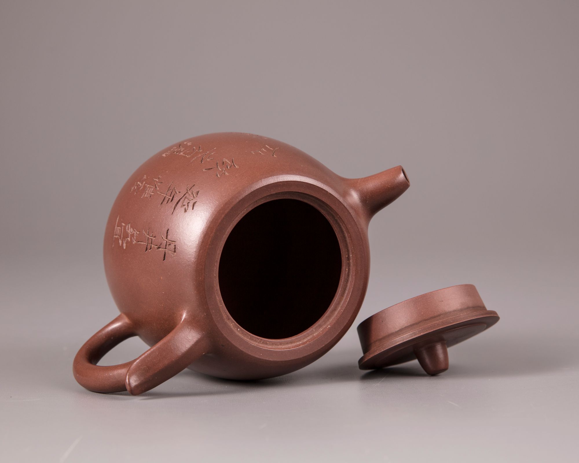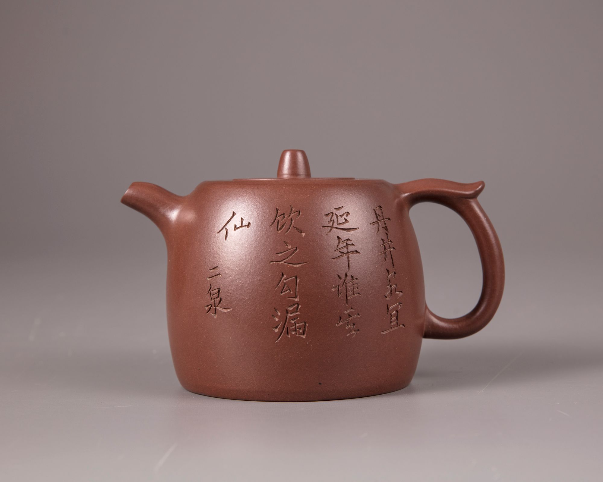 The slightly tapering barrel-form teapot is decorated to one side with a poetic inscription and signed 'Er Quan'. The base with a stamped mark reading 'Youlan mizhi' which may be translated as 'secretly made by Youlan'. The flat cover is surmounted by a cylindrical finial.