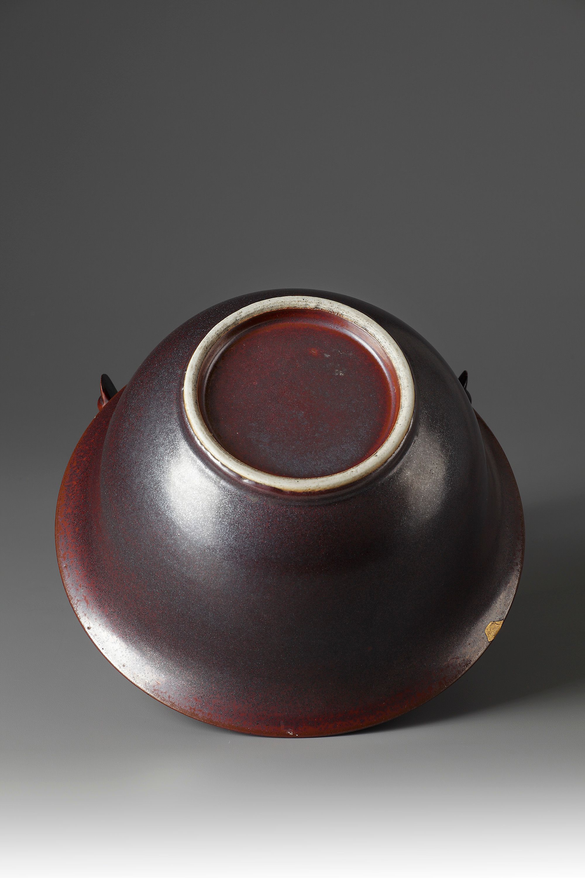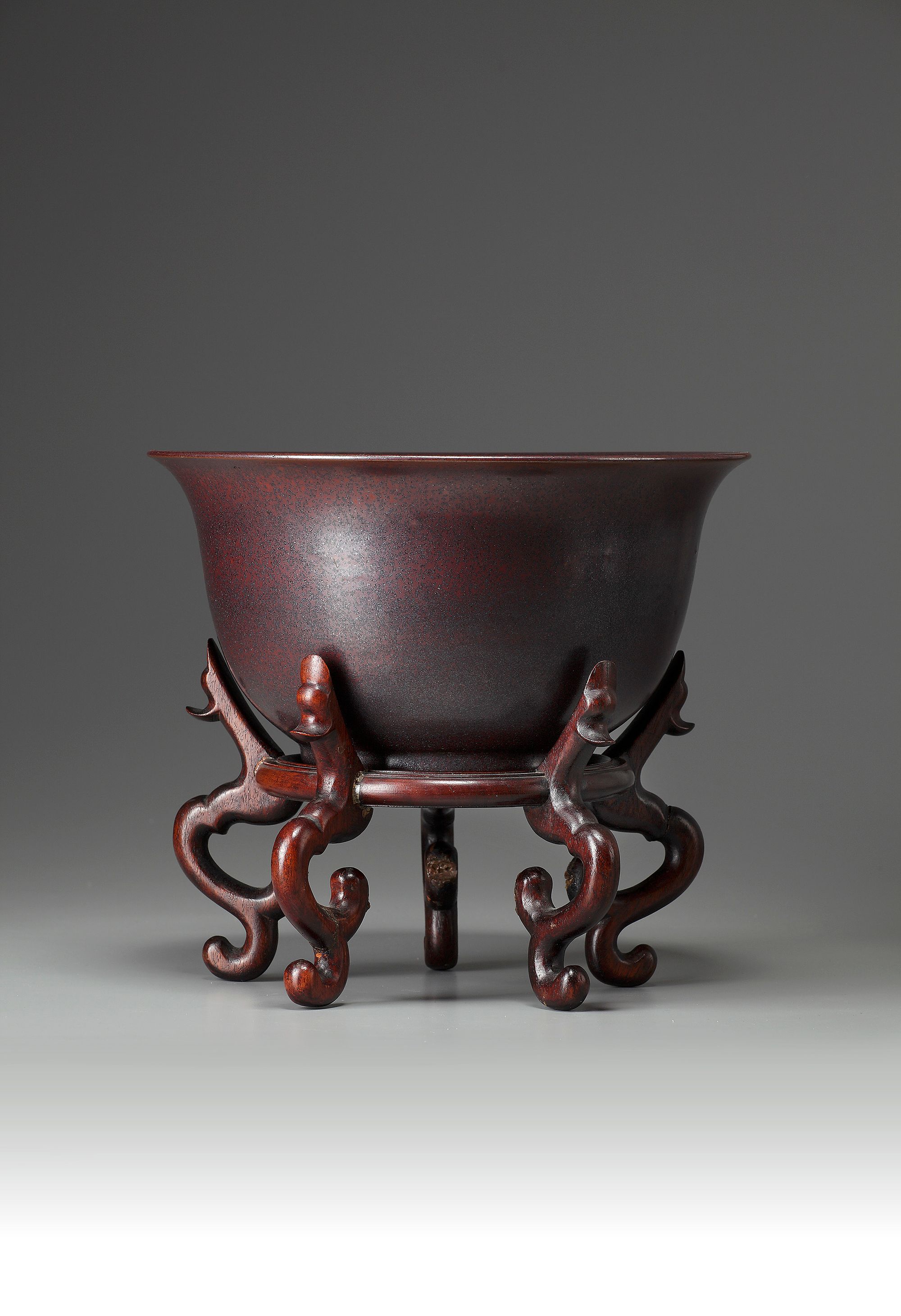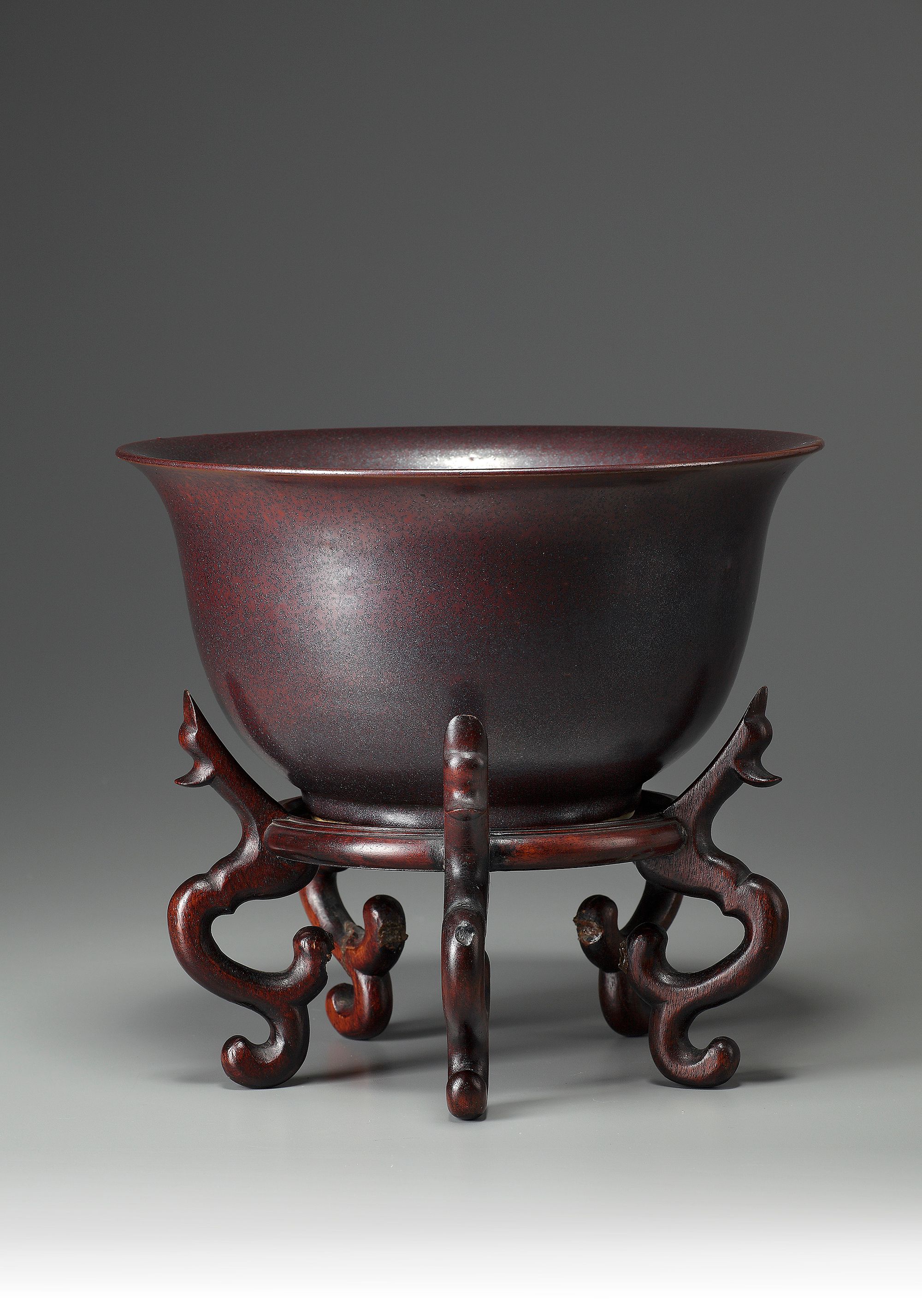The gently rounded sides slightly waisted and rising from a straight foot ring to an everted rim, covered overall with a rich aubergine glaze.