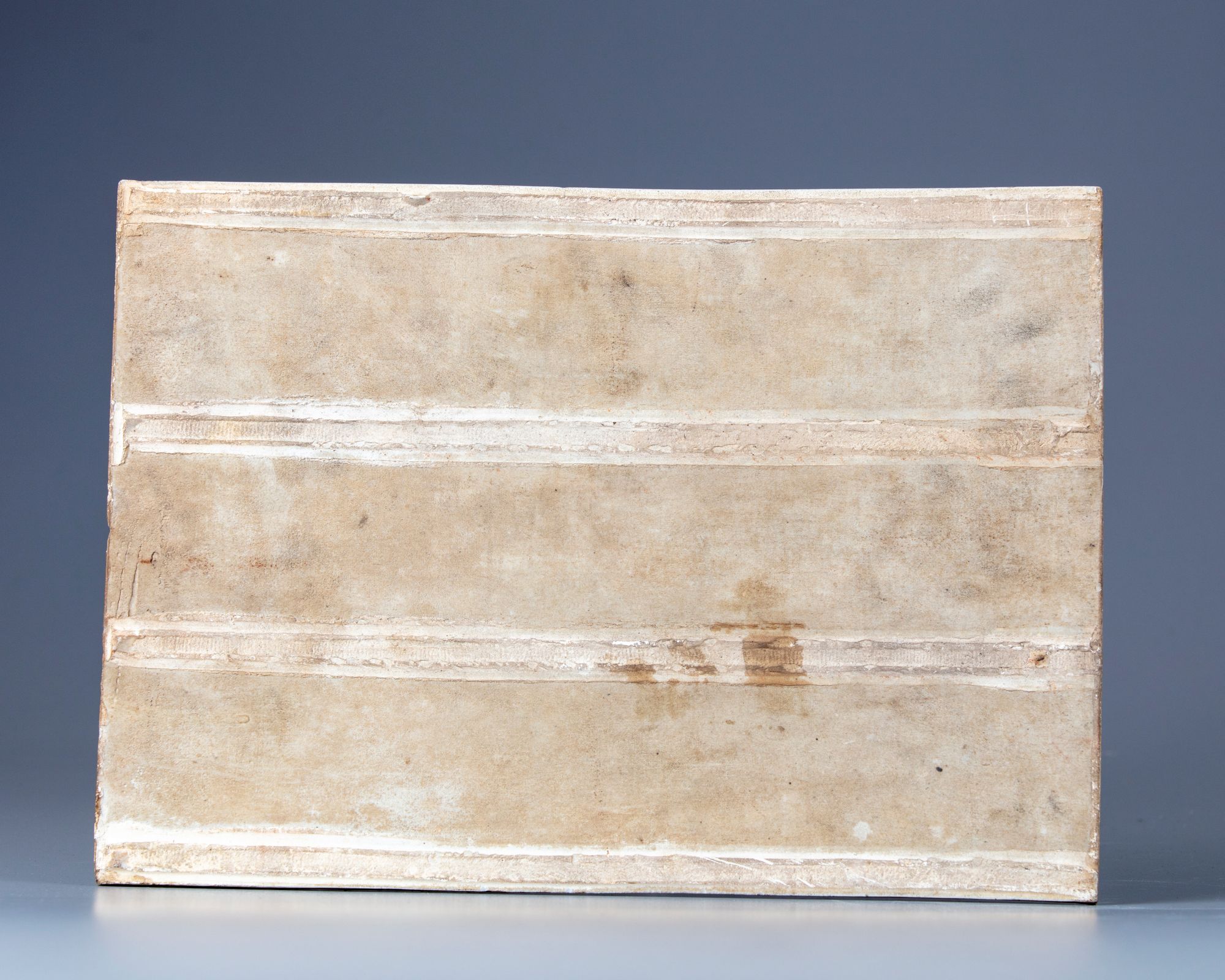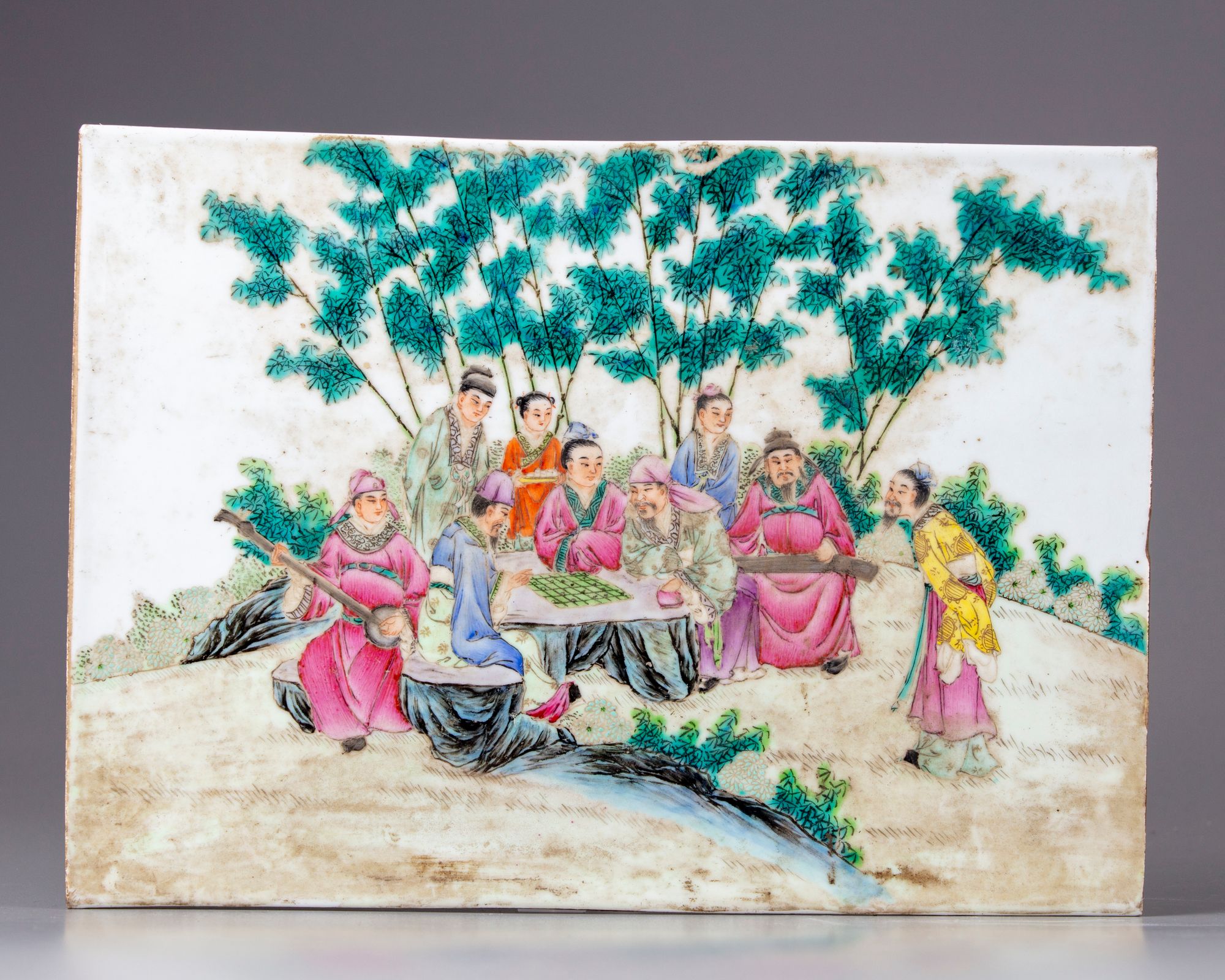 The rectangular plaque is decorated with two dignitary figures playing chess and surrounded by attendants at play on music instruments and attendants in a landscape.