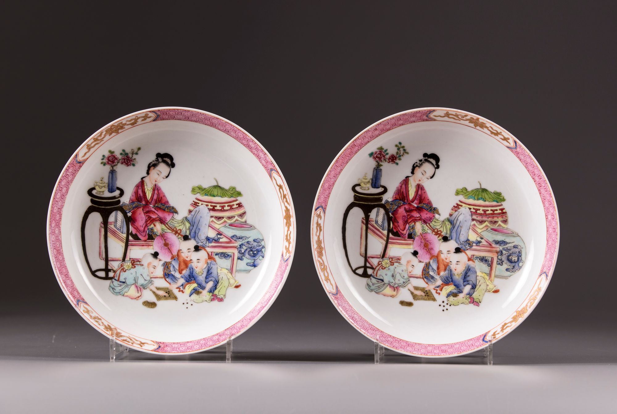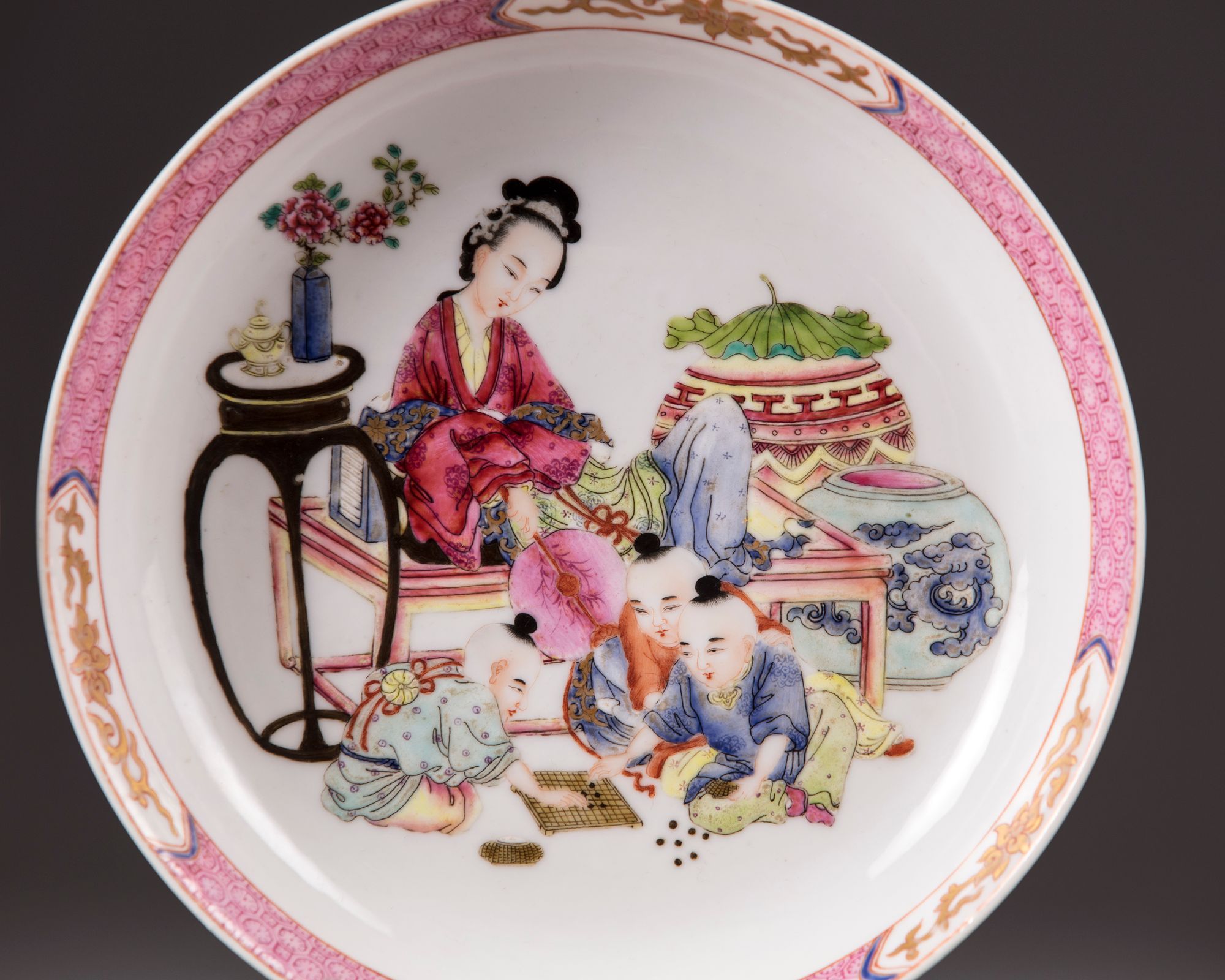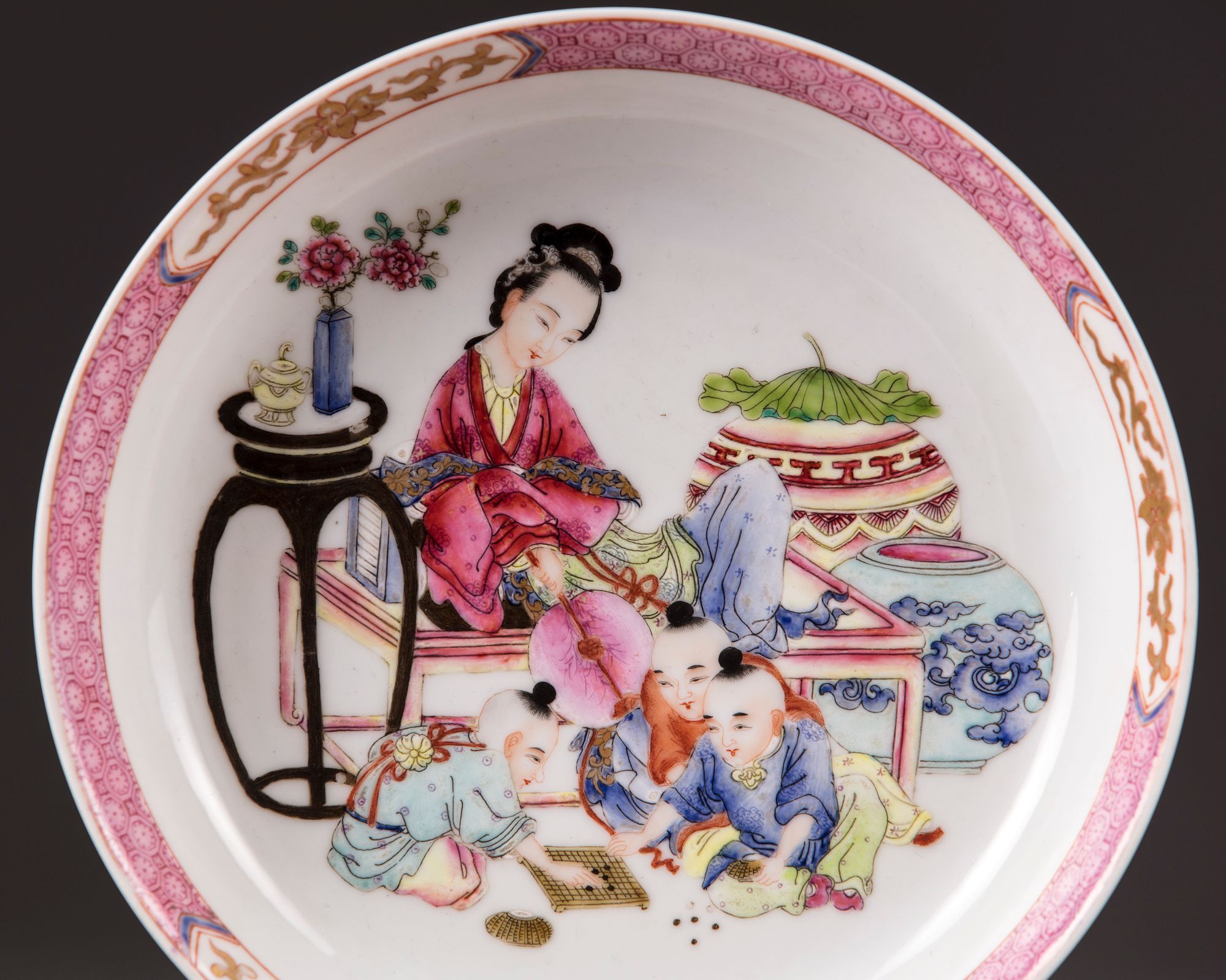 Enameled at the center with a lady and children at play, within diaper borders containing cartouches of gilt flower scrolls.
