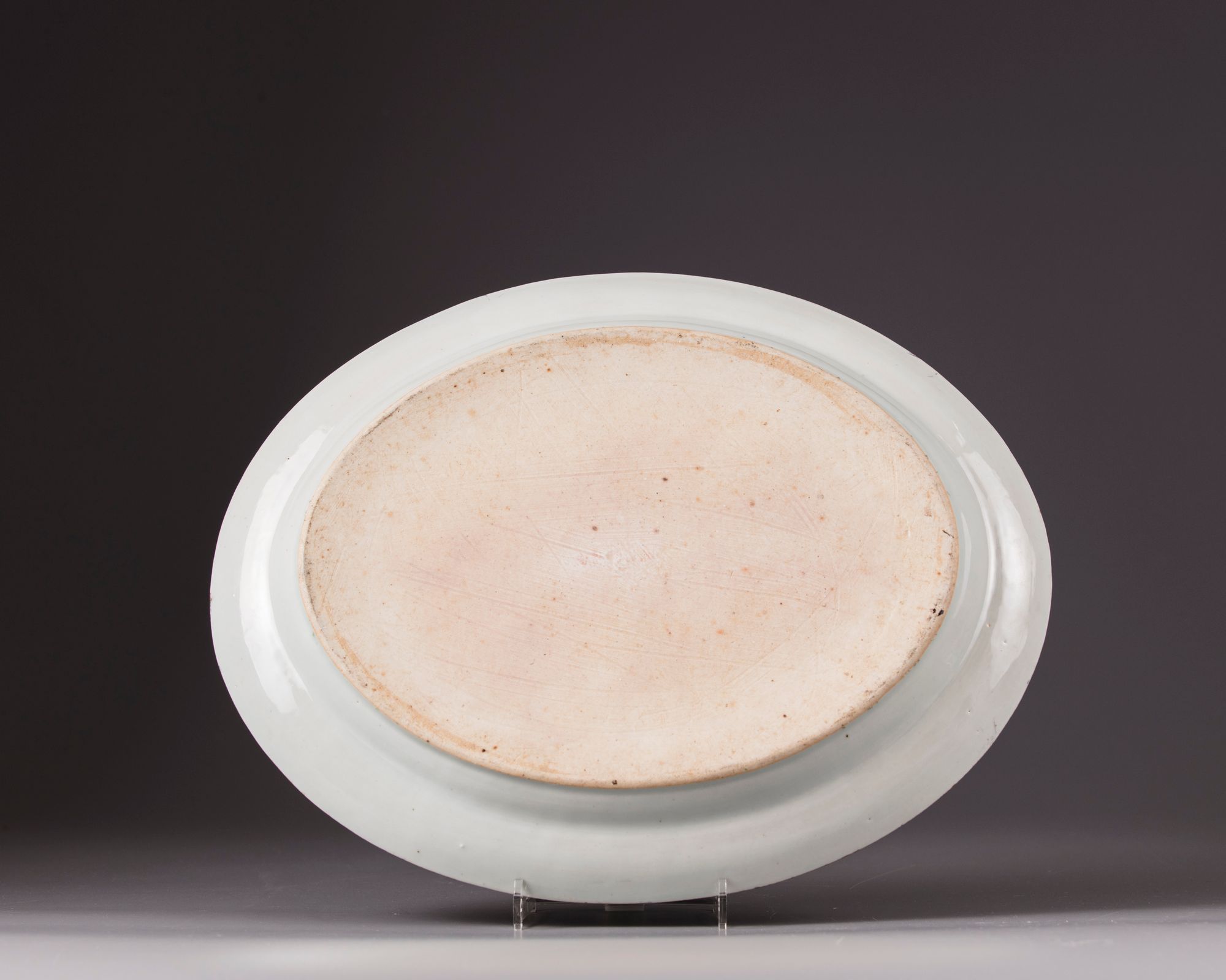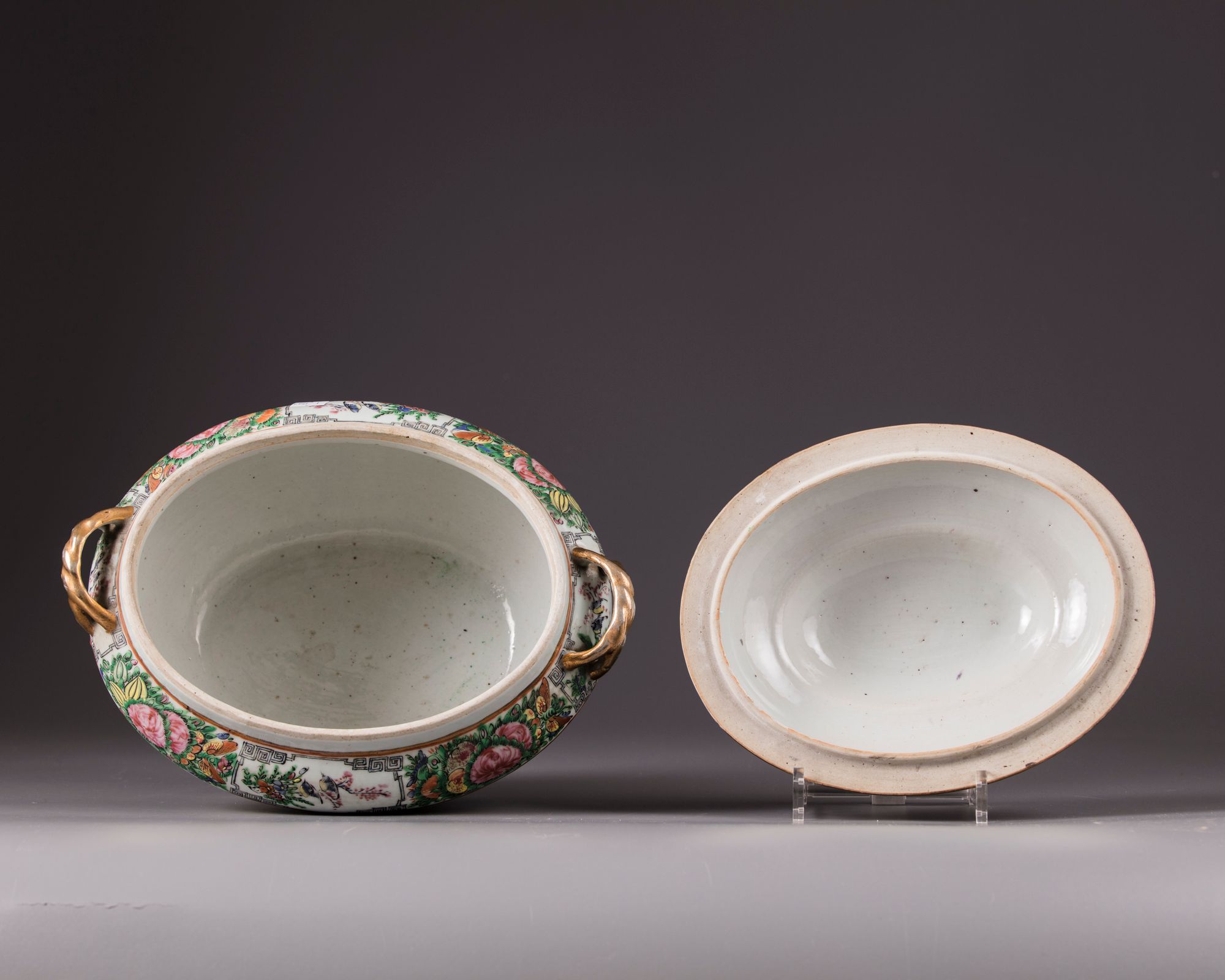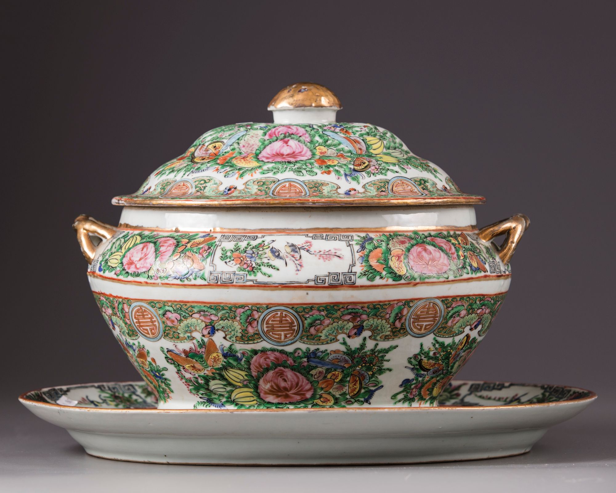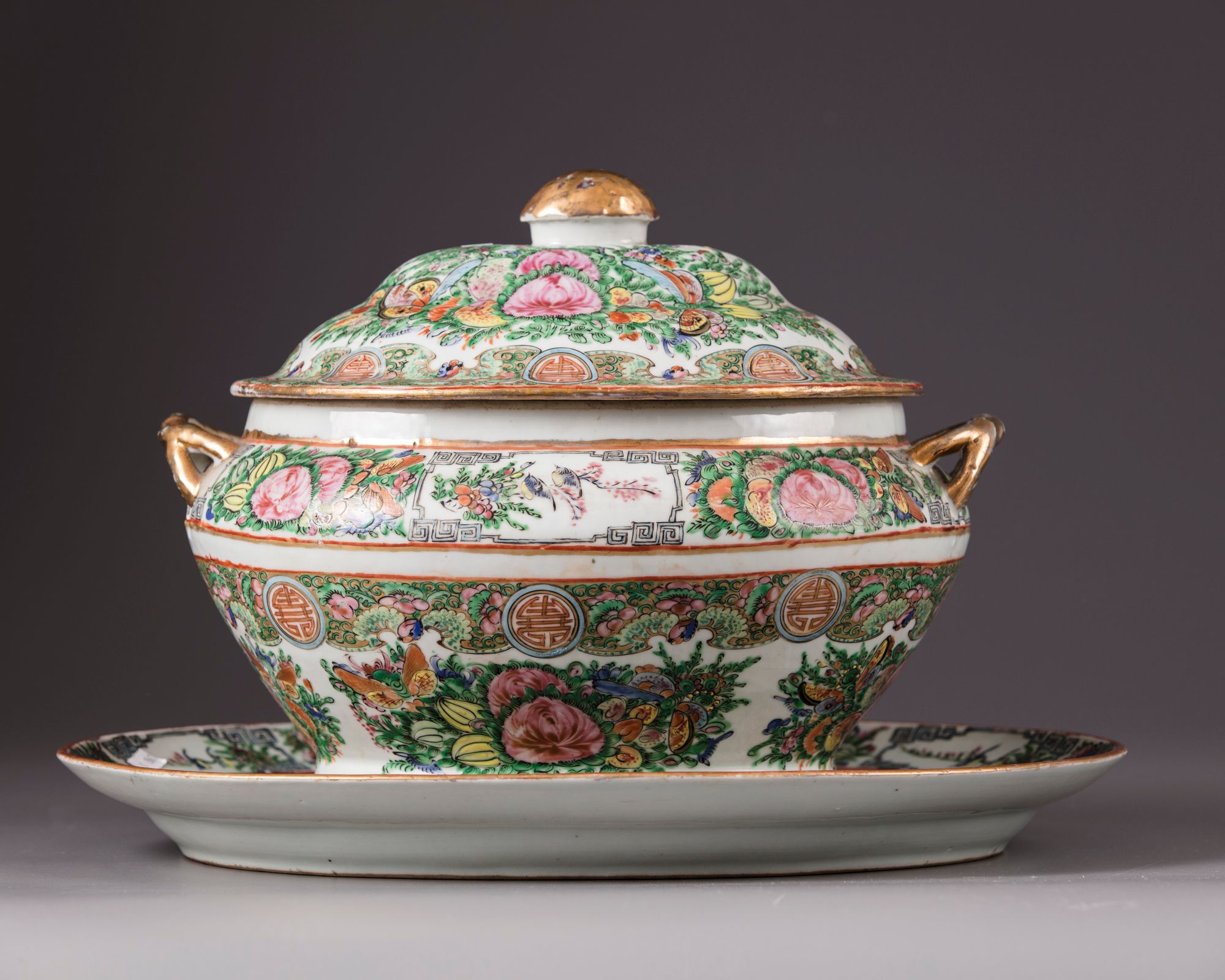 The tureen is fashioned with two upward swept gilt handles and a domed cover surmounted by a mushroom-cap finial, all on an oval stand. Each piece is decorated with panels containing chrysanthemums, flowers, foliage, birds perched on flowers and shou roundels.