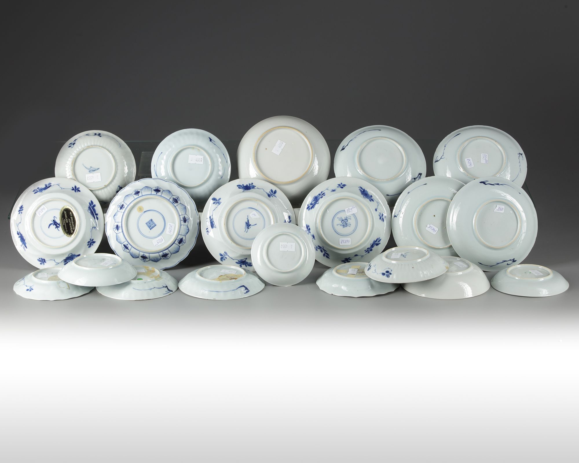 The group comprises a saucers of various sizes, decorated with figures, landscapes, and flowers. Some with symbol marks to the reverse.