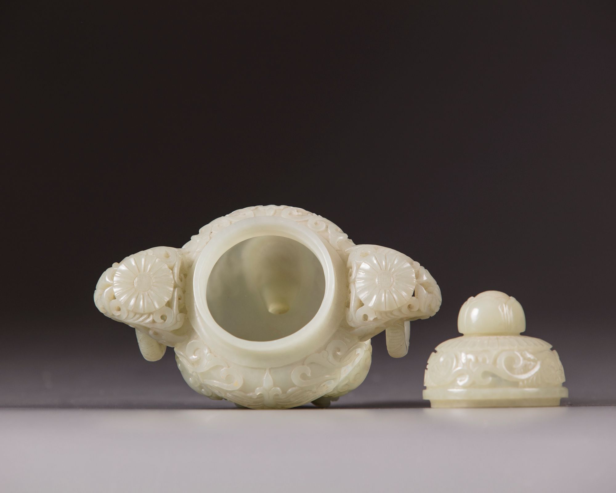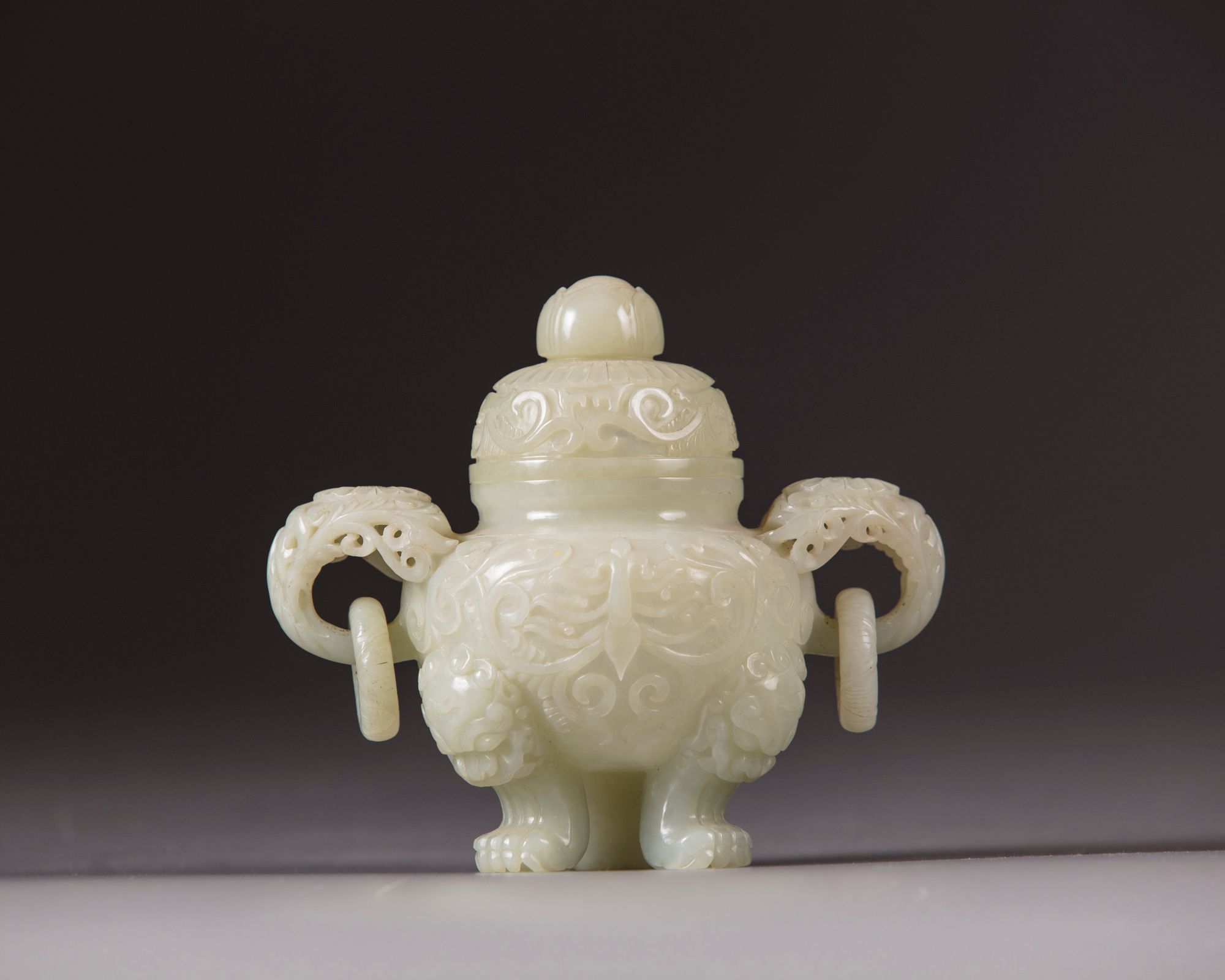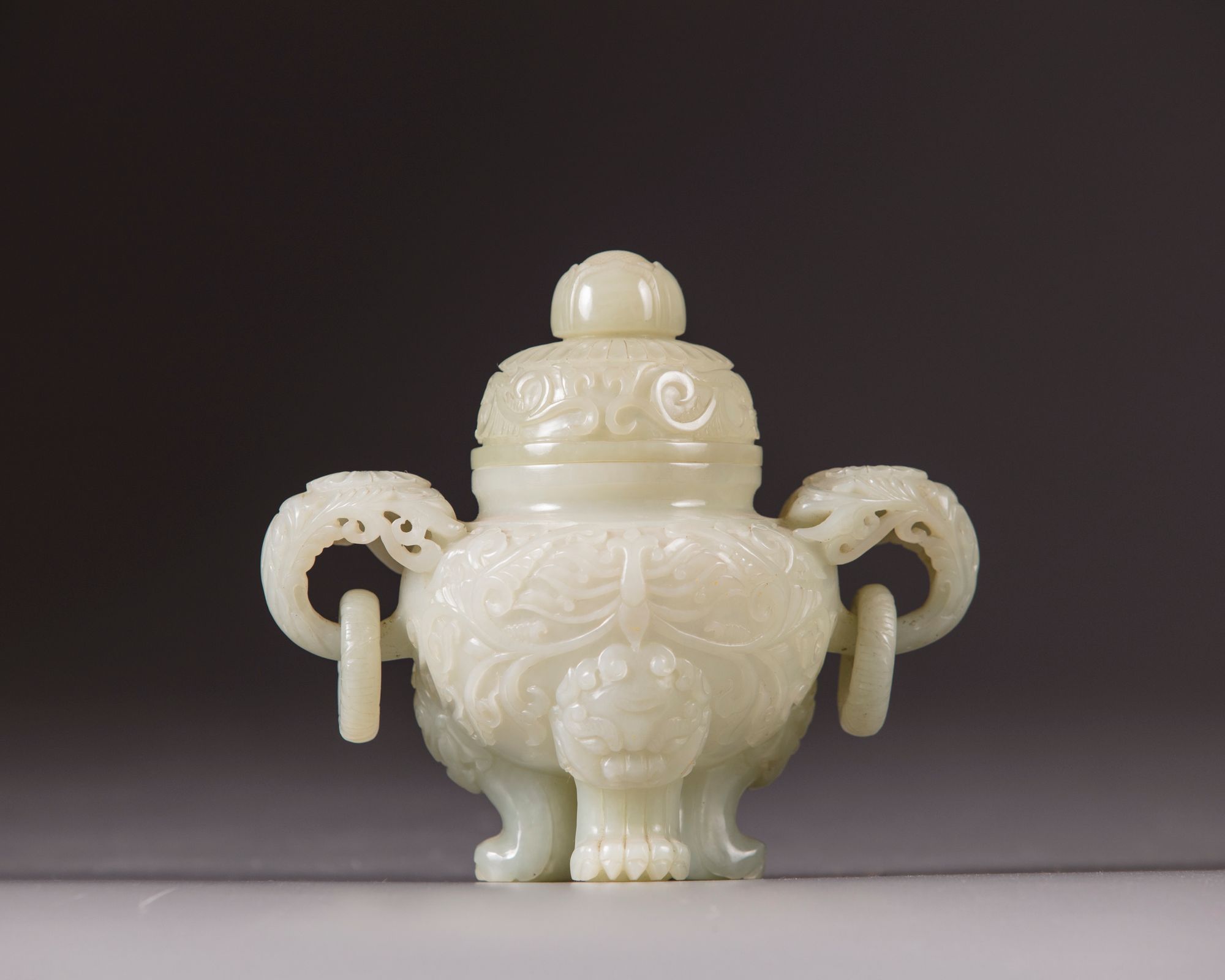 The body and legs are thinly hollowed, the three feet emanate from beast heads. The shoulder is decorated by two loose-ring openwork floral handles, and the body is carved with scrolling lotus in low relief. The cover is similarly decorated and is surmounted by a lotus finial surrounded by chrysanthemum petals. The jade is of an even tone. Provenance: From the collection of mr. J.E. Vaandrager