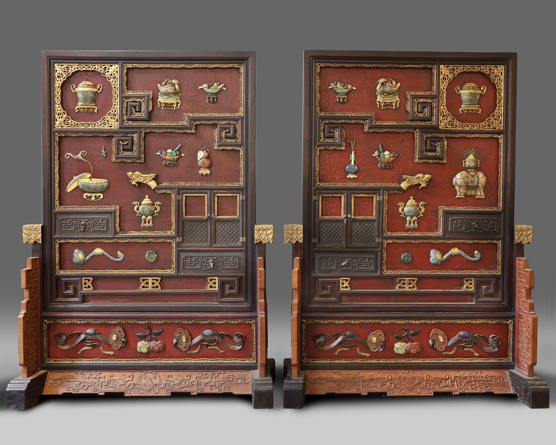 Each screen is impressively decorated as a display cabinet, duobaoge, with each level containing a precious object such as censers, ruyi sceptres, bi discs, boxes, fruits, elephants and double gourds, all inlaid in cloisonné enamel, hardstones, and mother of pearl, all on a red lacquered ground. The openwork wood friezes are gilt lacquered and one of the sections is fitted with a faux cabinet. The stand is decorated with carved kui dragons and archaistic scrolls.