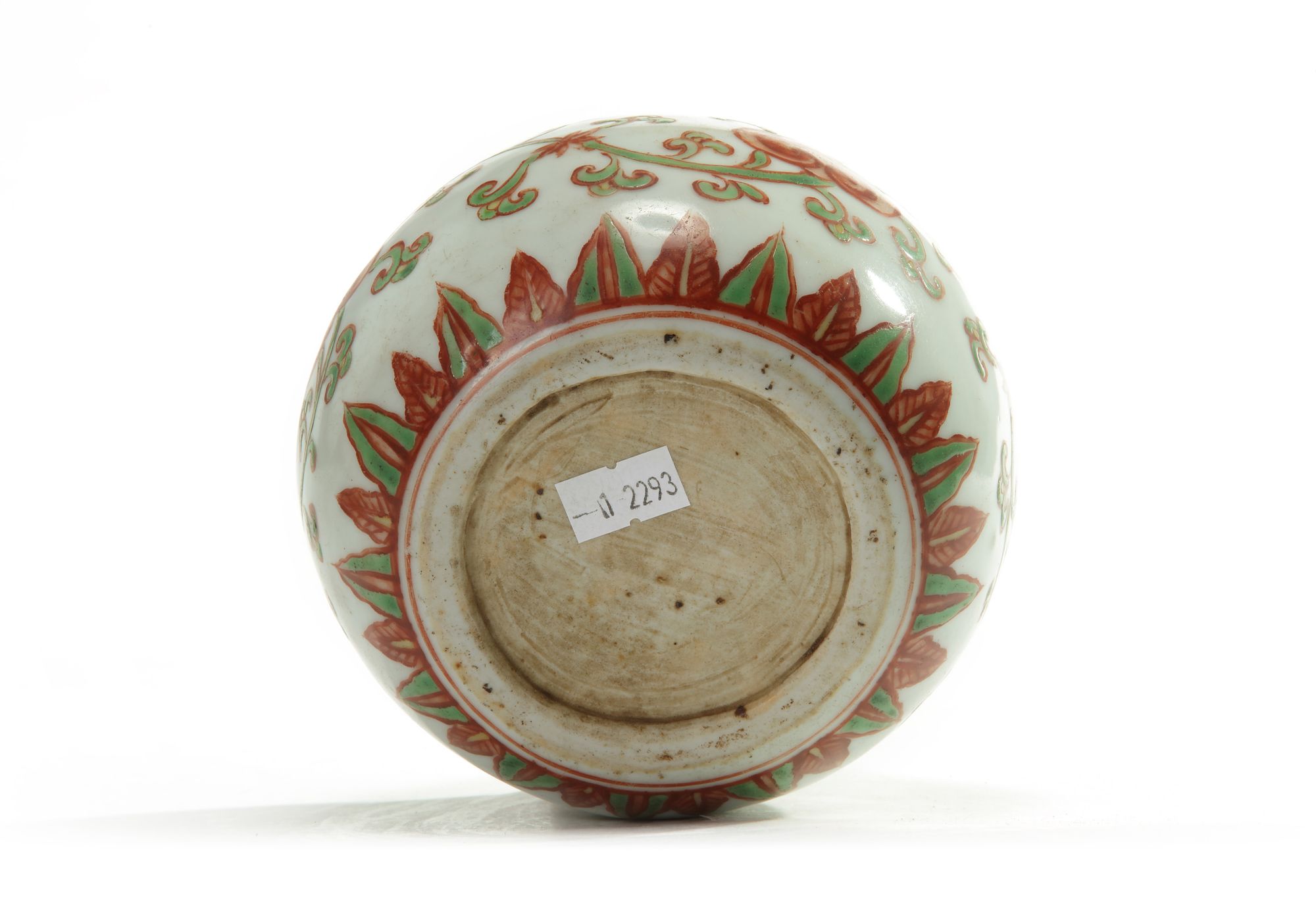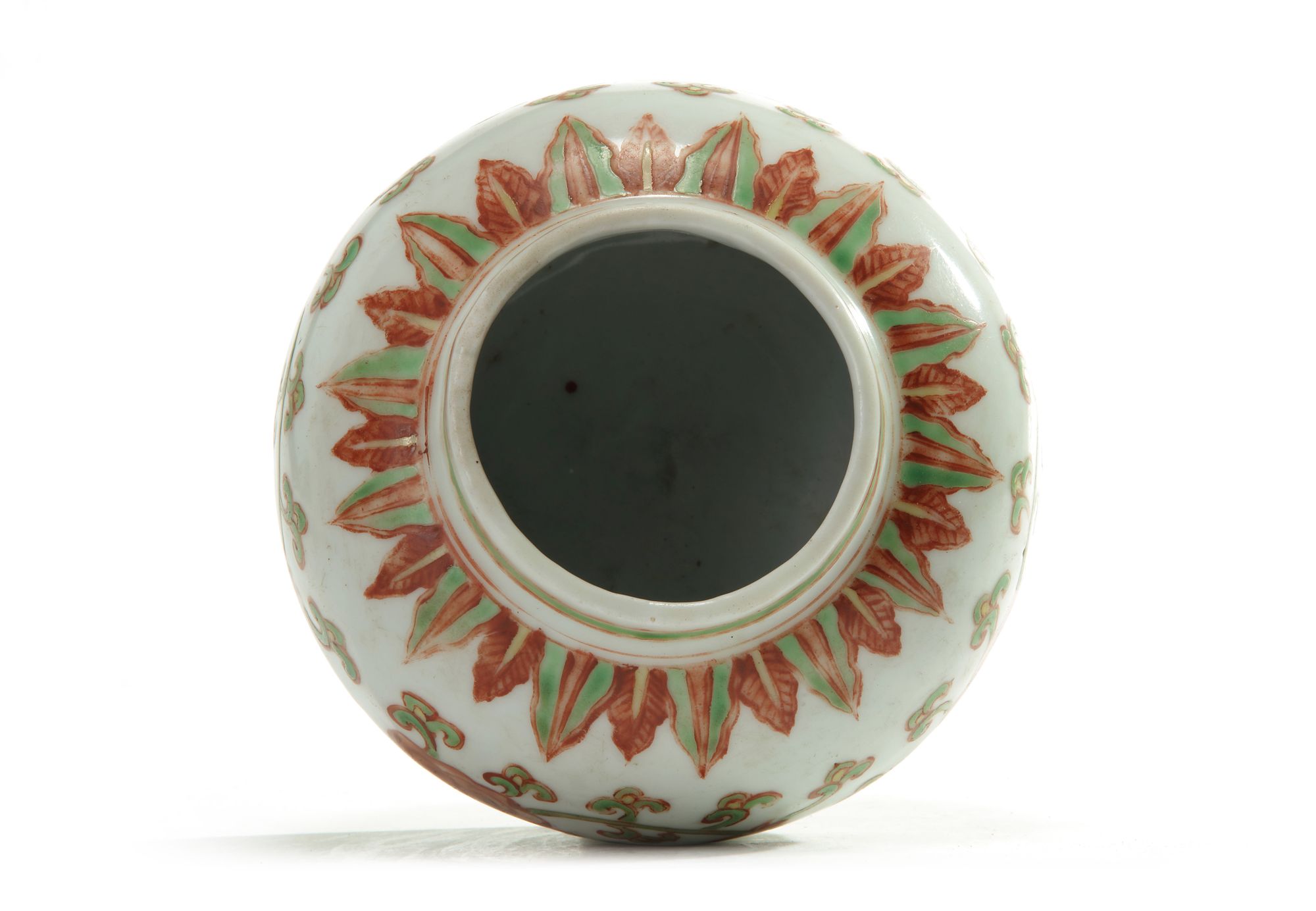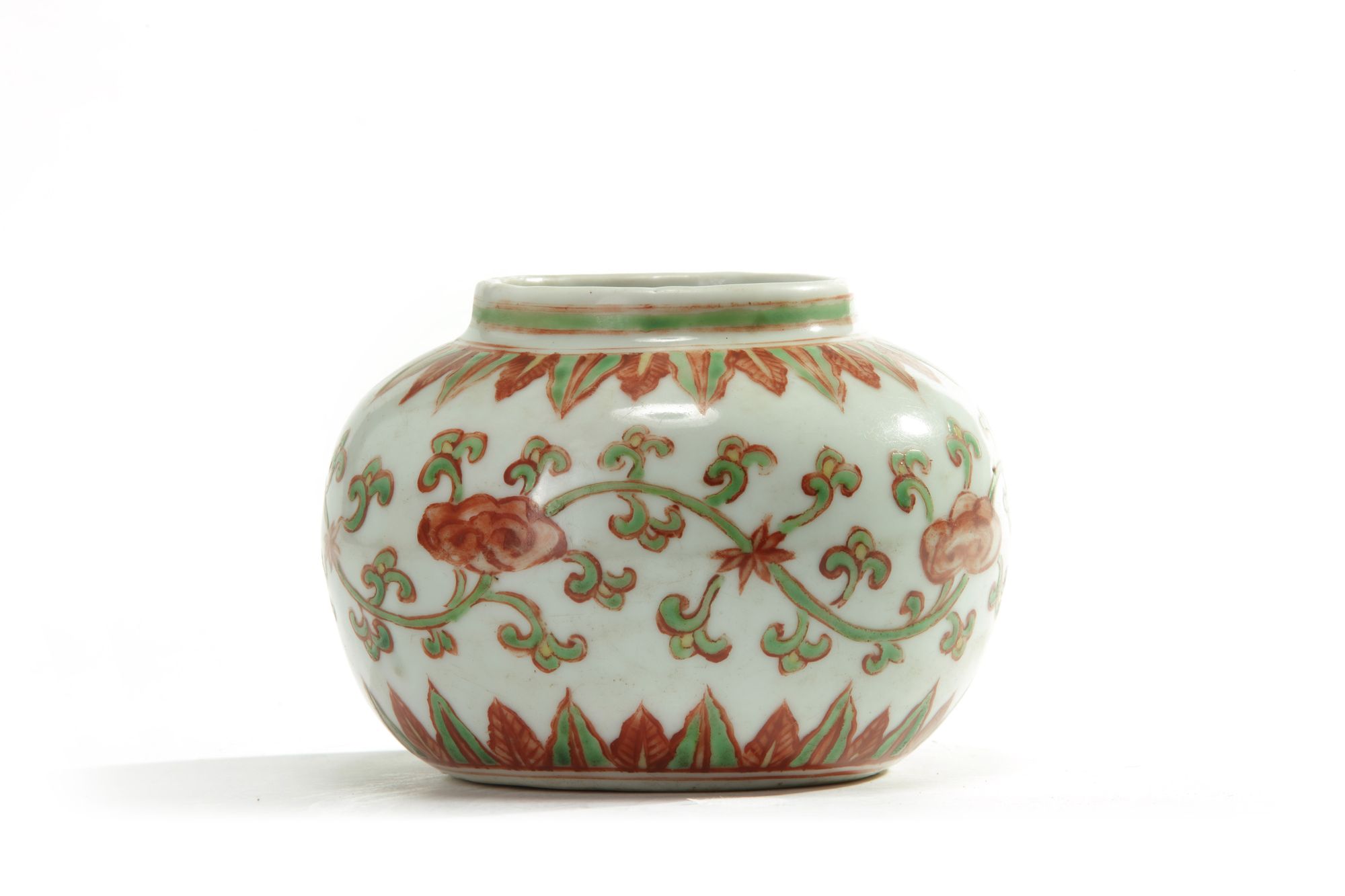 The small squat waterpot is decorated to the exterior with iron-red and green enamelled scrolling lingzhi between two stiff leaf bands.