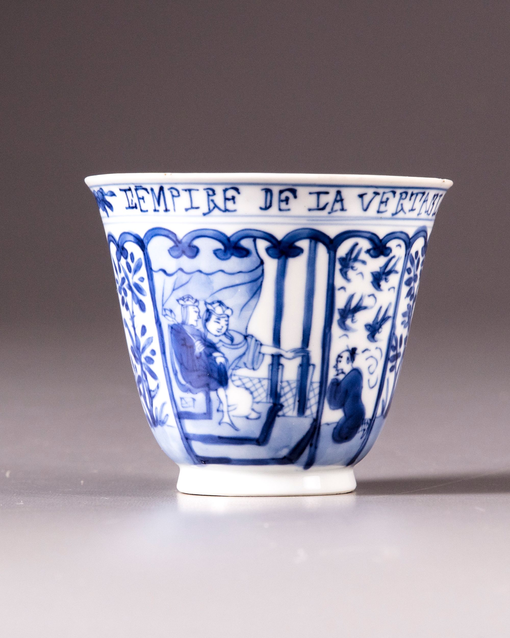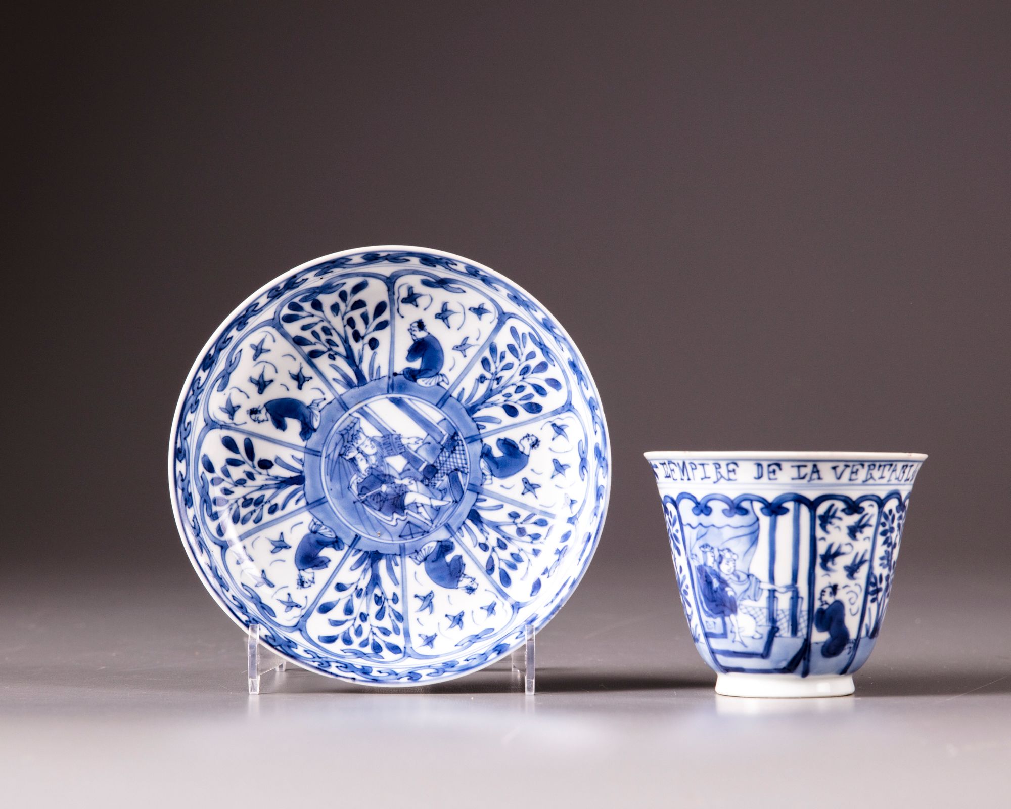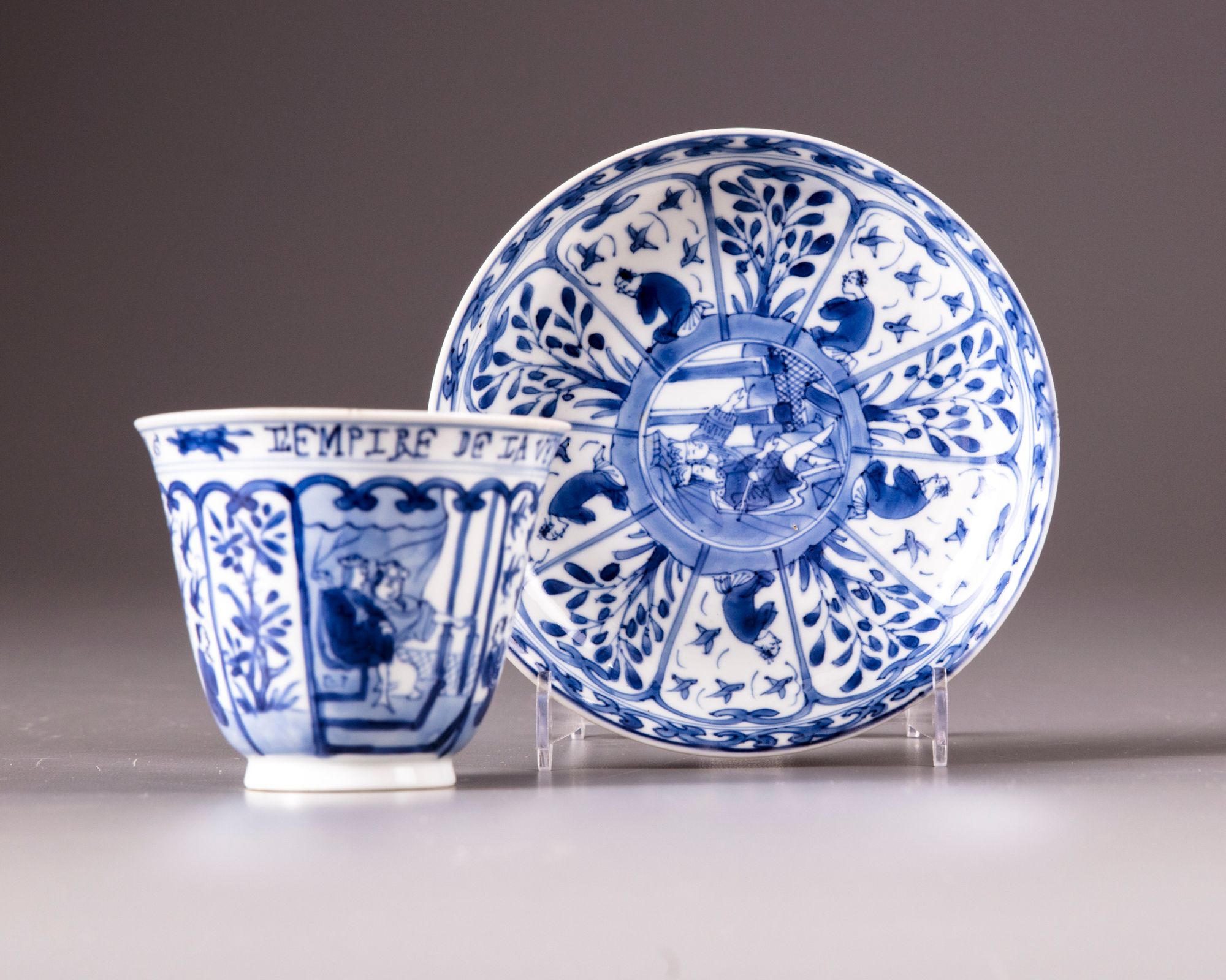 The saucer decorated with a roundel containing two noble figures, surrounded by panels with alternating scenes of a tree and a figure with birds. The cup with similar scenes and a French inscription "The Empire of virtue is established to the end of the Universe". Teacup; H: 7.00, D: 8.50 cm. Saucer; D:13.00 cm.