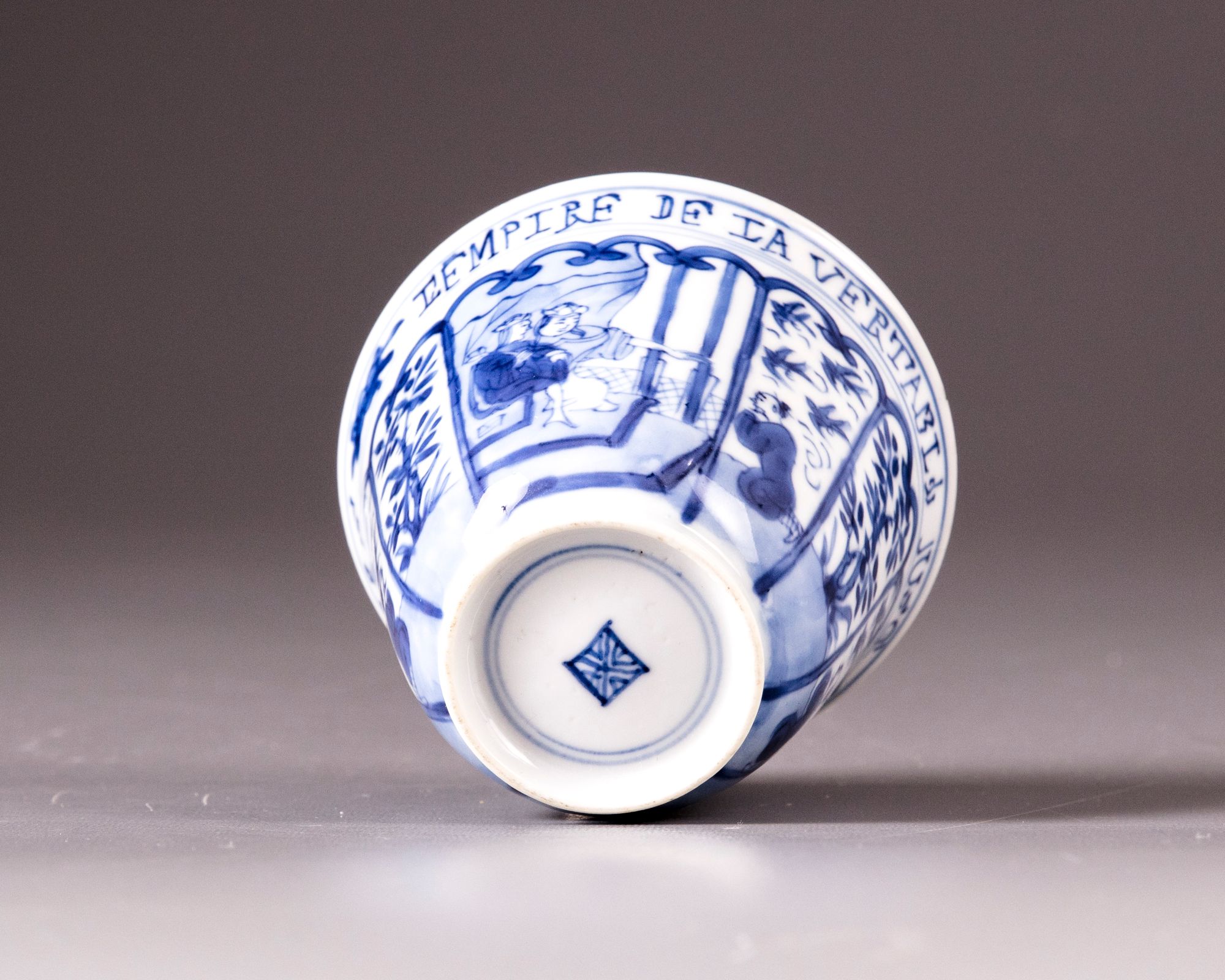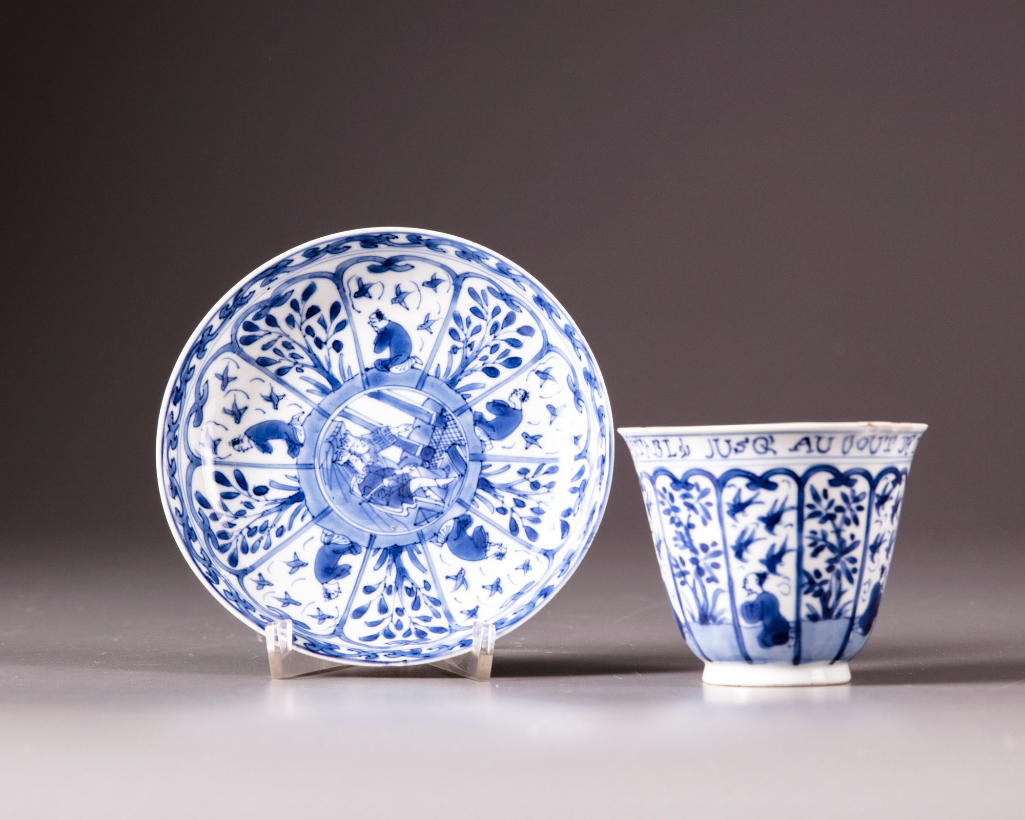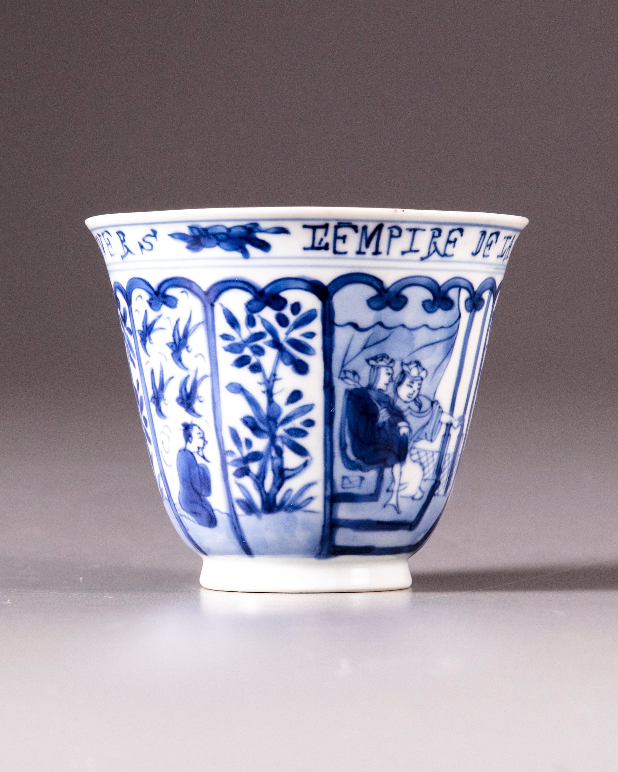 The saucer decorated with a roundel containing two noble figures, surrounded by panels with alternating scenes of a tree and a figure with birds. The cup with similar scenes and a French inscription "The Empire of virtue is established to the end of the Universe". Teacup; H: 7.00, D: 8.50 cm. Saucer; D:13.00 cm.