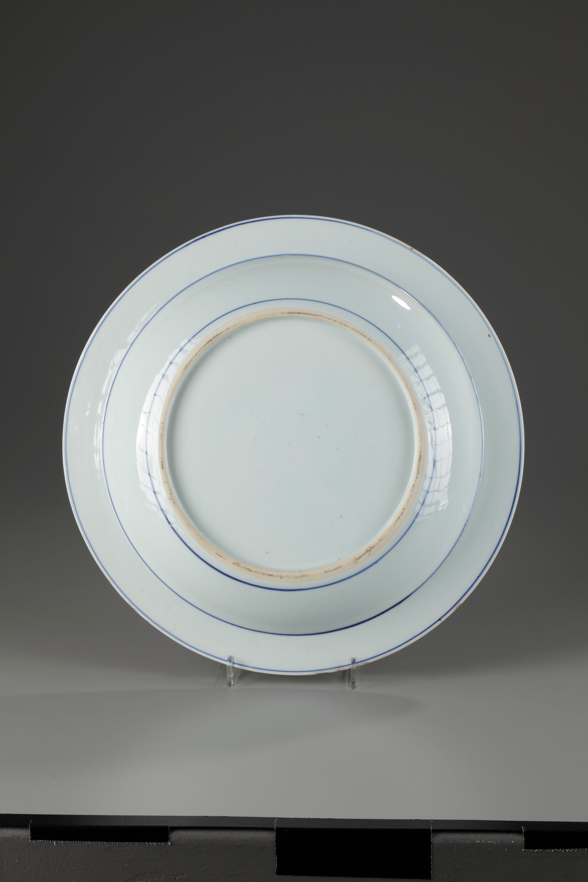 decorated in the centre with a scholar and a servant in an interior and two ladies in a garden, the well with four panels of peony and lotus reserved on a trellis diaper ground, the rim with continuous border of flowering plants.