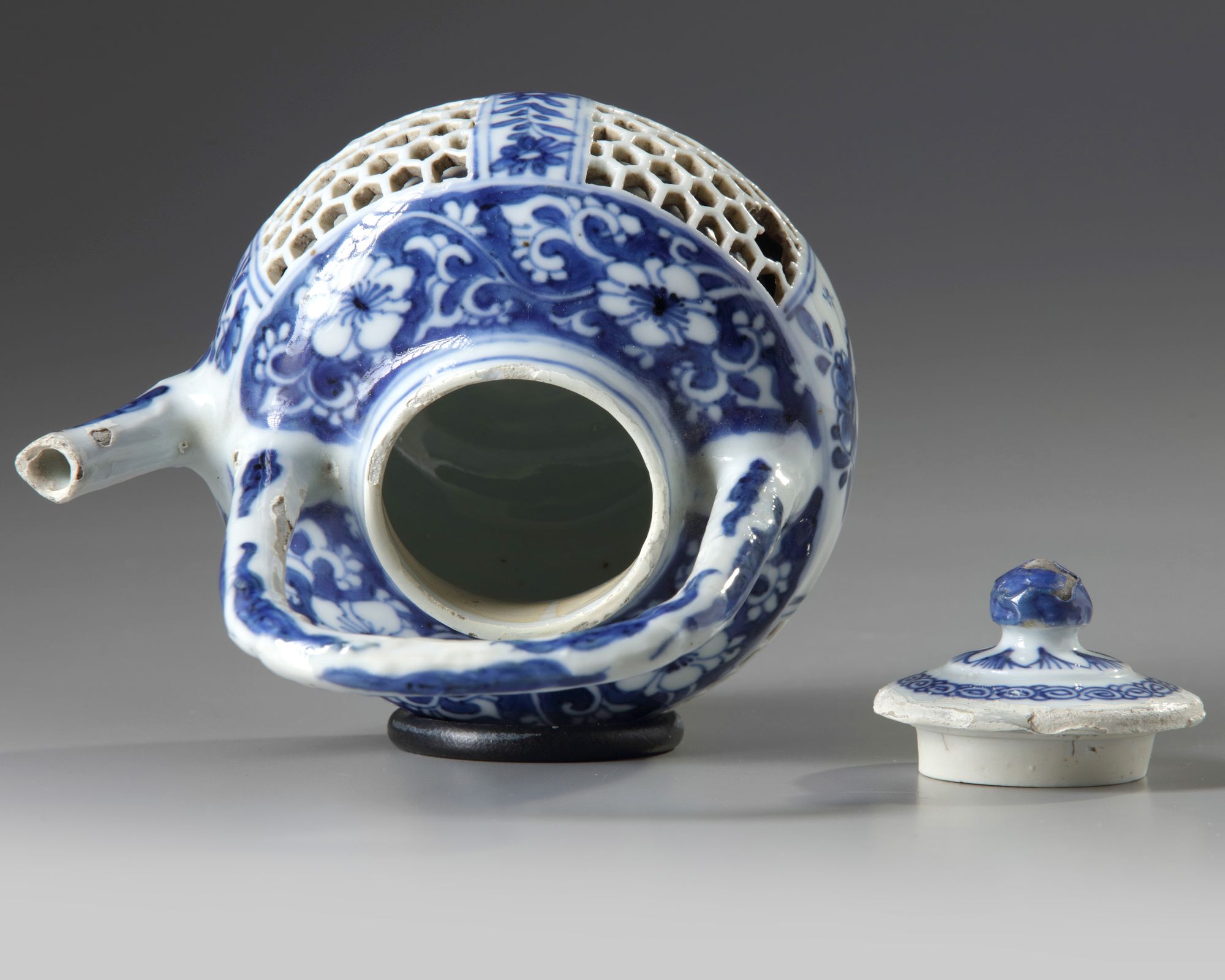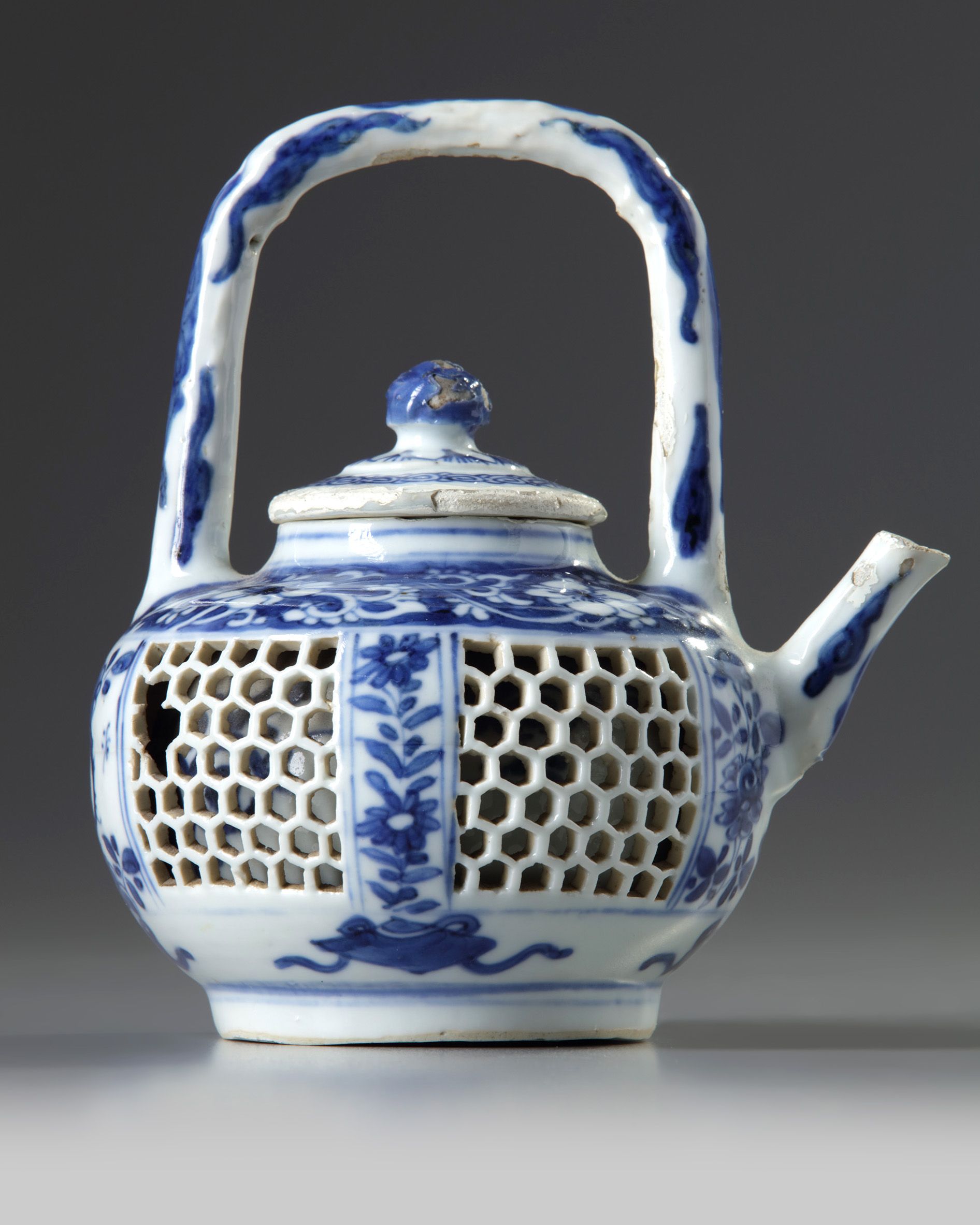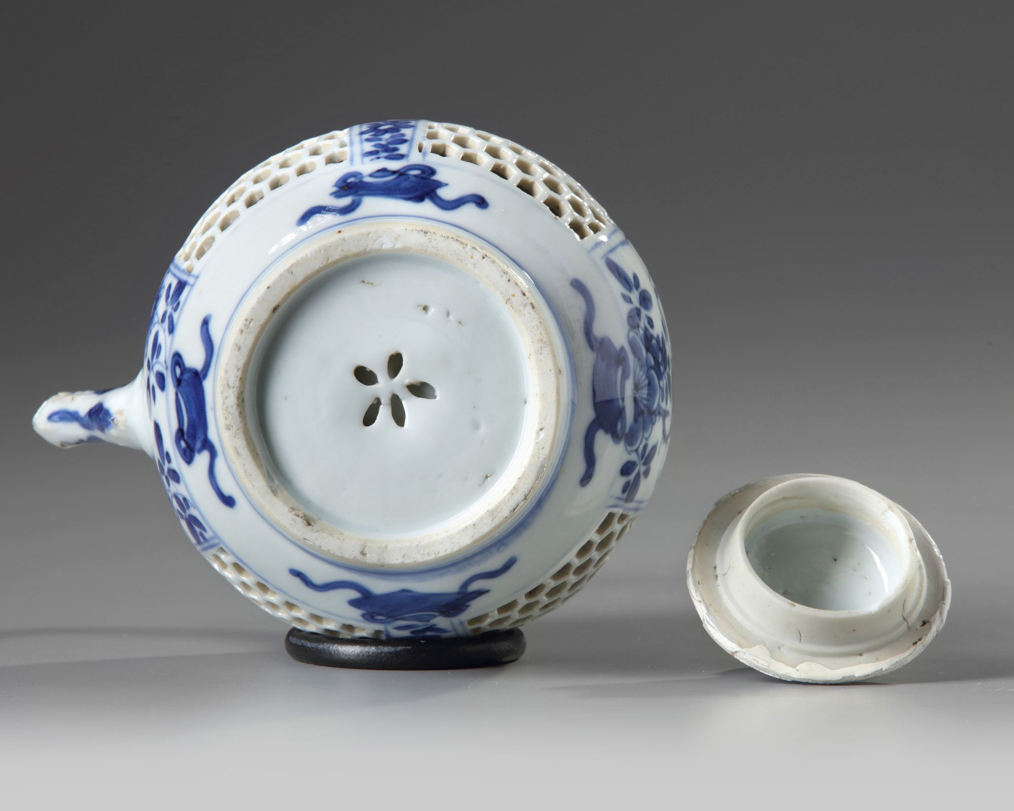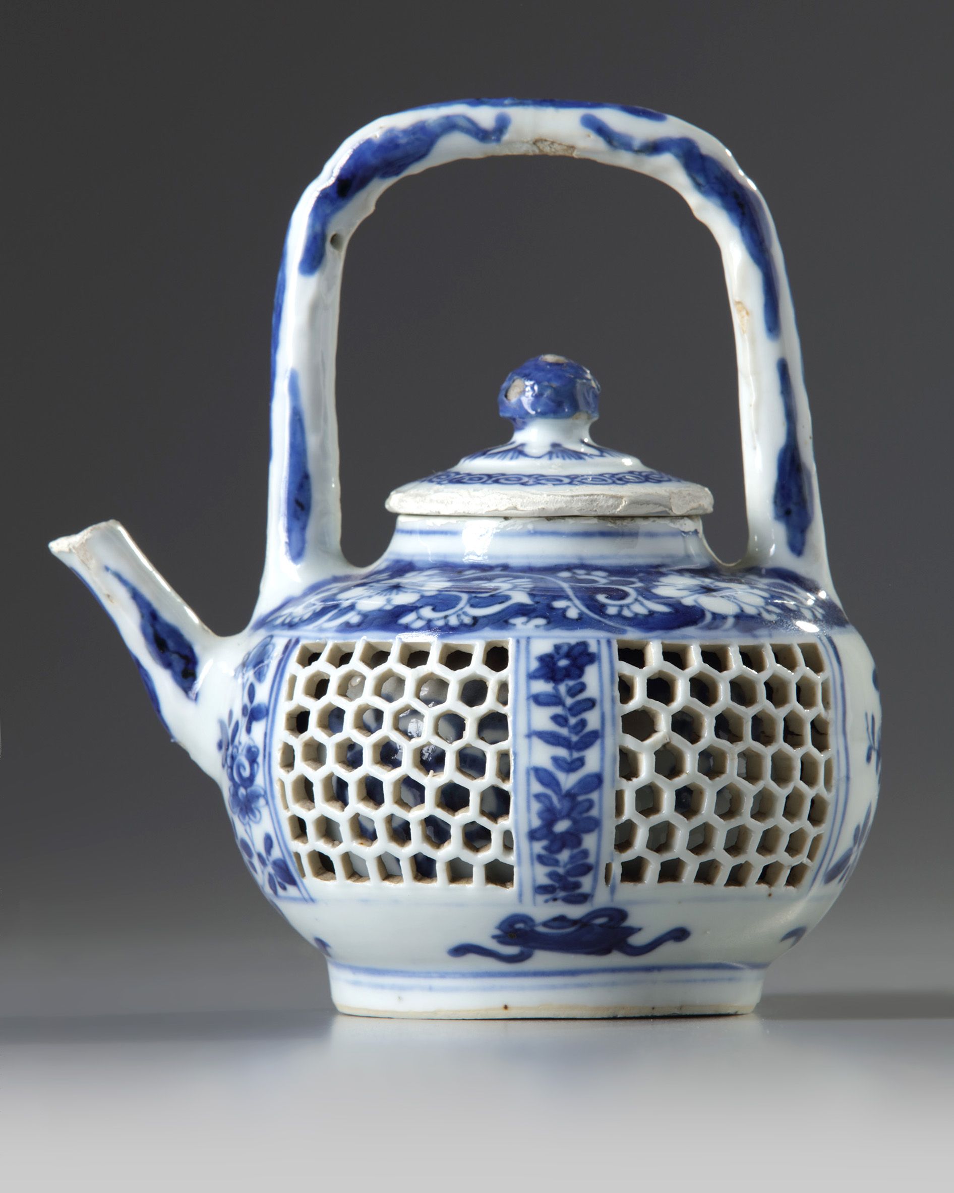 The teapot is decorated with four panels of recticulated honeycomb design, separated by a vertical flower scroll, all between scrolling flowers to the shoulder and precious objects by the foot. The flattened cover is decorated with a flower head surrounded by a classic scroll. The upright handle and straight spout are decorated with cloud sprays and the underside is decorated with a pierced flower head.
