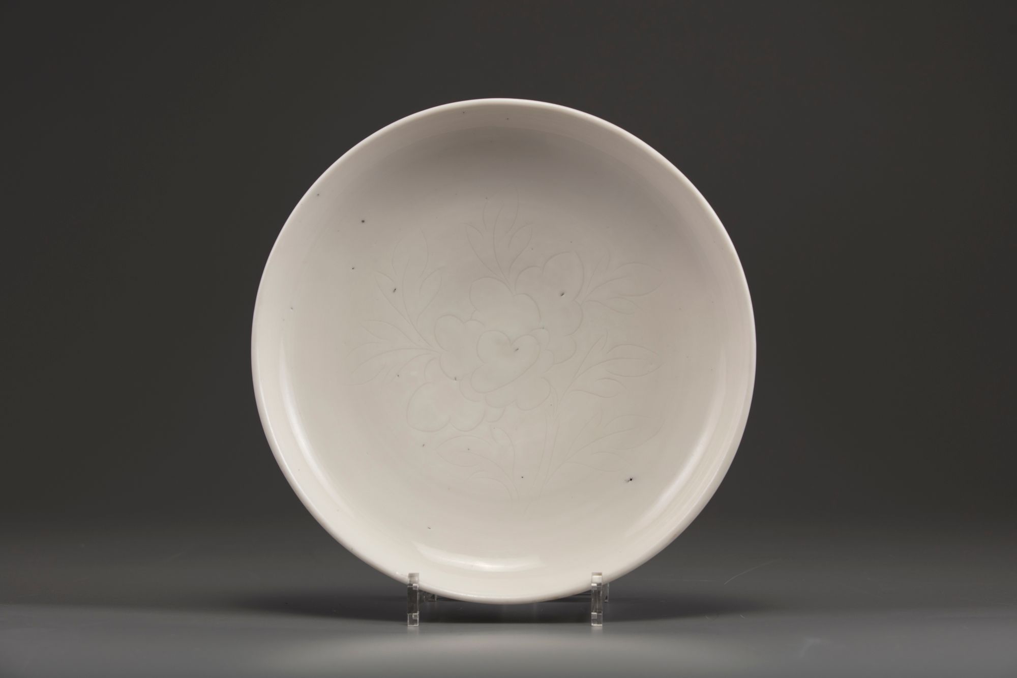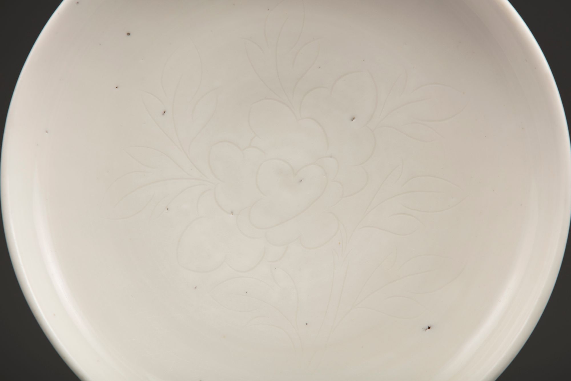 The interior is decorated with a large, freely-incised peony to the centre. The porcelain is covered overall with an ivory glaze.