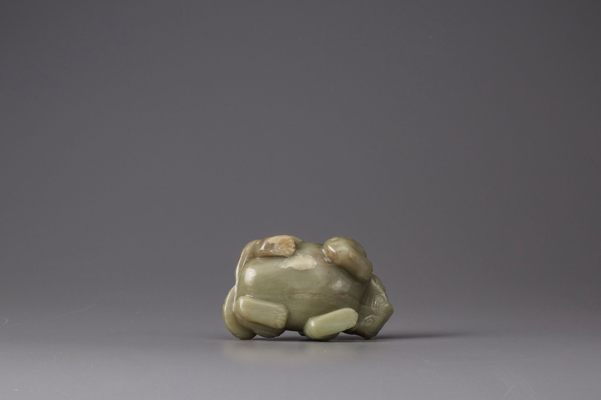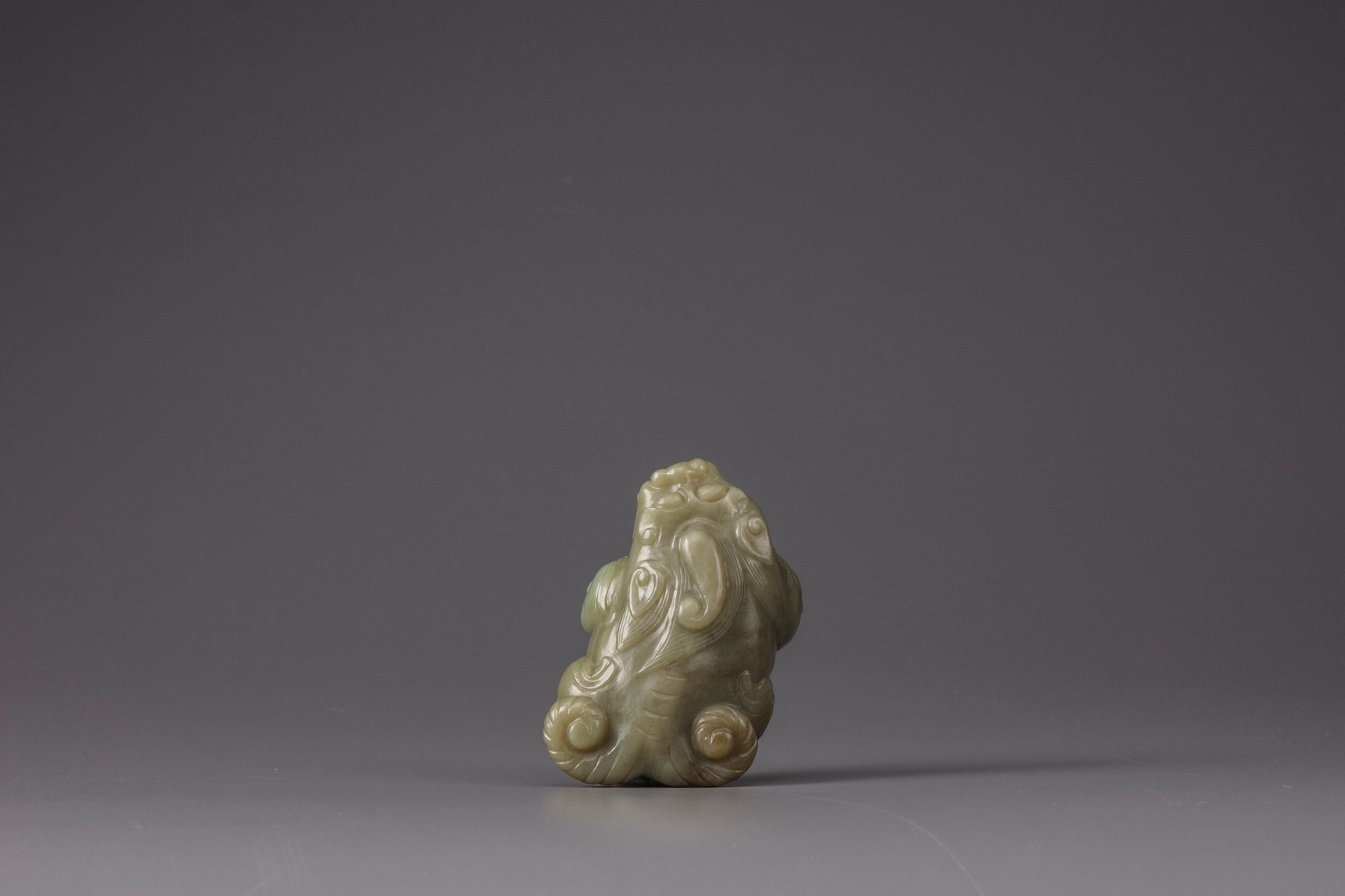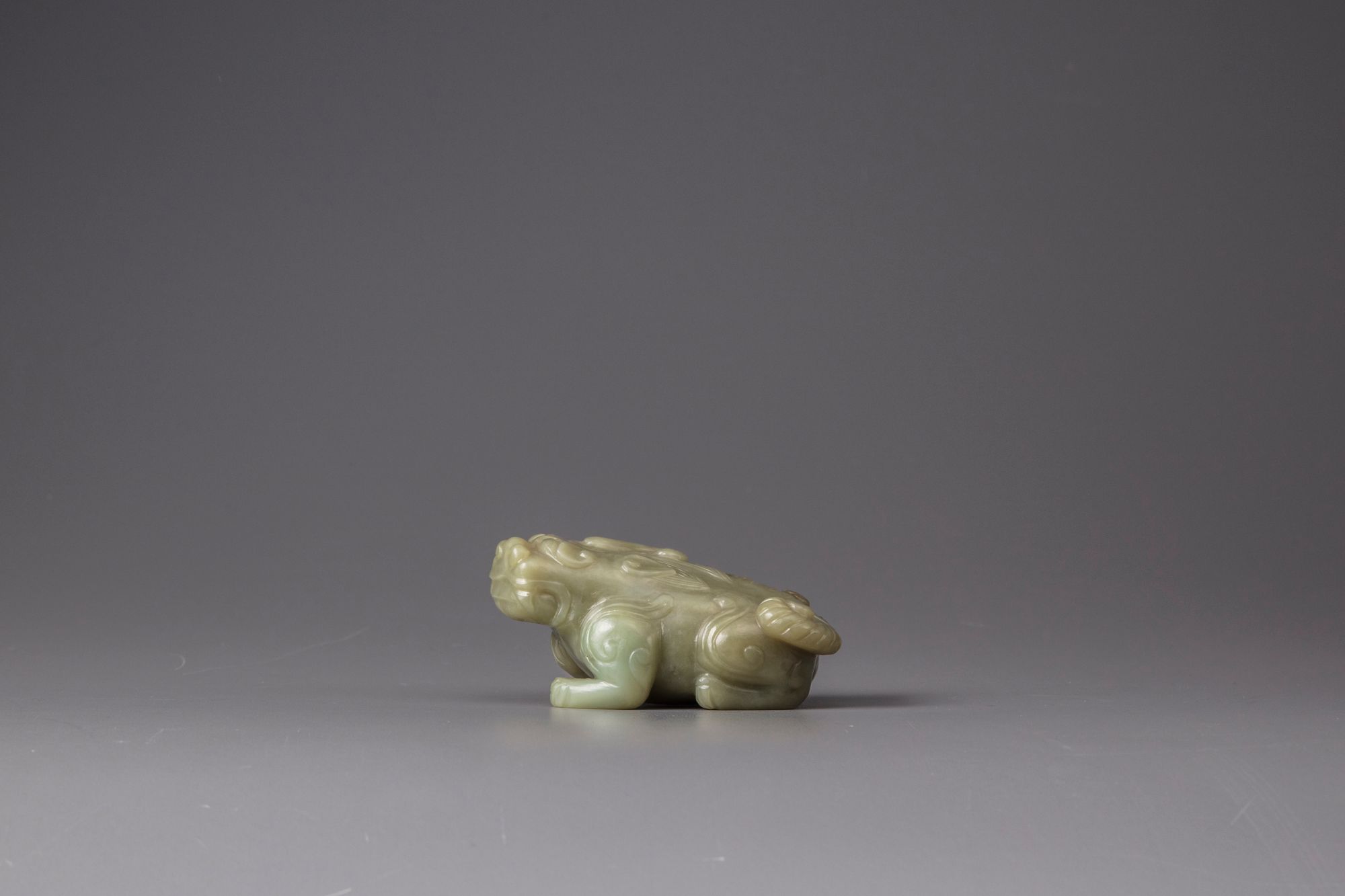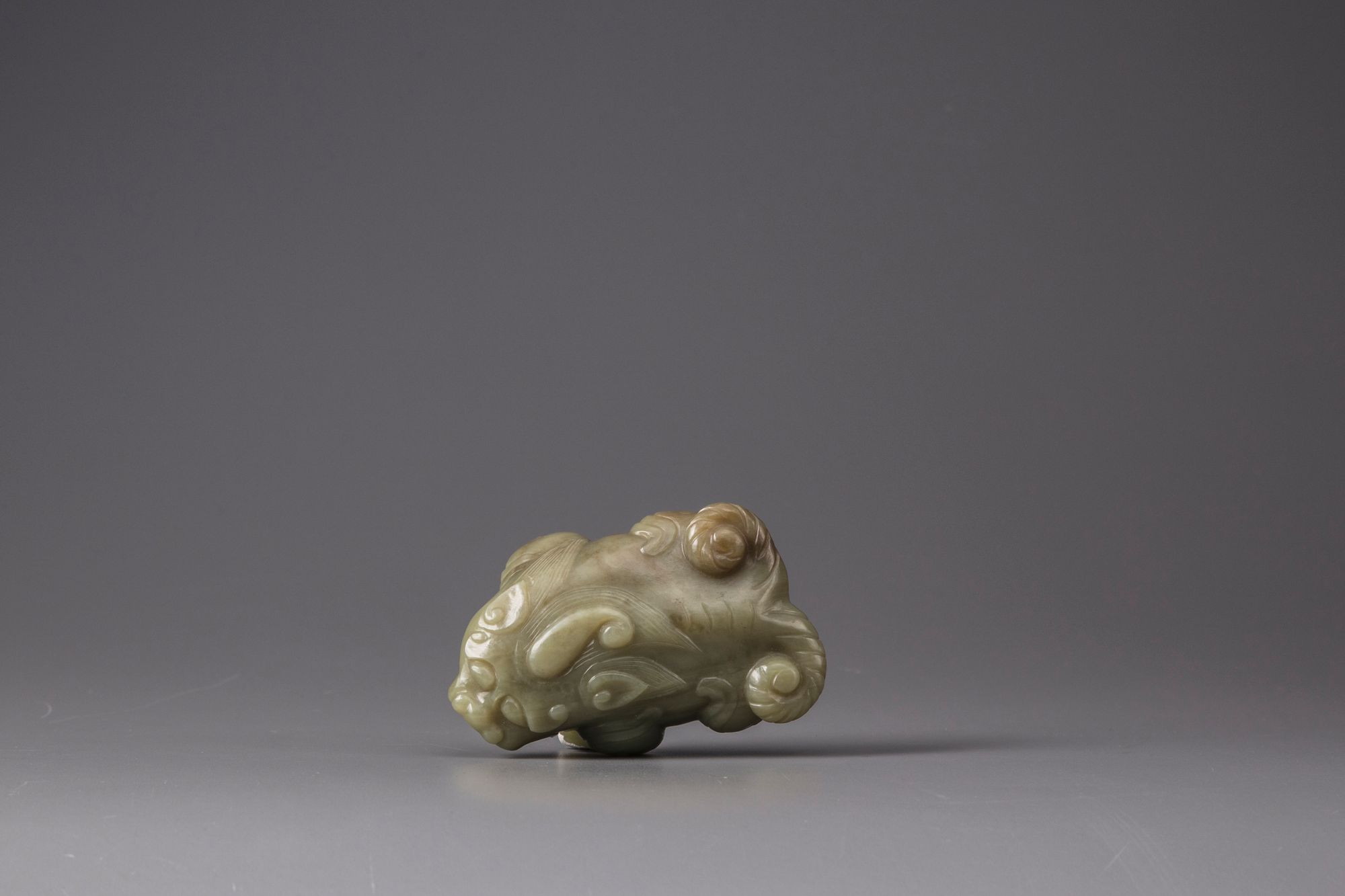 The mythical beast is carved crouching with its bifurcated tail resting on its haunches. Its maned head is carved with a single horn and ears flicked backwards. The stone is of an olive-green tone.