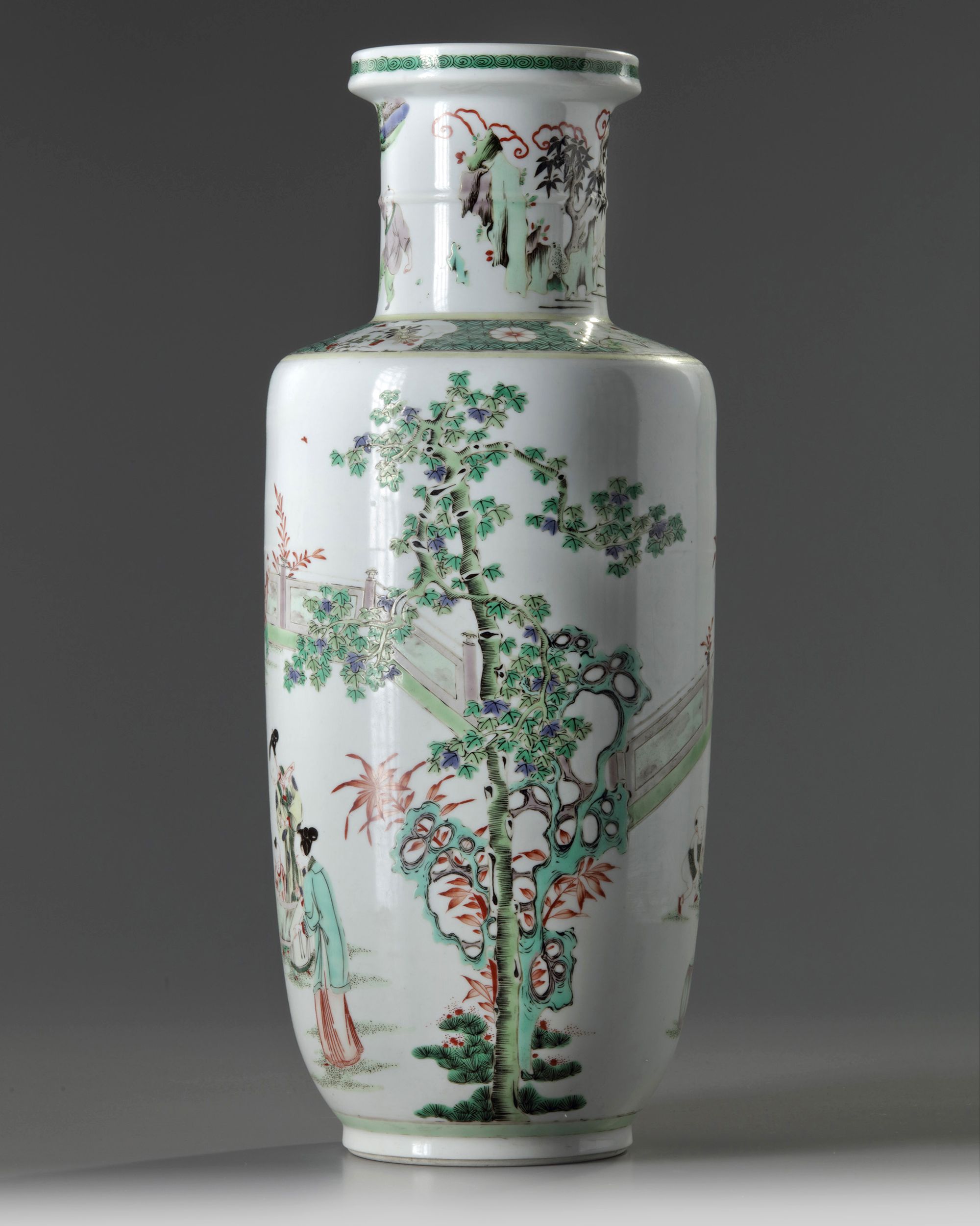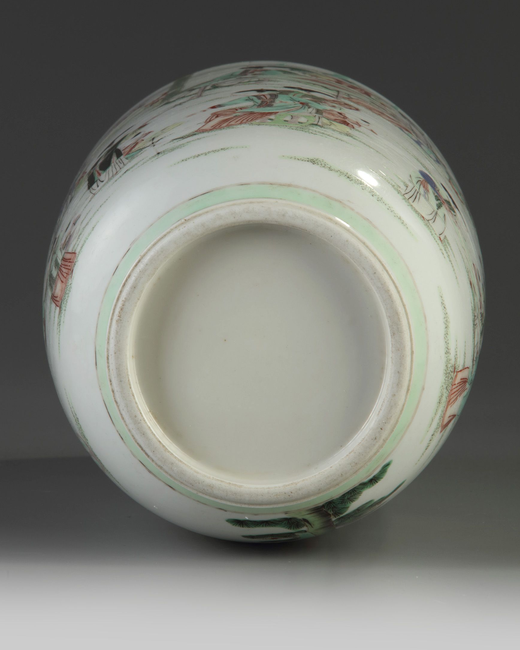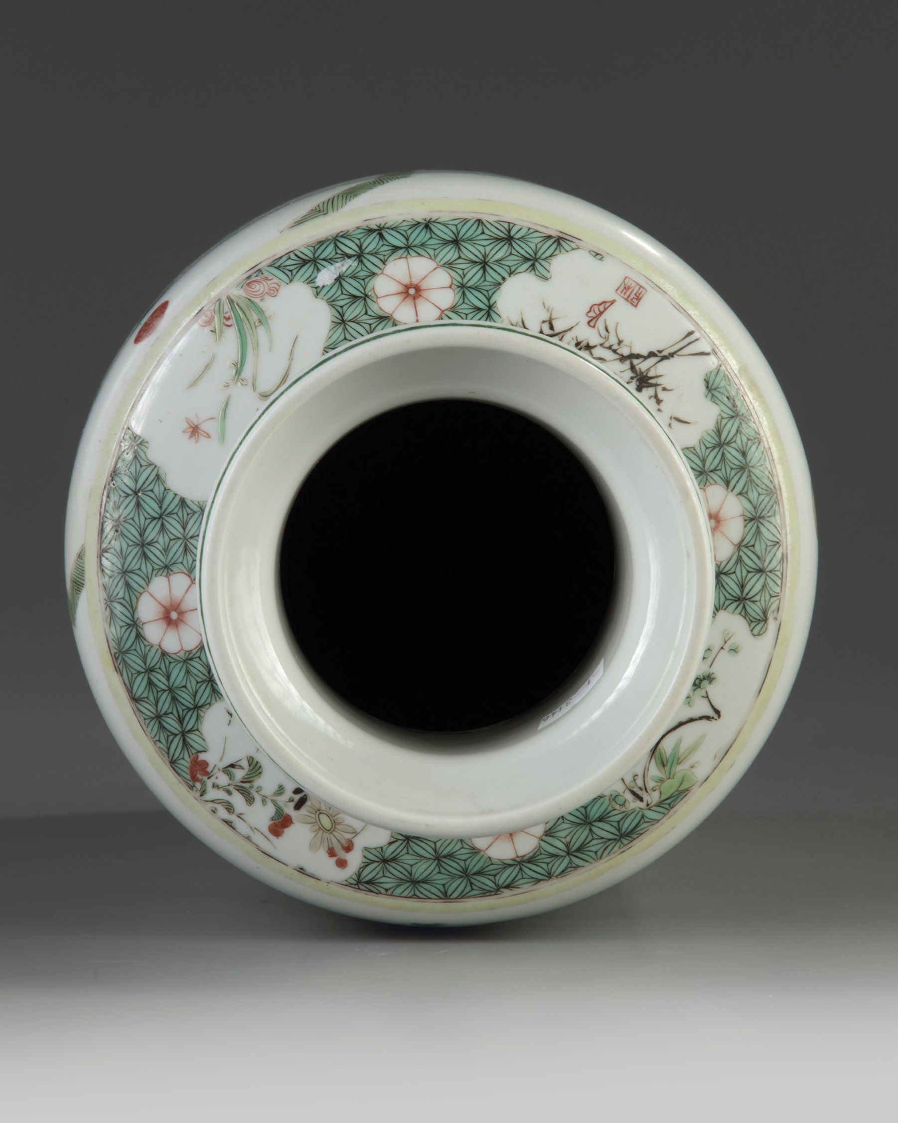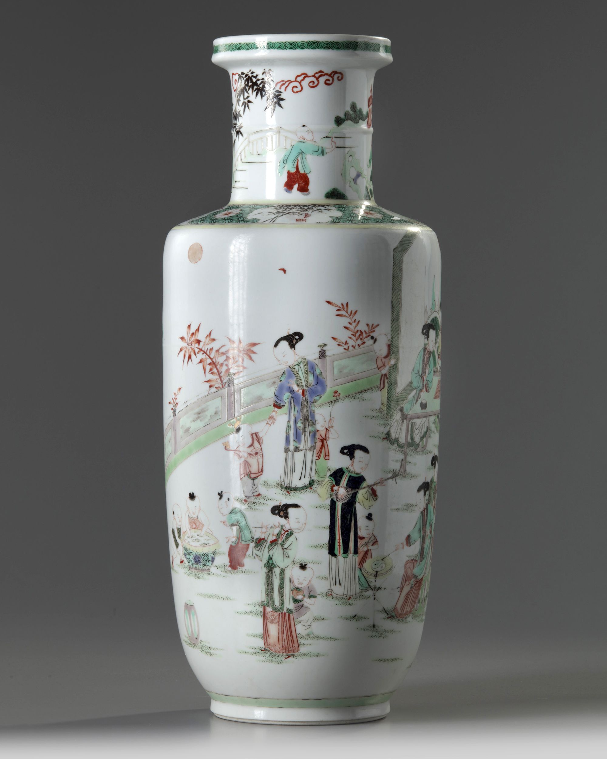The vase is decorated and gilt to the body with ladies at leisure with boys at play with flowers, toys, and instruments, all below a trellis band at the shoulder interspersed with shaped panels enclosing auspicious flowers, one signed 'Zhu ren', all below a band of further boys at play on the neck.