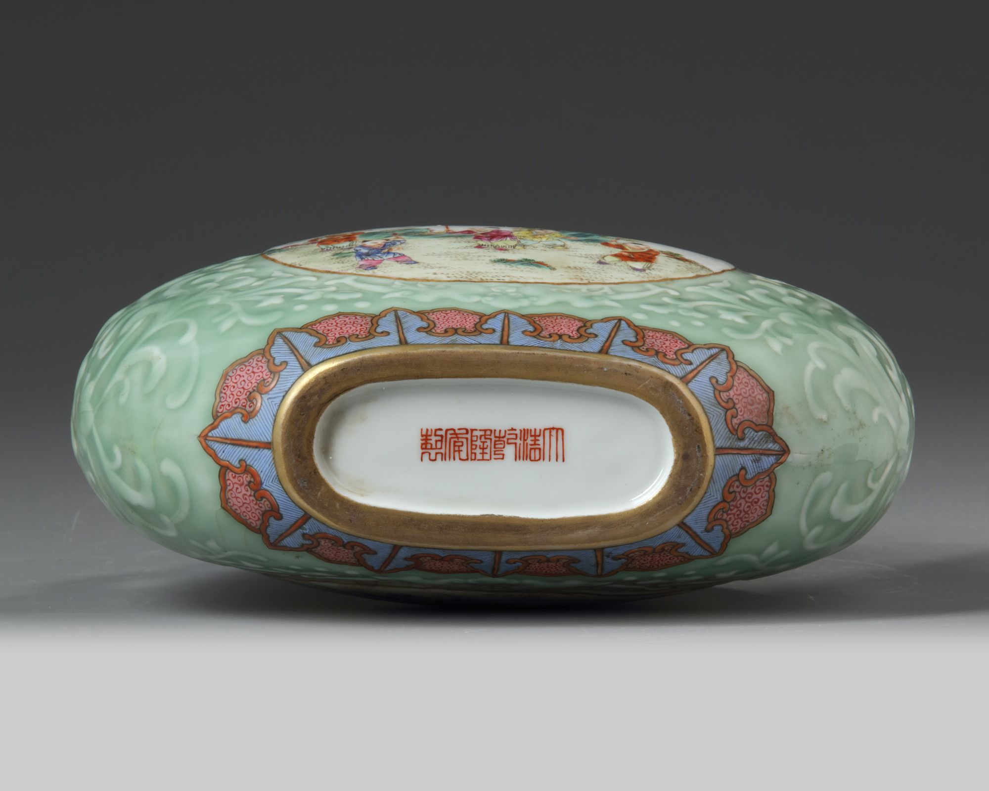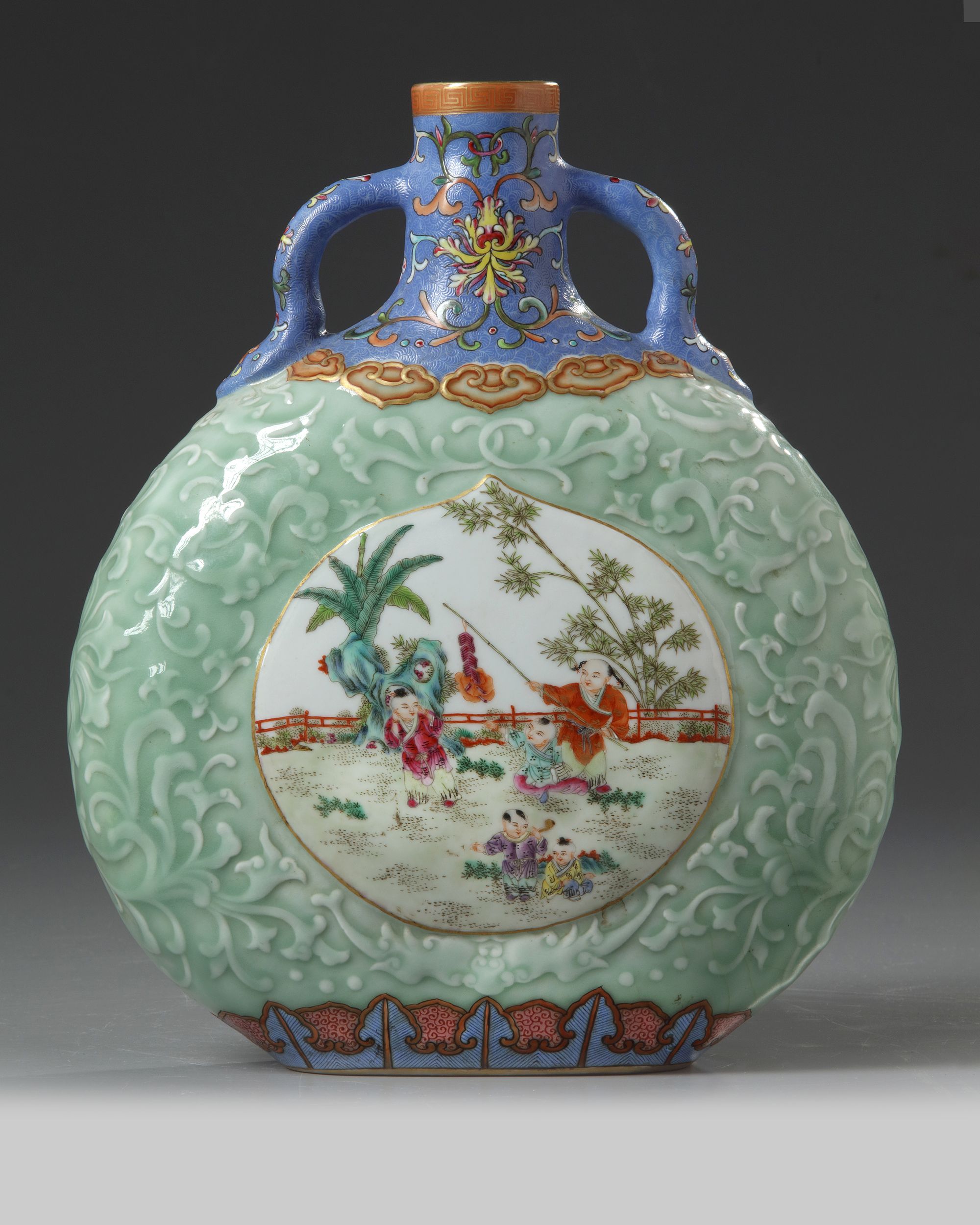 The moon flask is stylised with two ruyi head handles, decorated with a peach-shaped panel enclosing boys at play in a fenced garden. Further with lotus scrolls and Fu bats in low relief. All above an elongated upright band of ruyi heads to the base and another gilt band to the shoulder. The recessed base with a Qianlong seal mark.