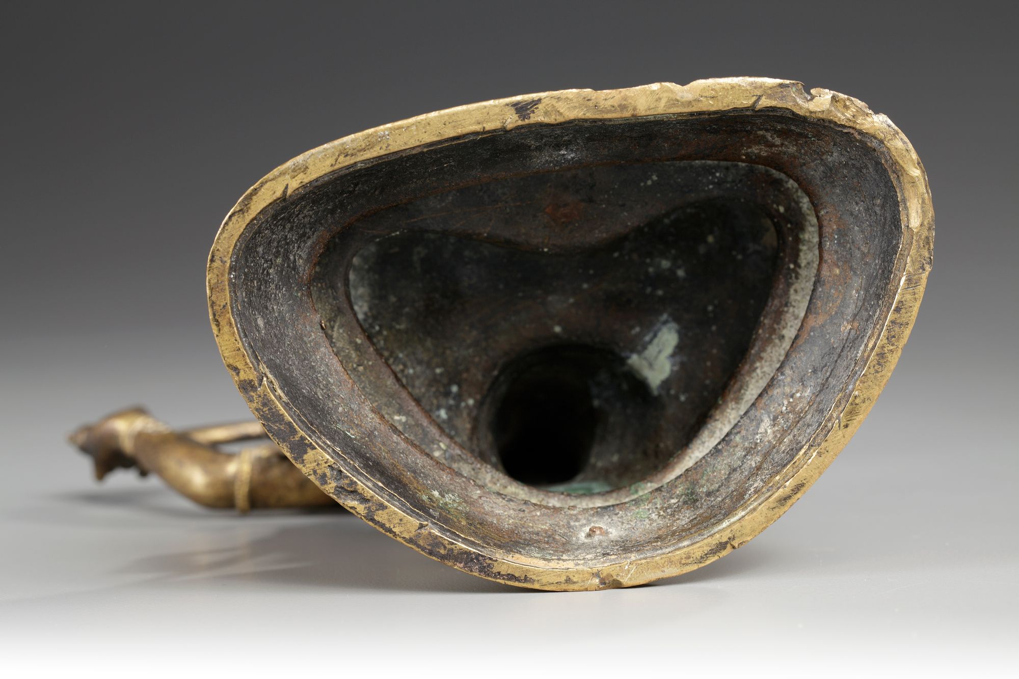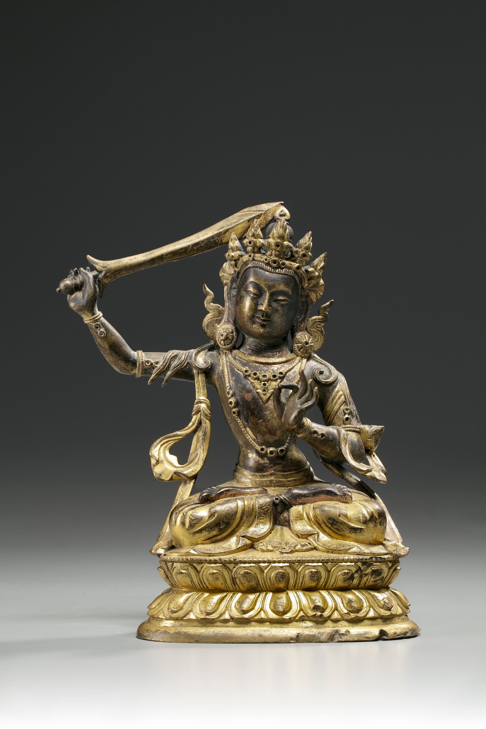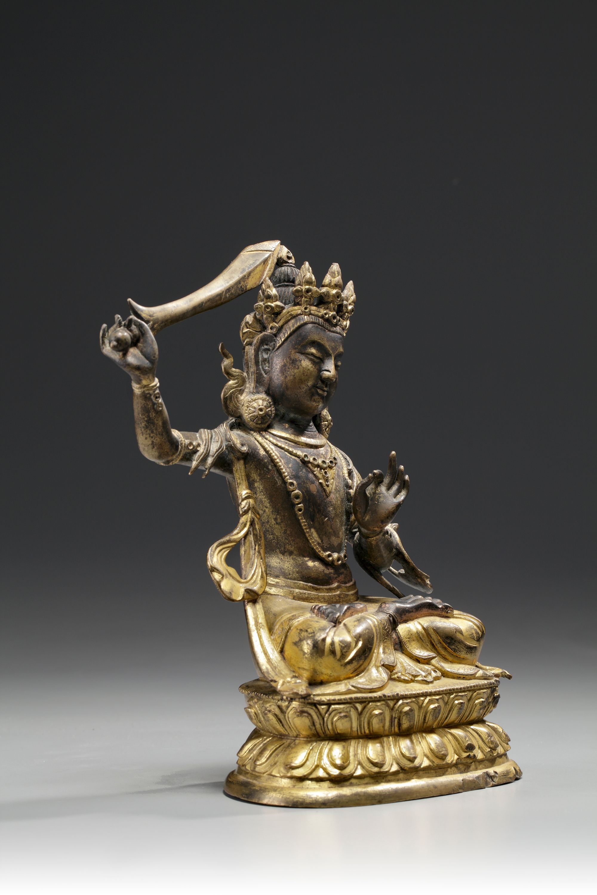 Seated on a lotus base, wearing pleated dhoti, ornaments, his face with serene expression, his hairdress combed in a chignon and topped by a stupa and set in front with a five-leaf tiara.