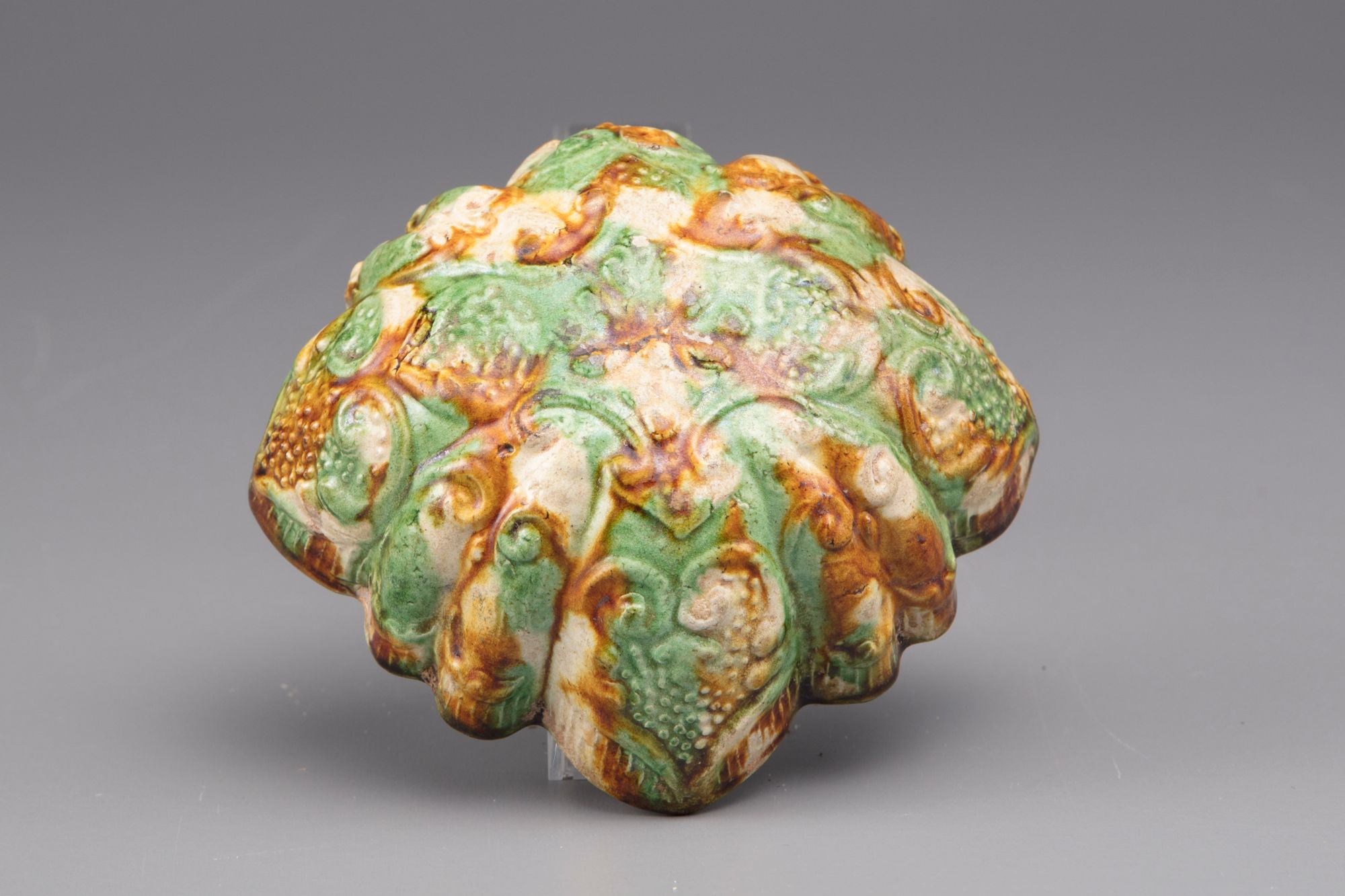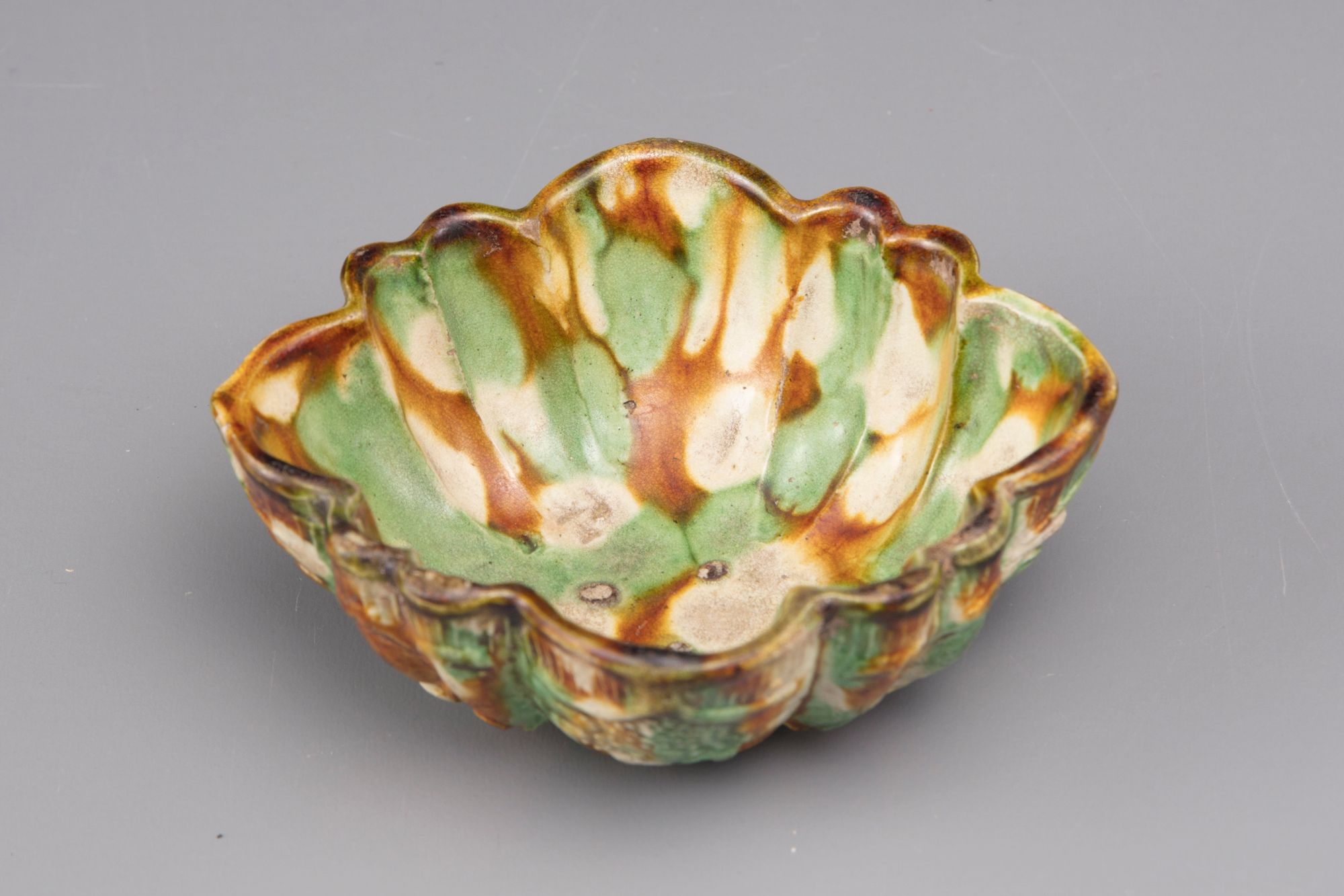 Molded bowl with a floral pattern reserved on a granular ground, splash-glazed in green, amber and cream.