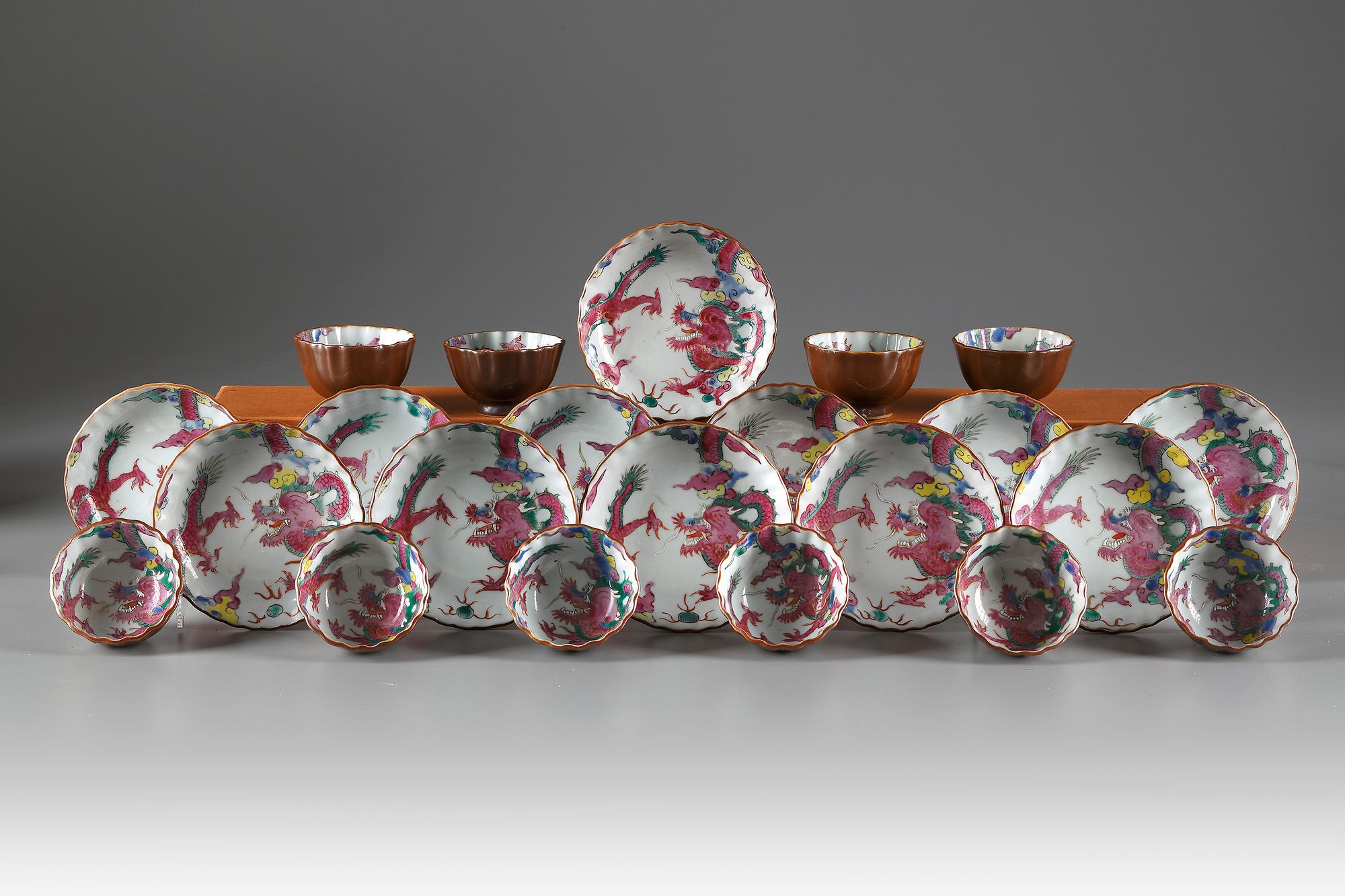 The interiors decorated in a vibrant famille rose palette depicting a four clawed dragon chasing the flaming pearl, the exteriors glazed in brown.