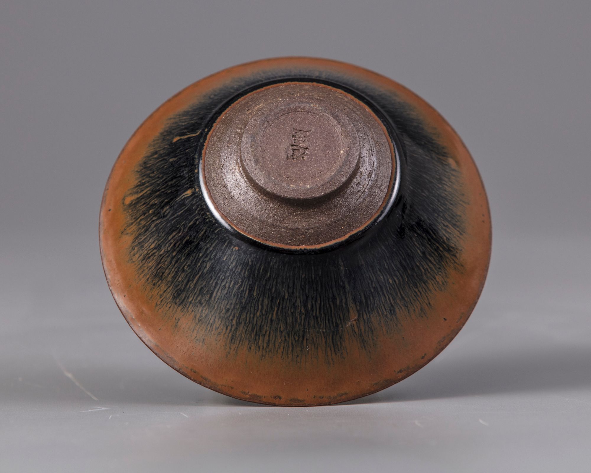 The bowl is decorated with a dark, lustrous glaze with brown russet streaks trailing to the centre imitating the fur of a hare.