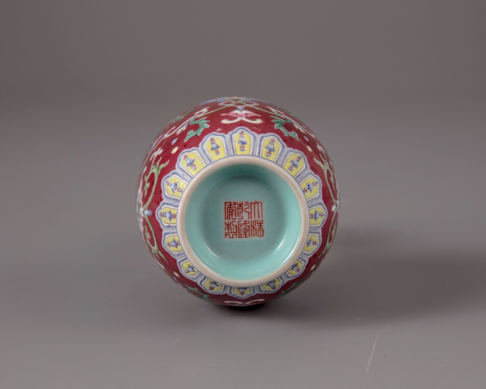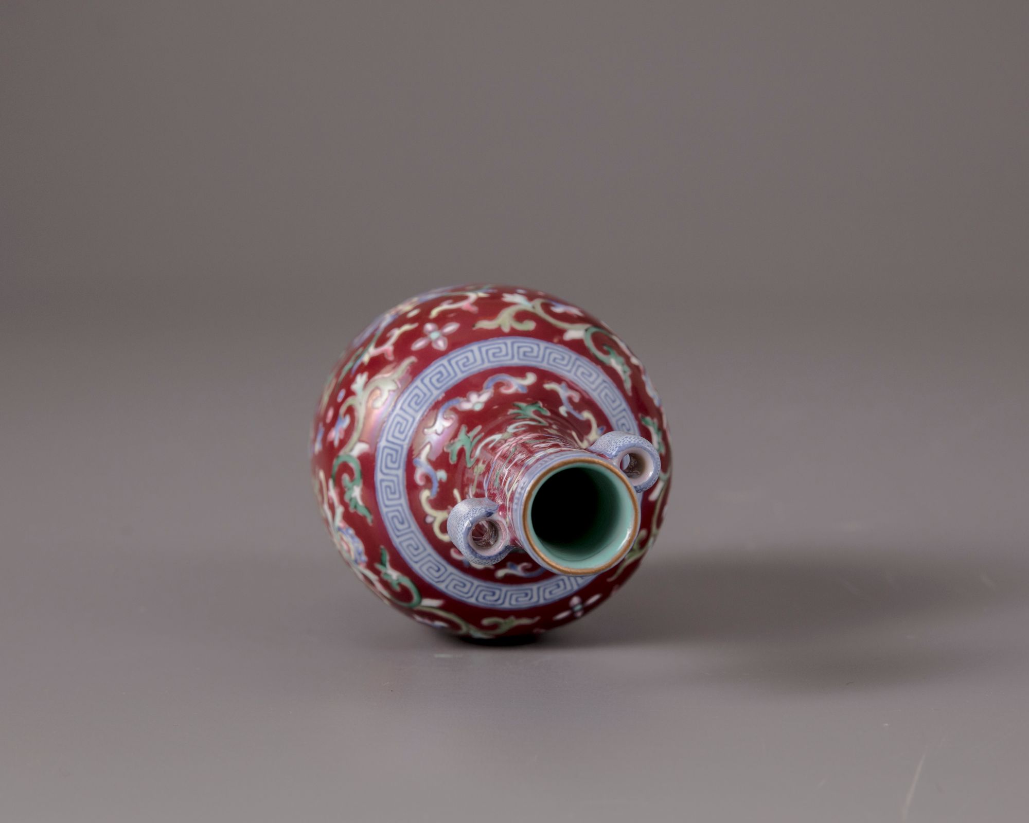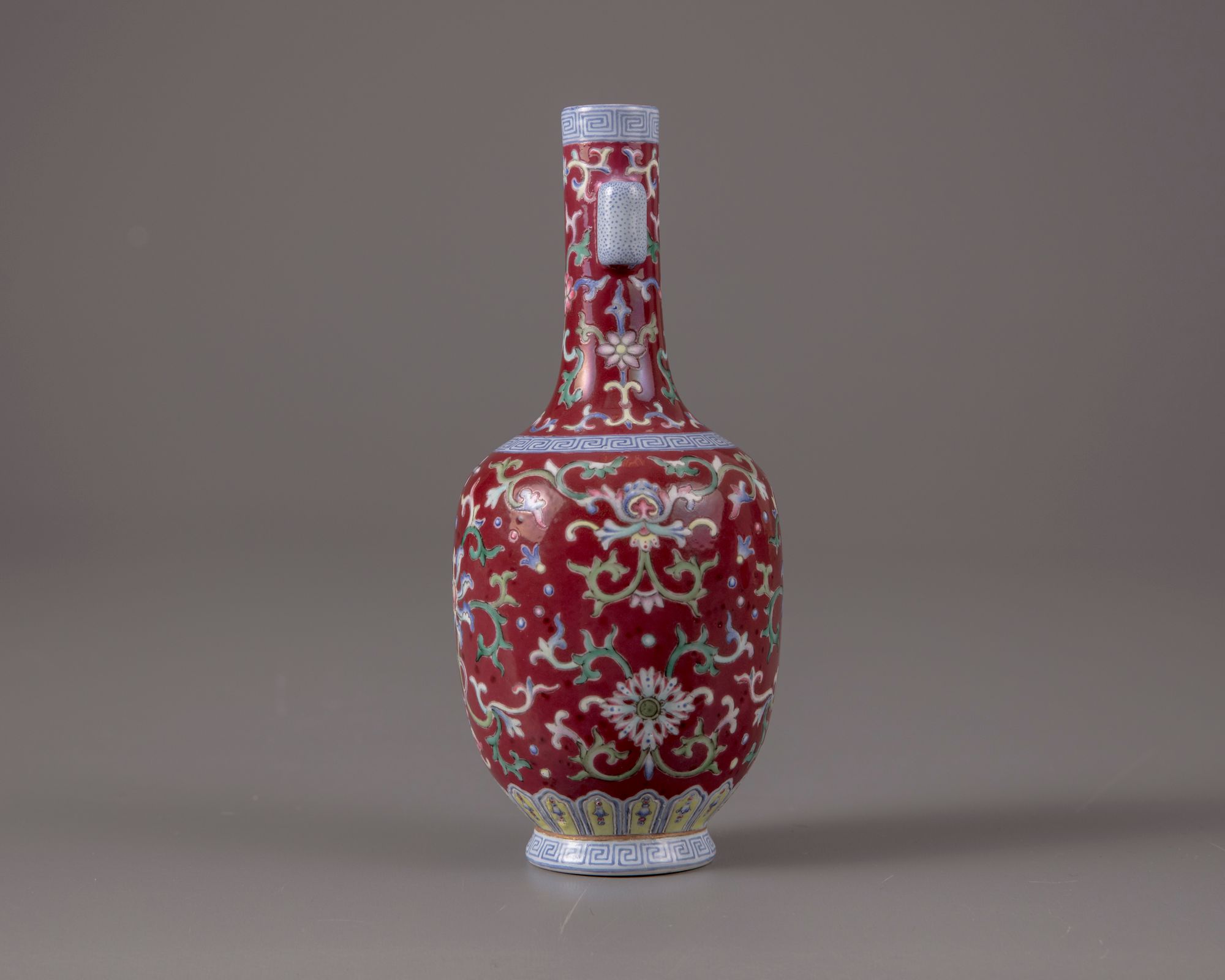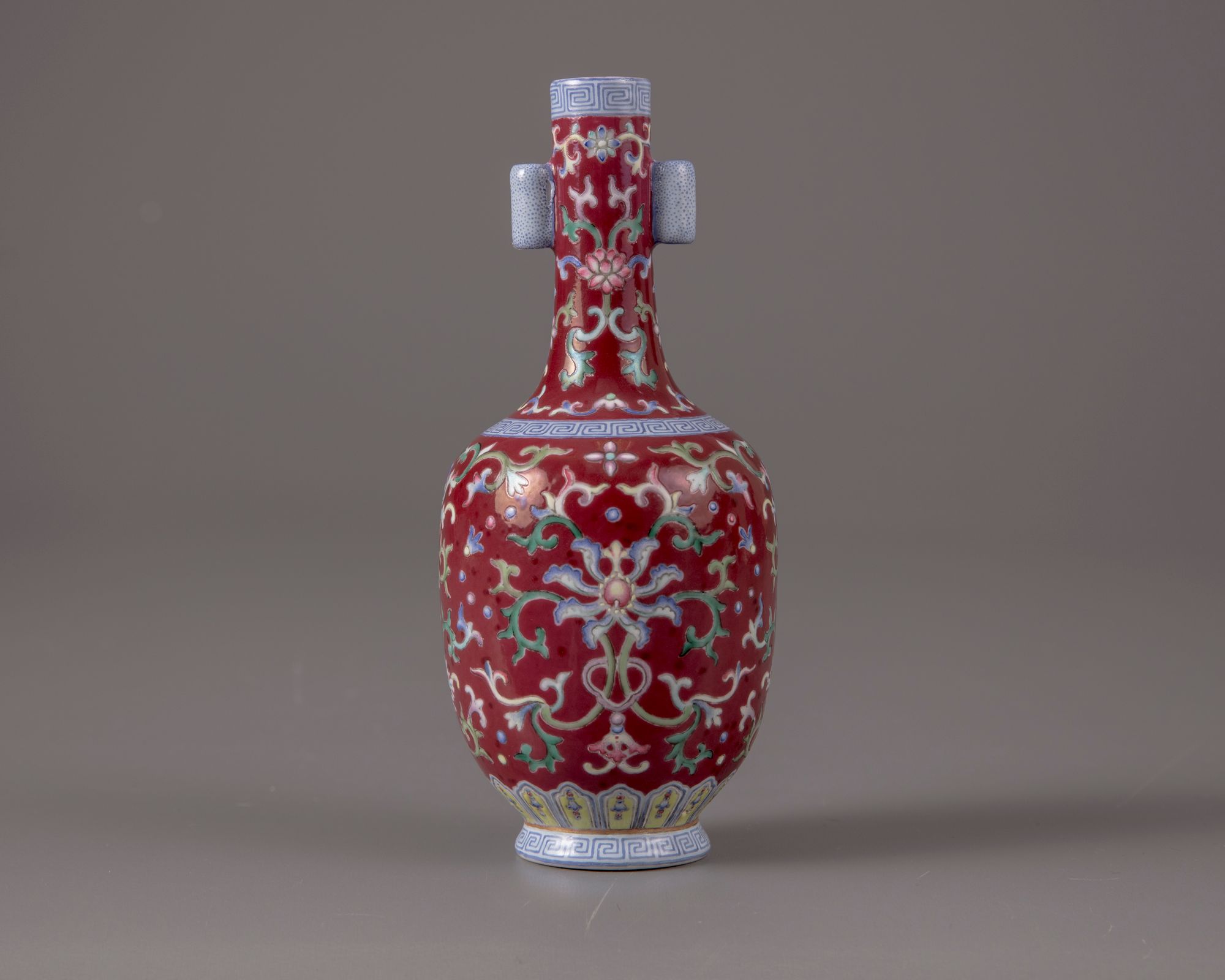 The bottle vase is decorated with two openwork cylindrical handles, lotus scrolls to the body and the neck, separated by a key fret chain to the shoulder and the rim. The base with a petal lappet border and a key fret chain. The bottom with a Qianlong seal mark.