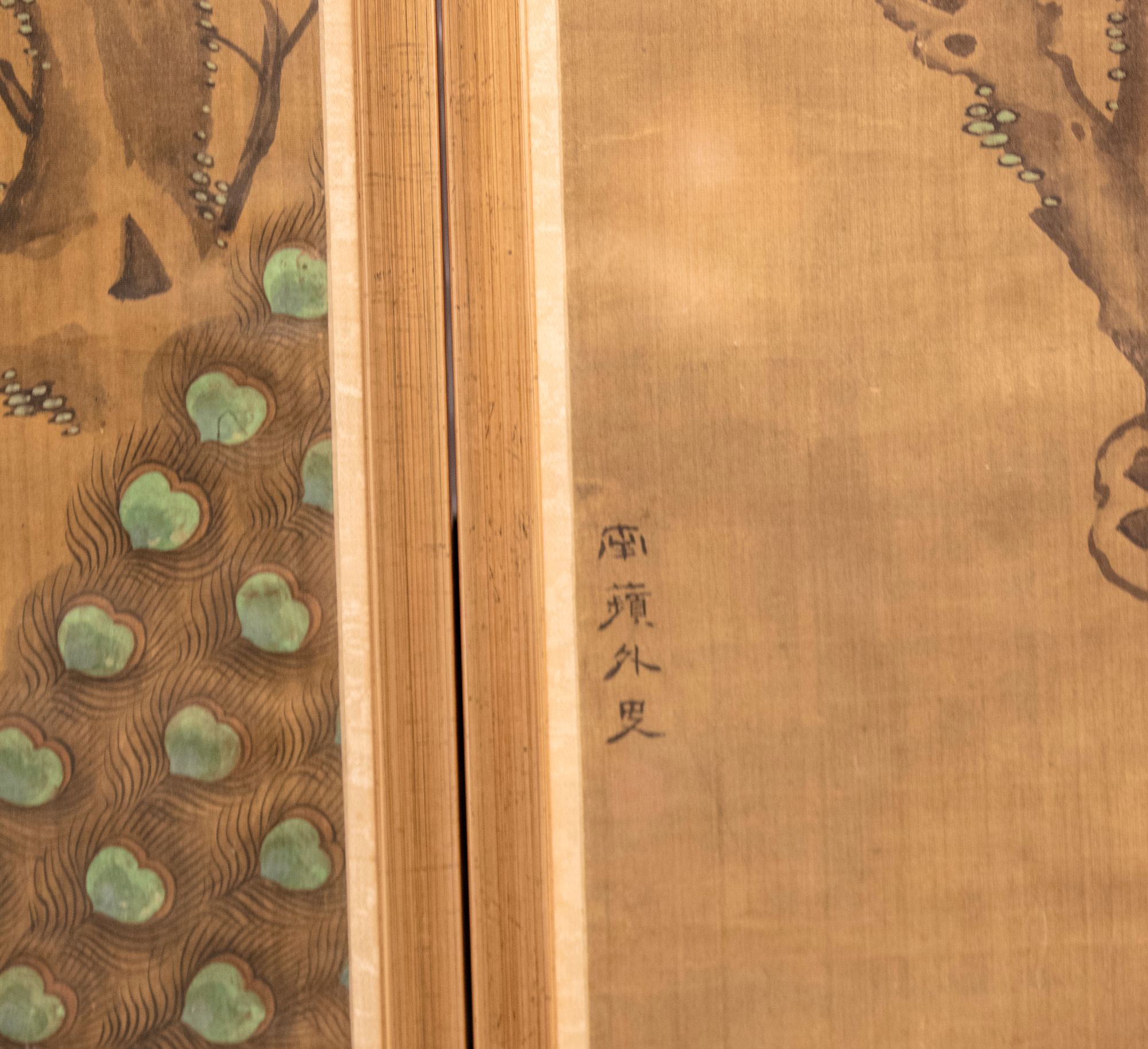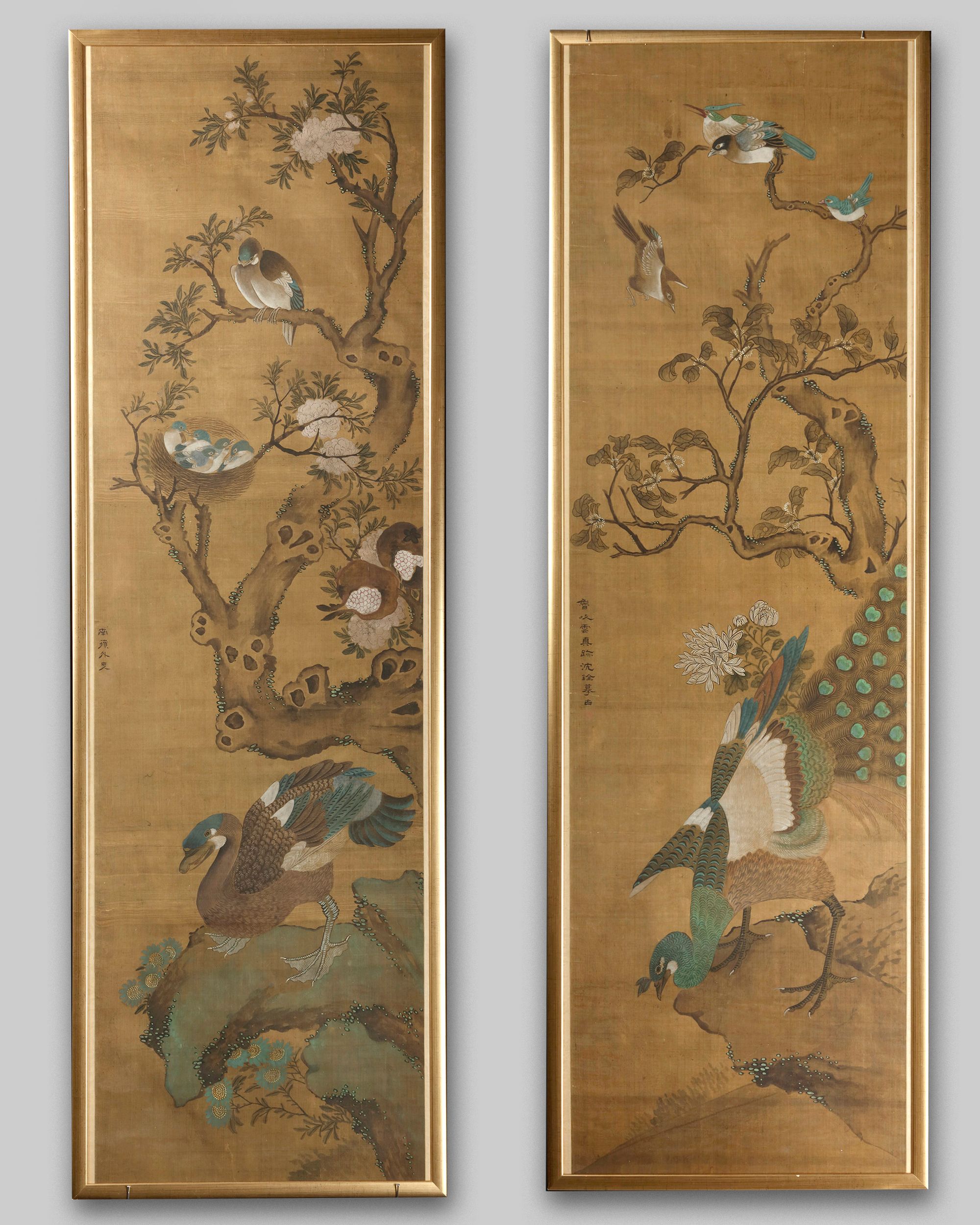 Paintings depicting a colourful peacock with birds perched on tree branches & a duck and a bird perched on a tree watching over its nest.