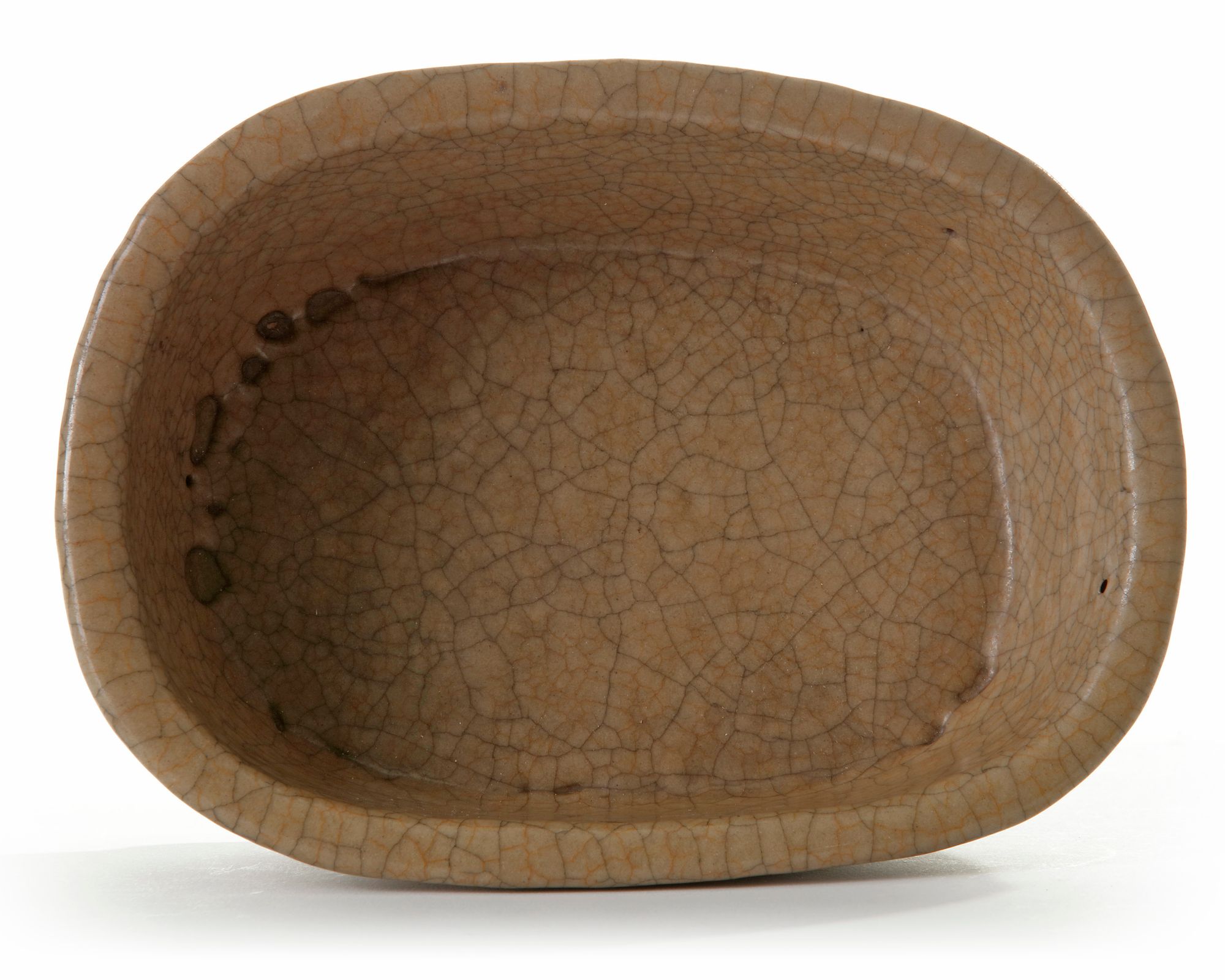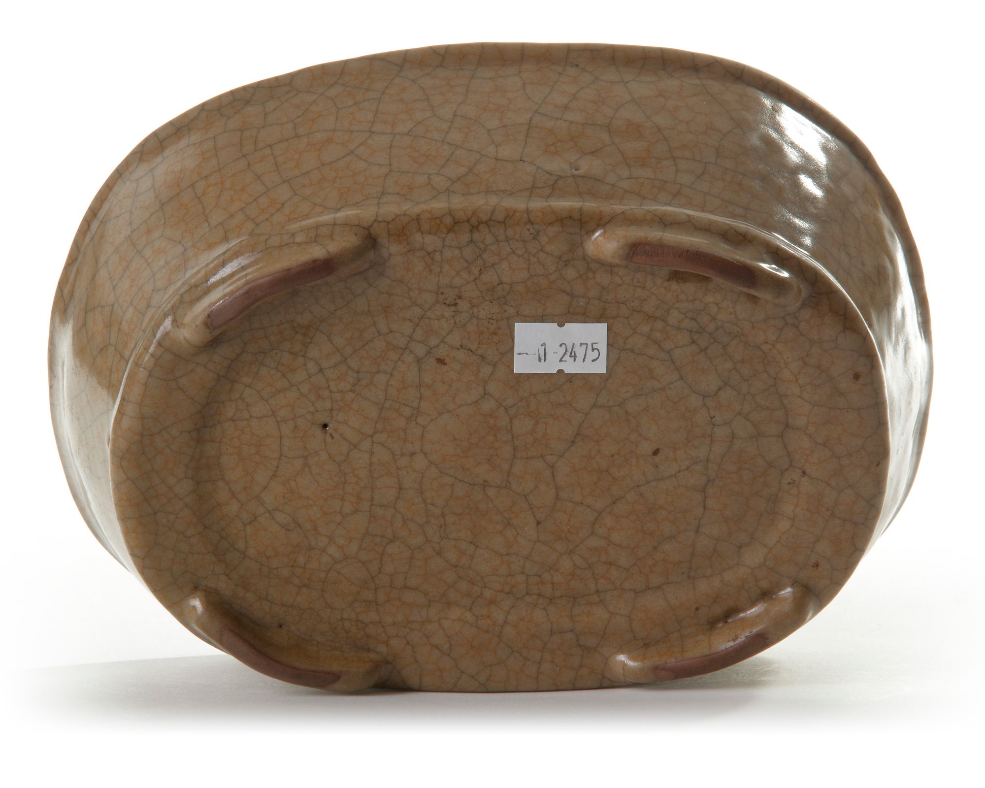 The oval-shaped jardinière stands on four short feet. It is covered overall in a brown glaze suffused with various crackles.