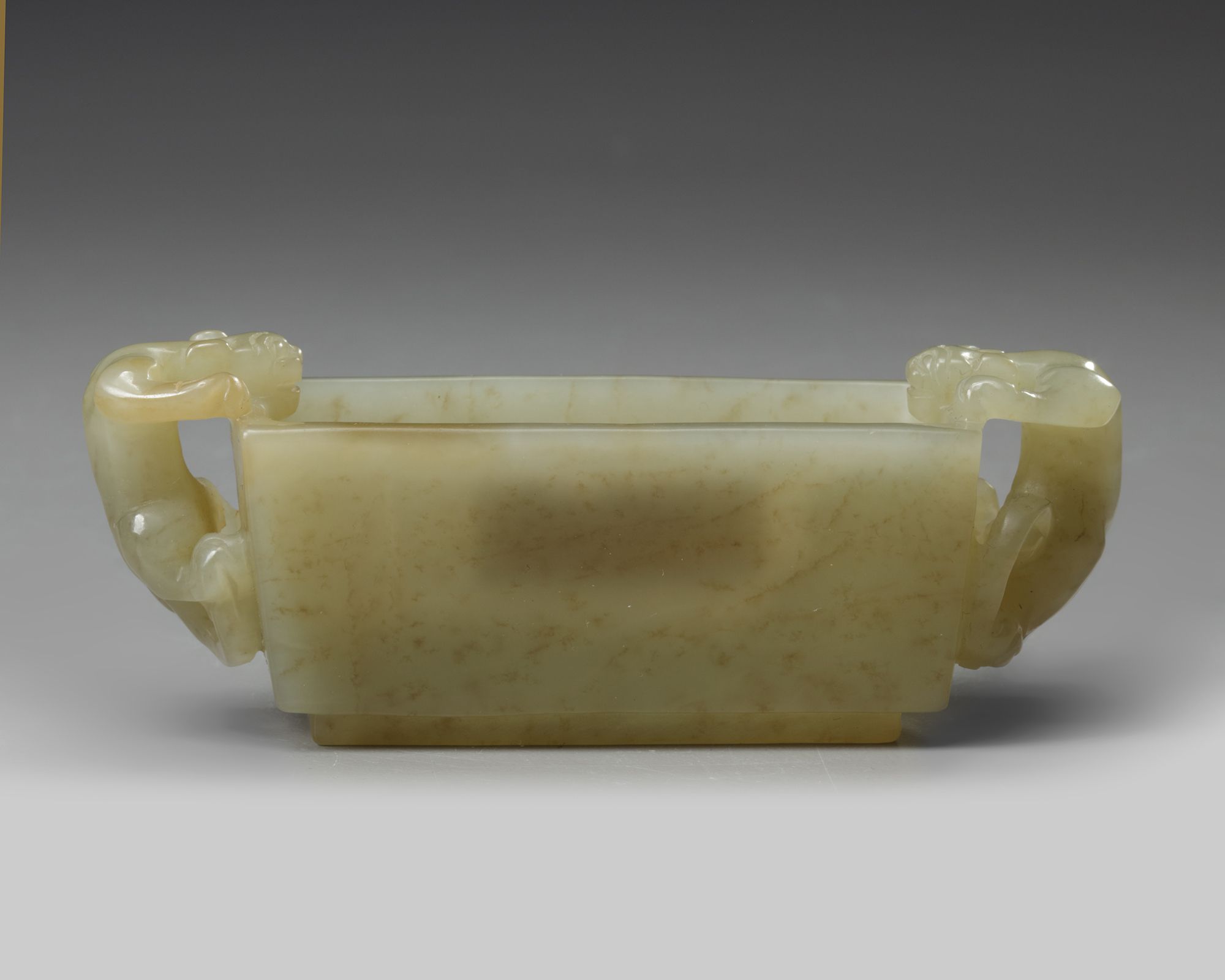 A small jade rectangular bowl, the tapering sides rising from a short spreading foot, with articulated handles in the form of 'climbing' chilong.