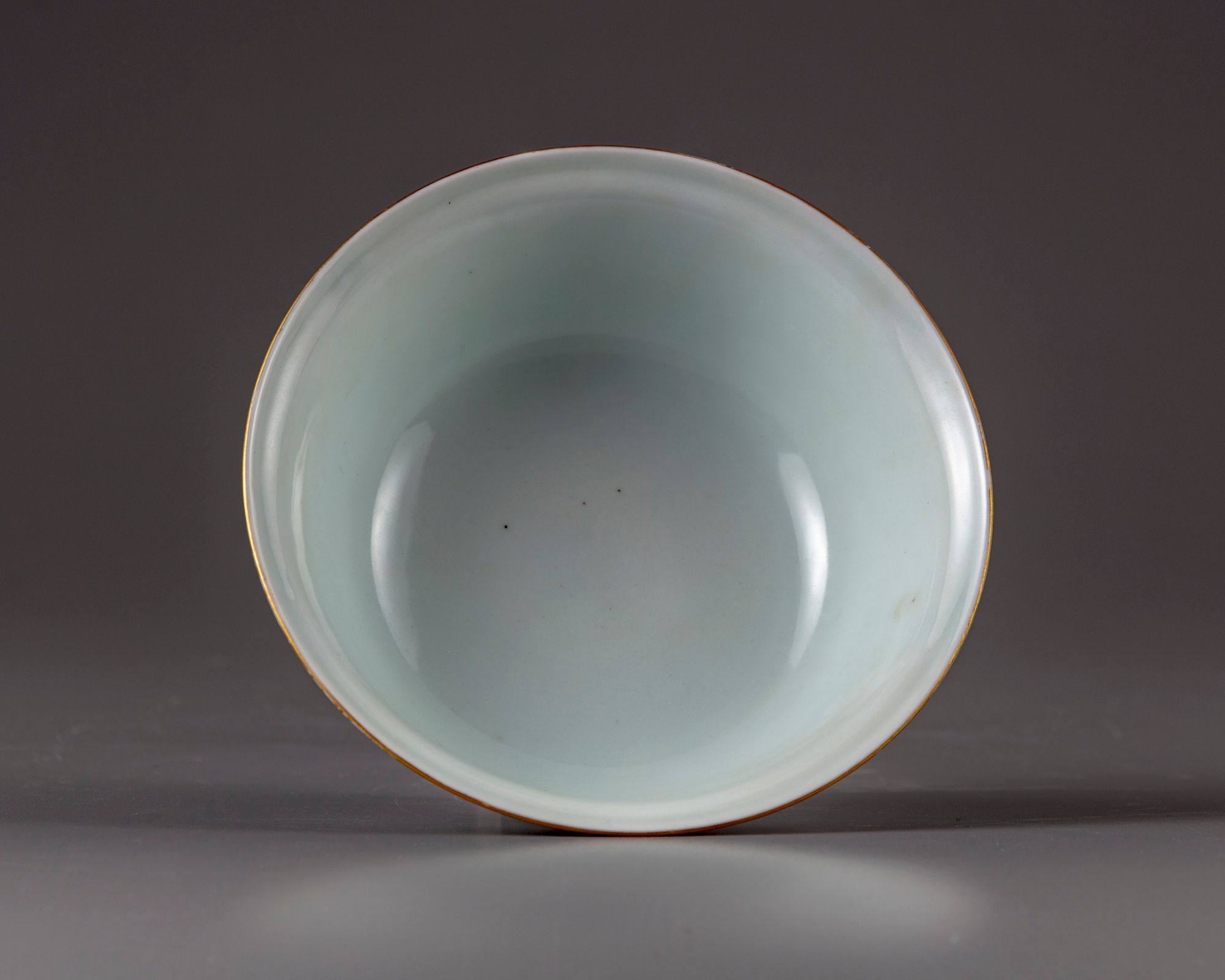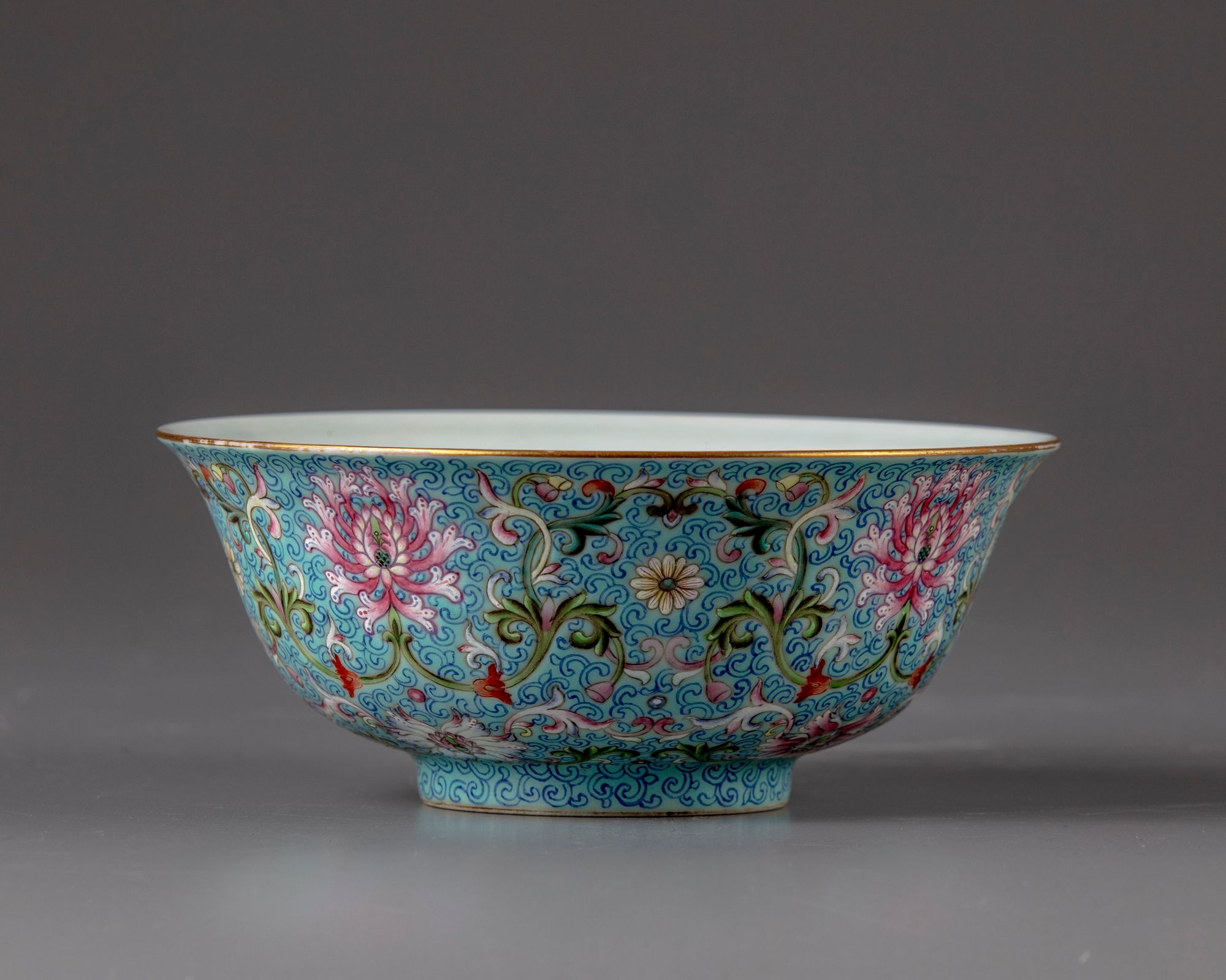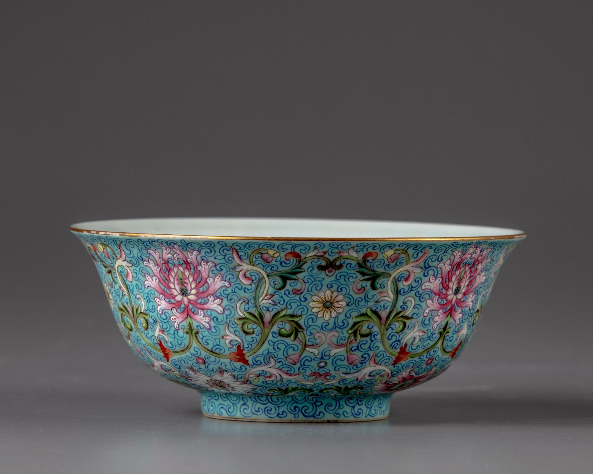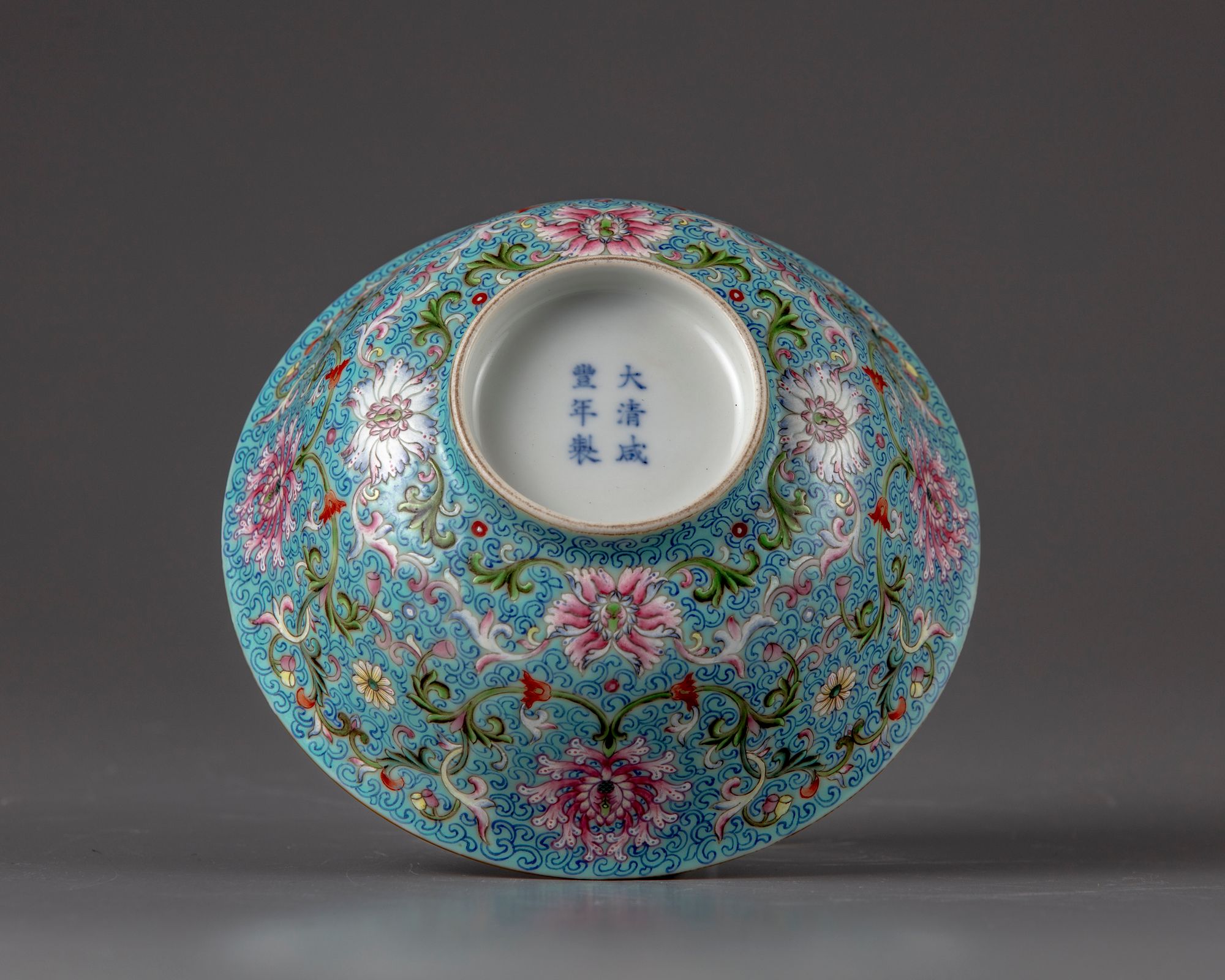 Standing on a small base, with deep sides and flaring mouth, decorated to the exterior with lotus heads, buds and foliage scrolls on a turquoise glazed ground.The bottom with a Xianfeng six character mark.