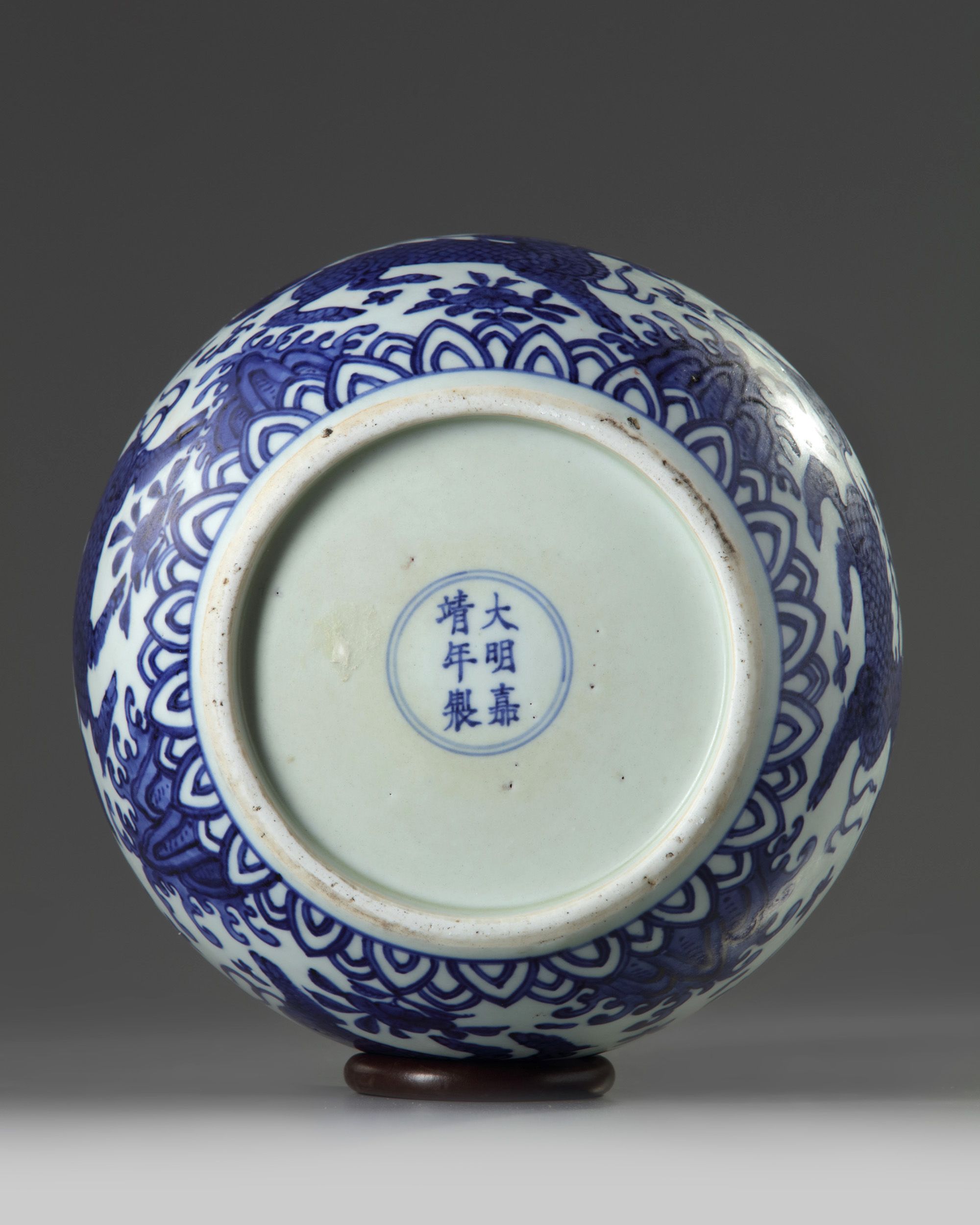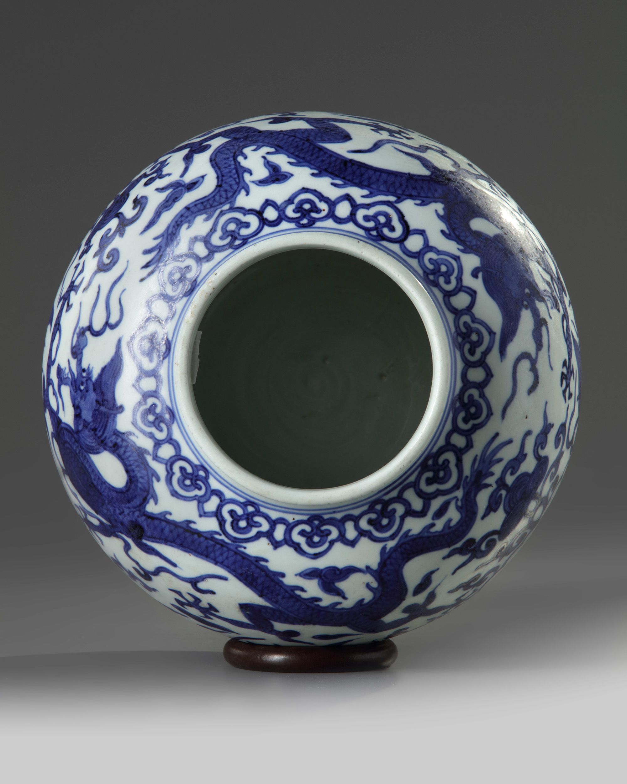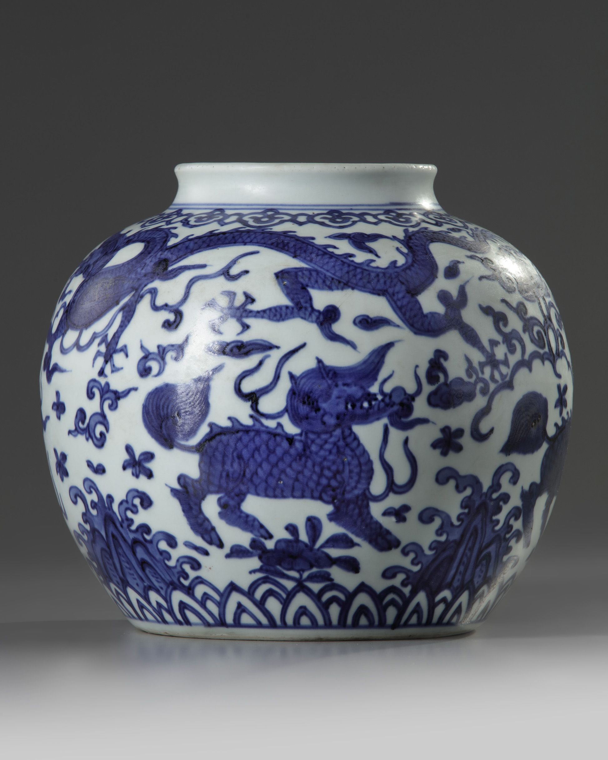 The jar is decorated in the round with five-clawed dragons in flight above qilin standing above waves crashing against rocks, all amongst lingzhi sprays and below a ruyi head band to the rim. The base with an apocryphal Jiajing mark.