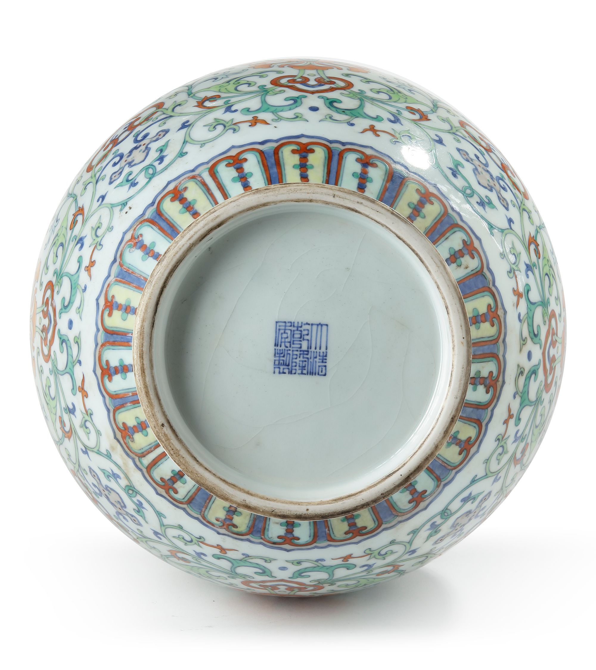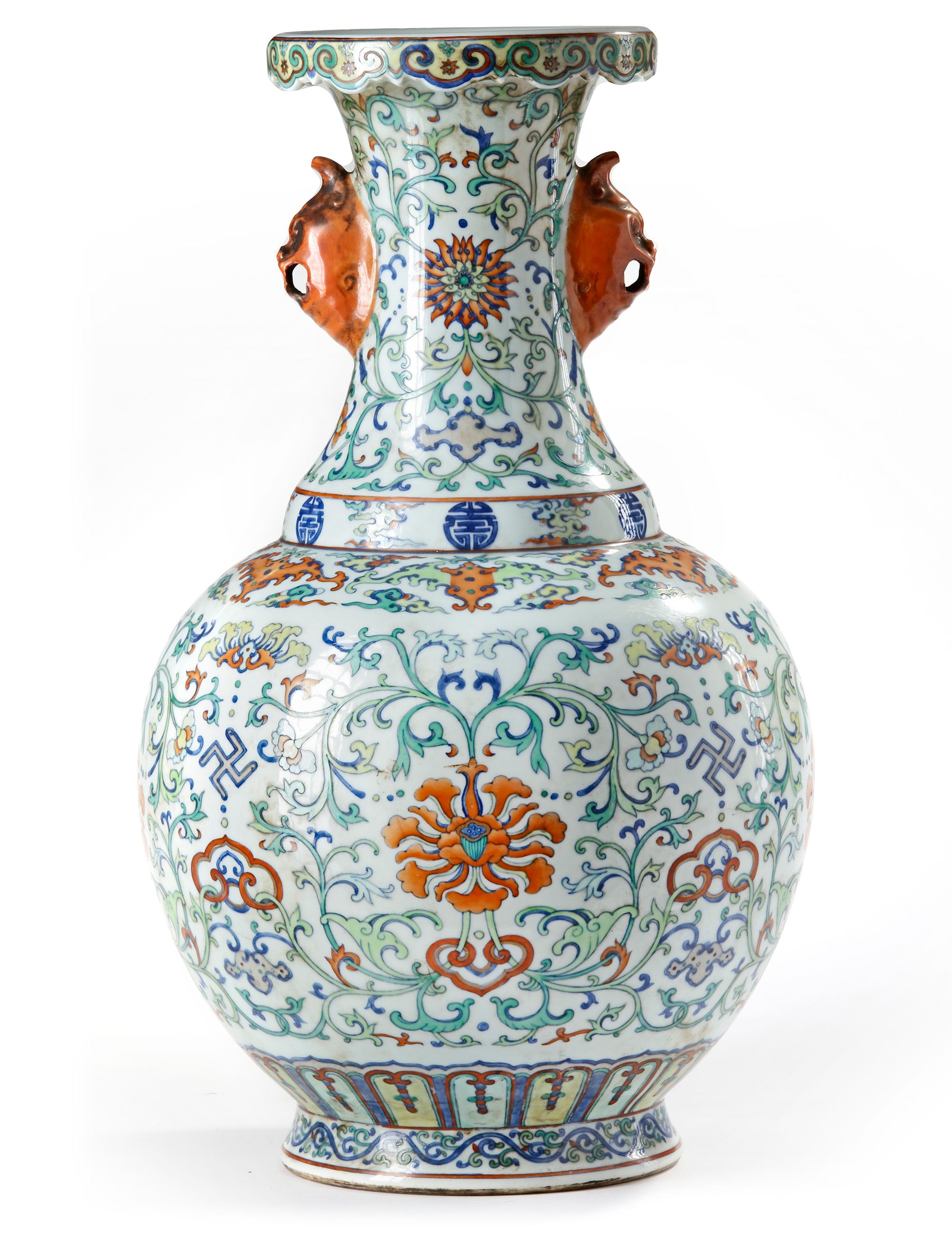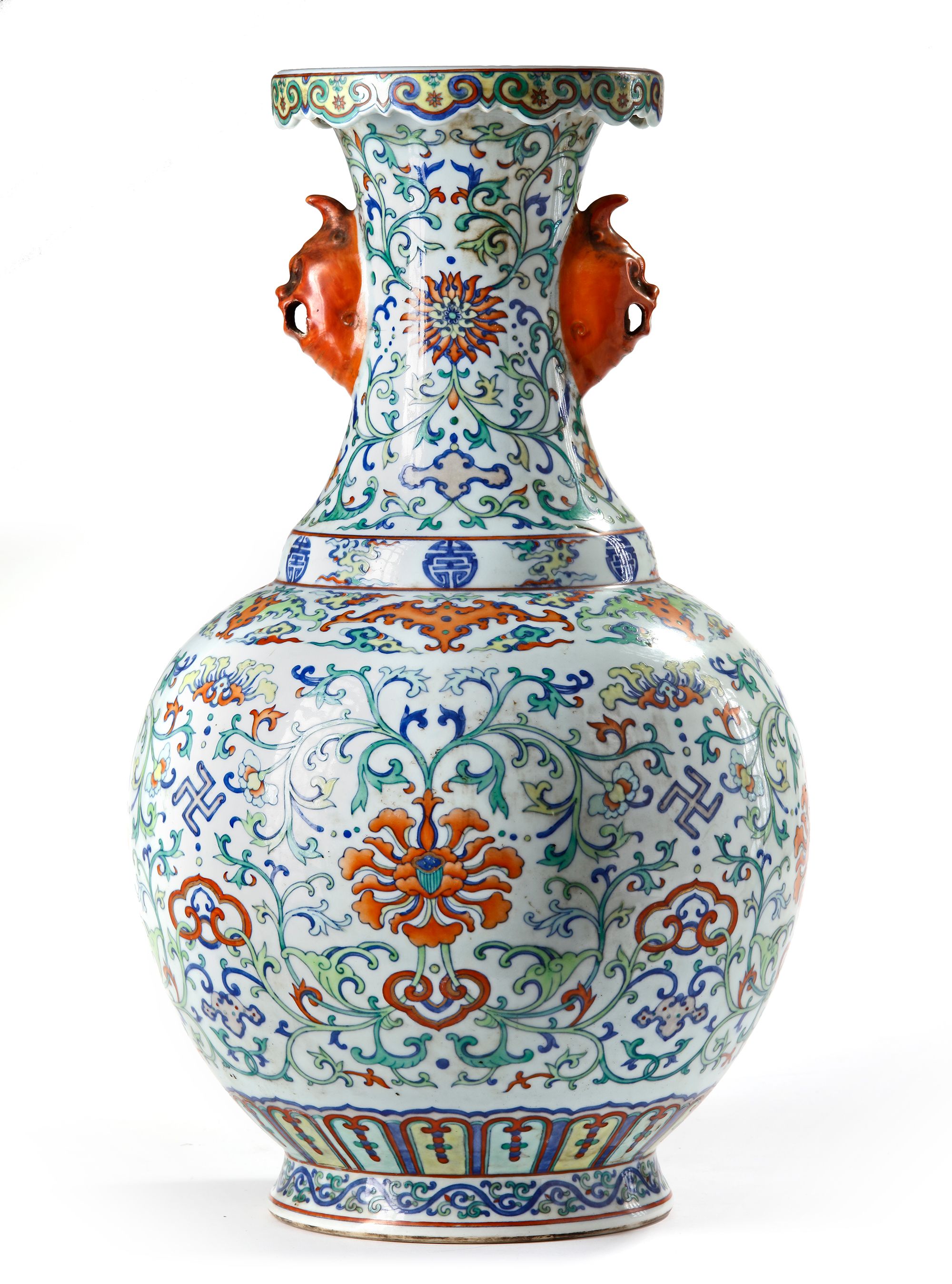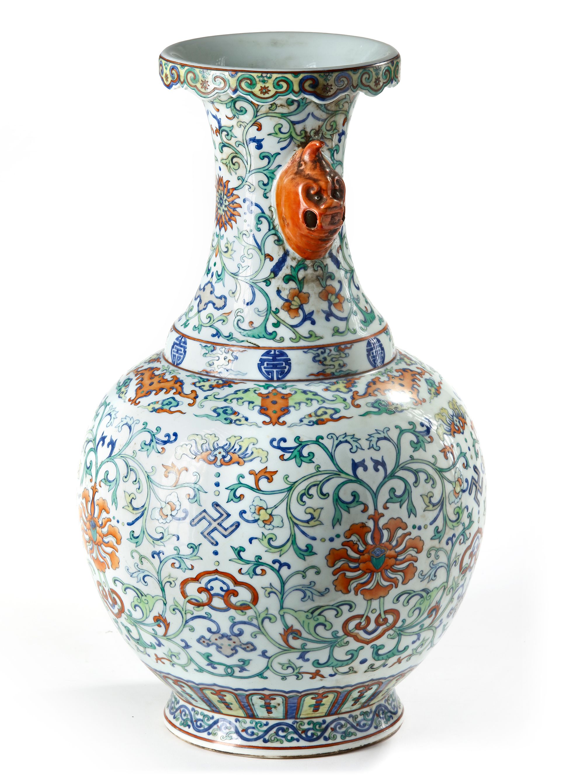 Decorated with large lotus flowers, wan-symbols, ruyi-heads, bats and clouds amidst scrolling lotus vines. The neck with two mythical beast handles, the rim folded and lobed with ruyi-heads. With an underglaze blue apocryphal Qianlong seal-mark to the base. 48 cm high.