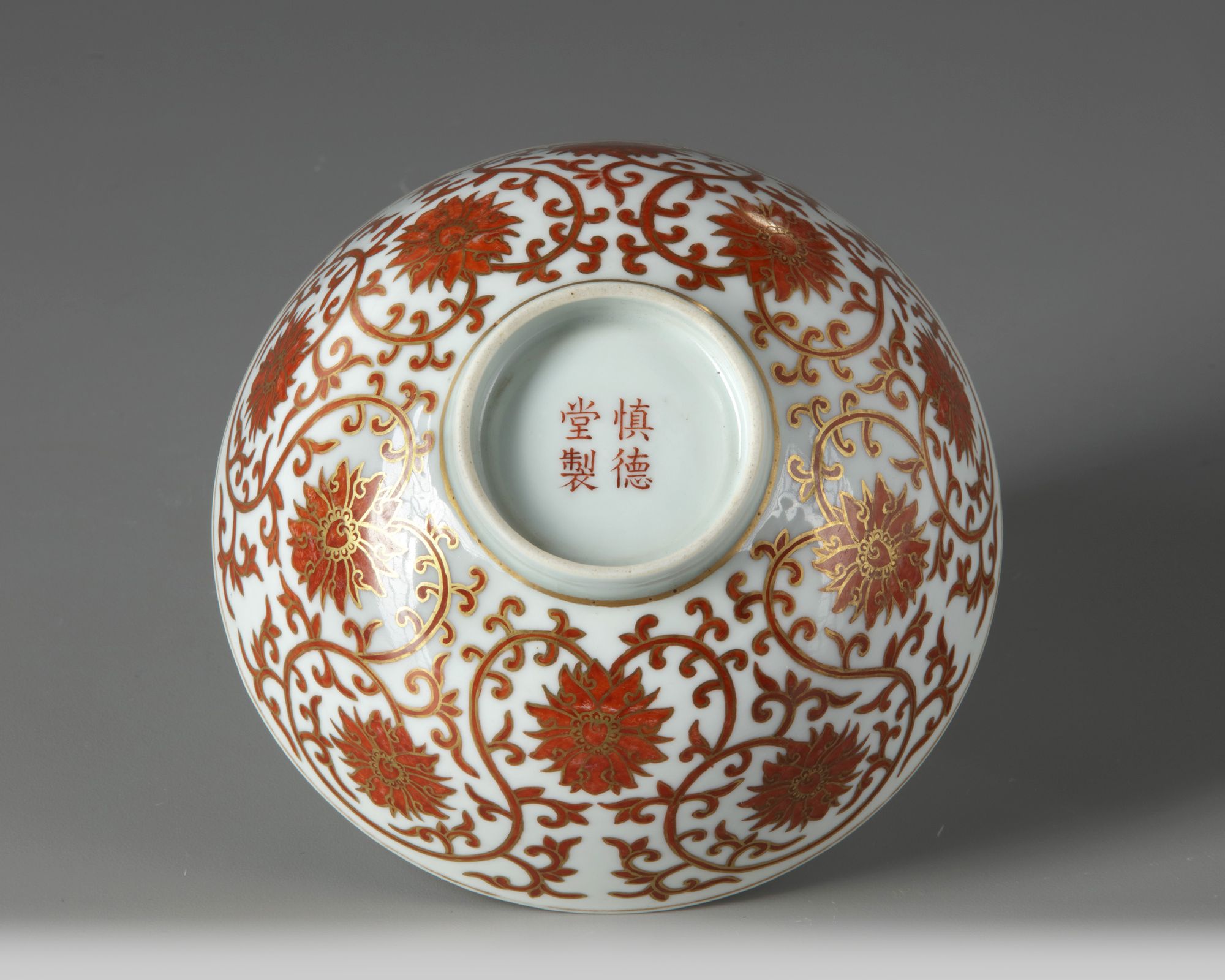 The bowl is decorated to the exterior with large scrolling lotus blooms. The base with a ‘Shende tang zhi’ mark in iron red.