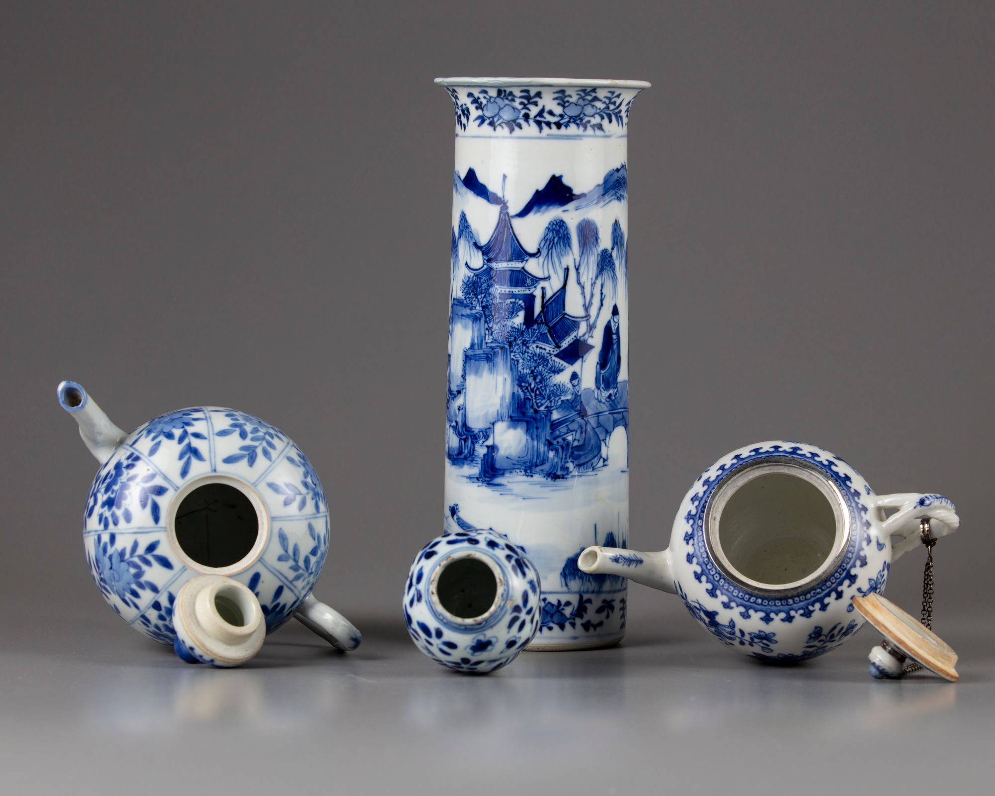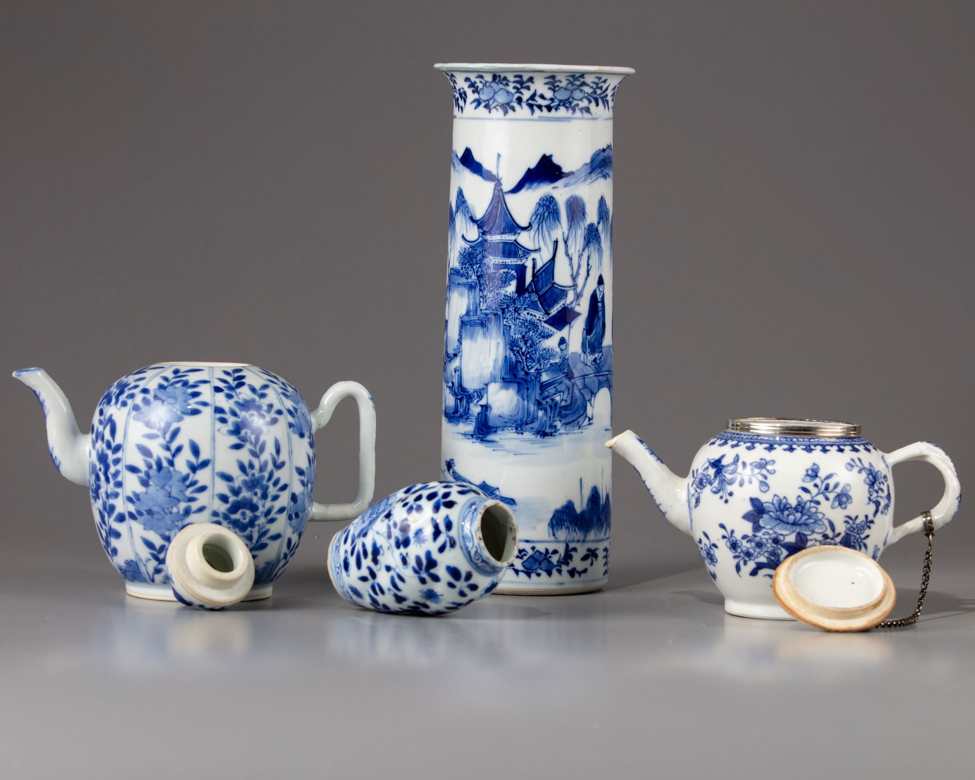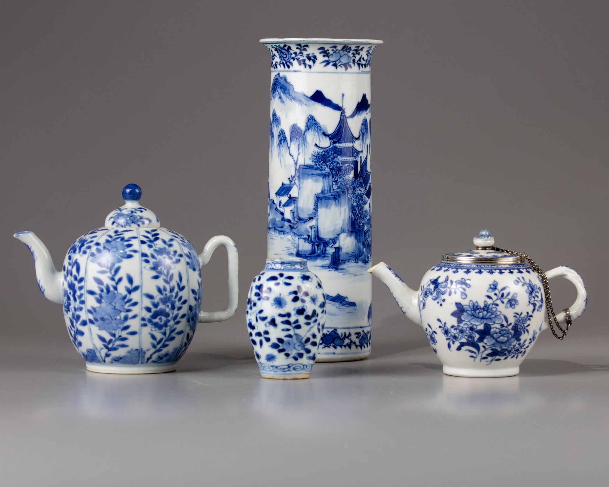 Consisting of two teapots with covers (one with silver mounts), decorated with flower sprays with a kanji four character mark to one of the teapots. A blue and white hat stand decorated with two figures standing on a bridge with houses in the background. A small vase with flower sprays.