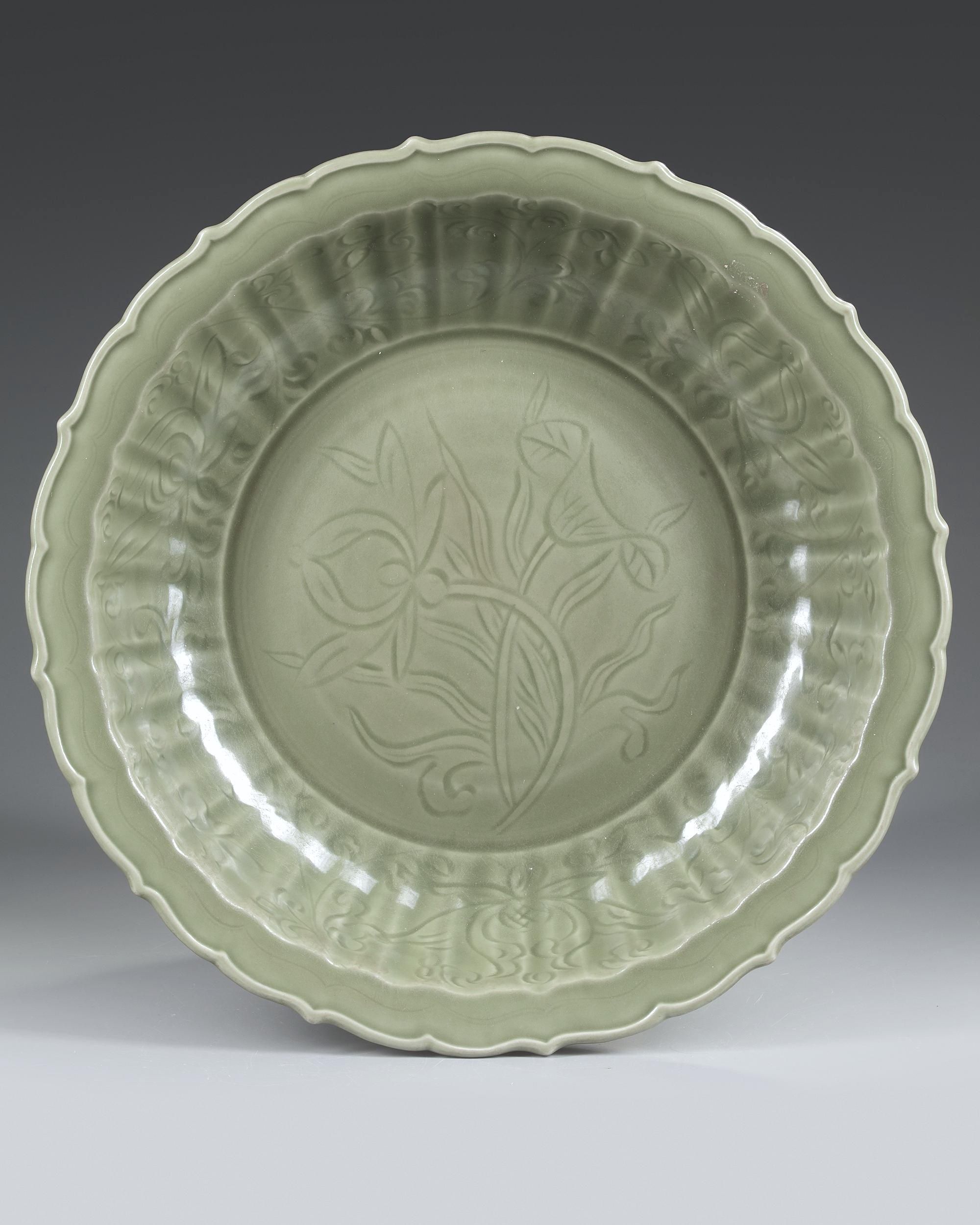 The stoutly potted body with lobed rounded sides rising from a short tapered foot to a broad everted barbed rim, finely carved on the interior with a double-line medallion enclosing a large leafy blossoming tree peony, encircled in the lobed cavetto by panels of alternating floral sprigs, the wide barbed rim further incised with a floral band, the exterior carved with lingzhi sprays, applied overall with an attractive even olive-green glaze save for an unglazed ring under the base left in the biscuit and burnt orange during firing. 51.5 diameter.