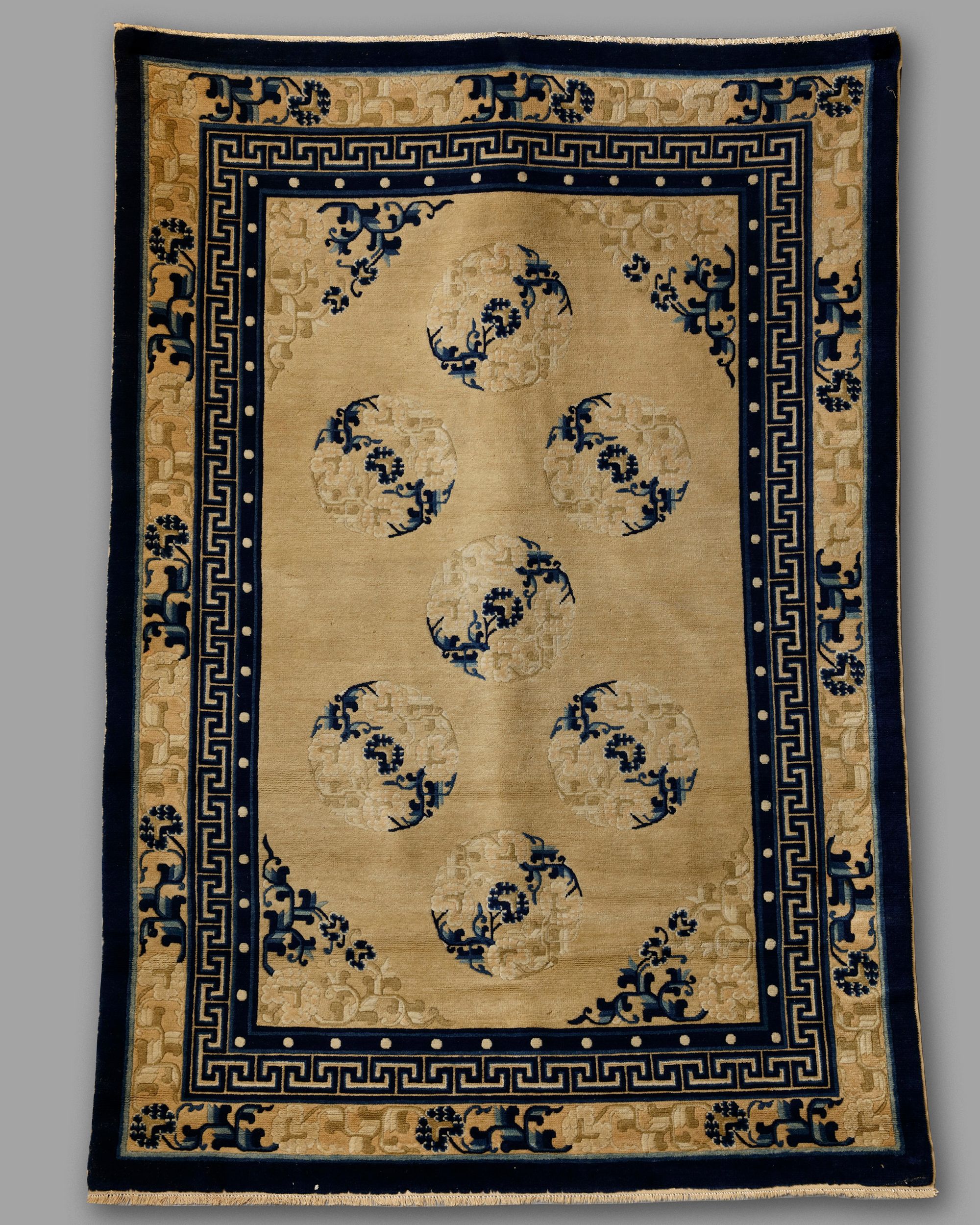 The rectangular rug is decorated in beige and deep blue tones with seven floral roundels, the corners with flower sprays. The central panel is surrounded by a angular scroll band and a further scrolling flower band.