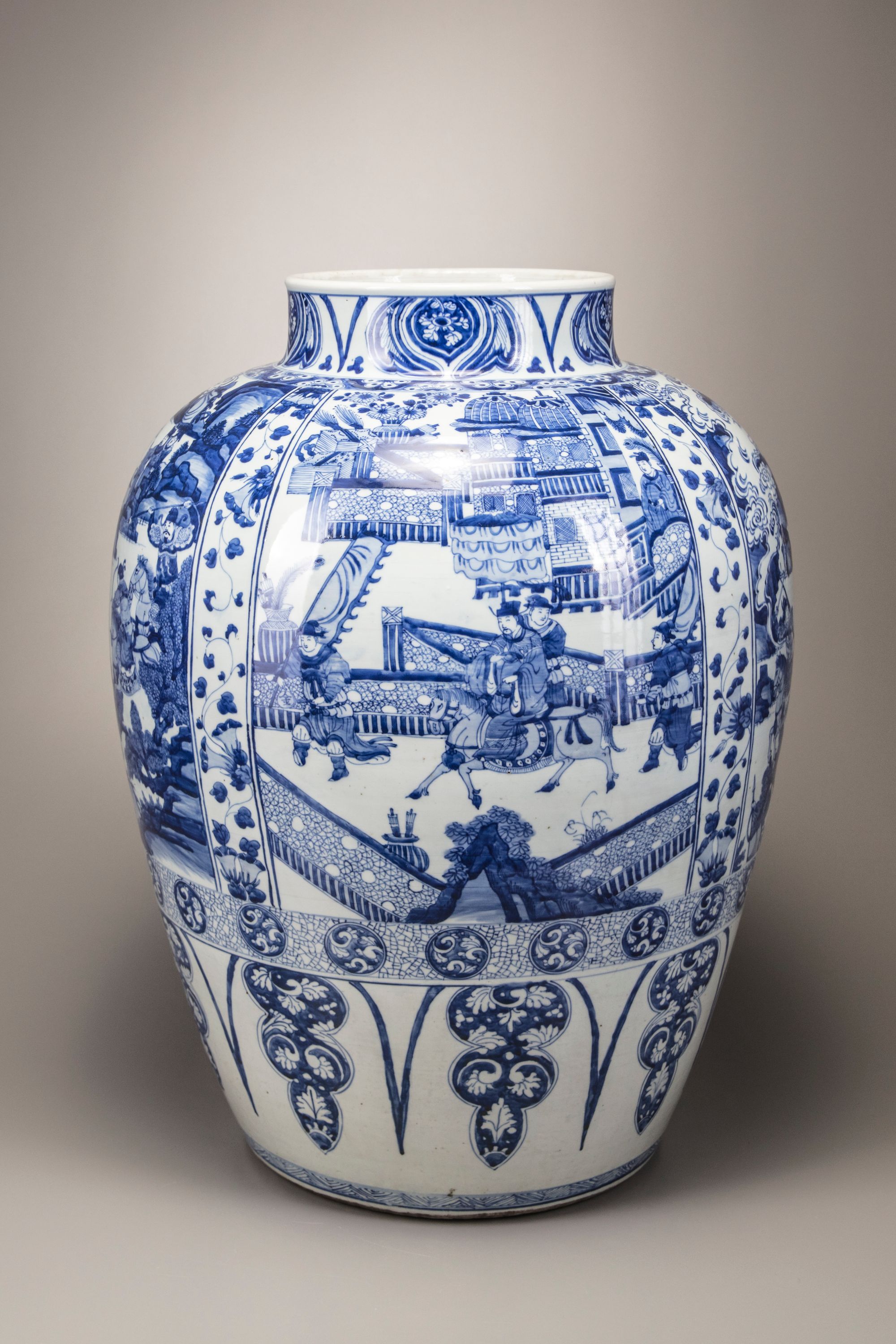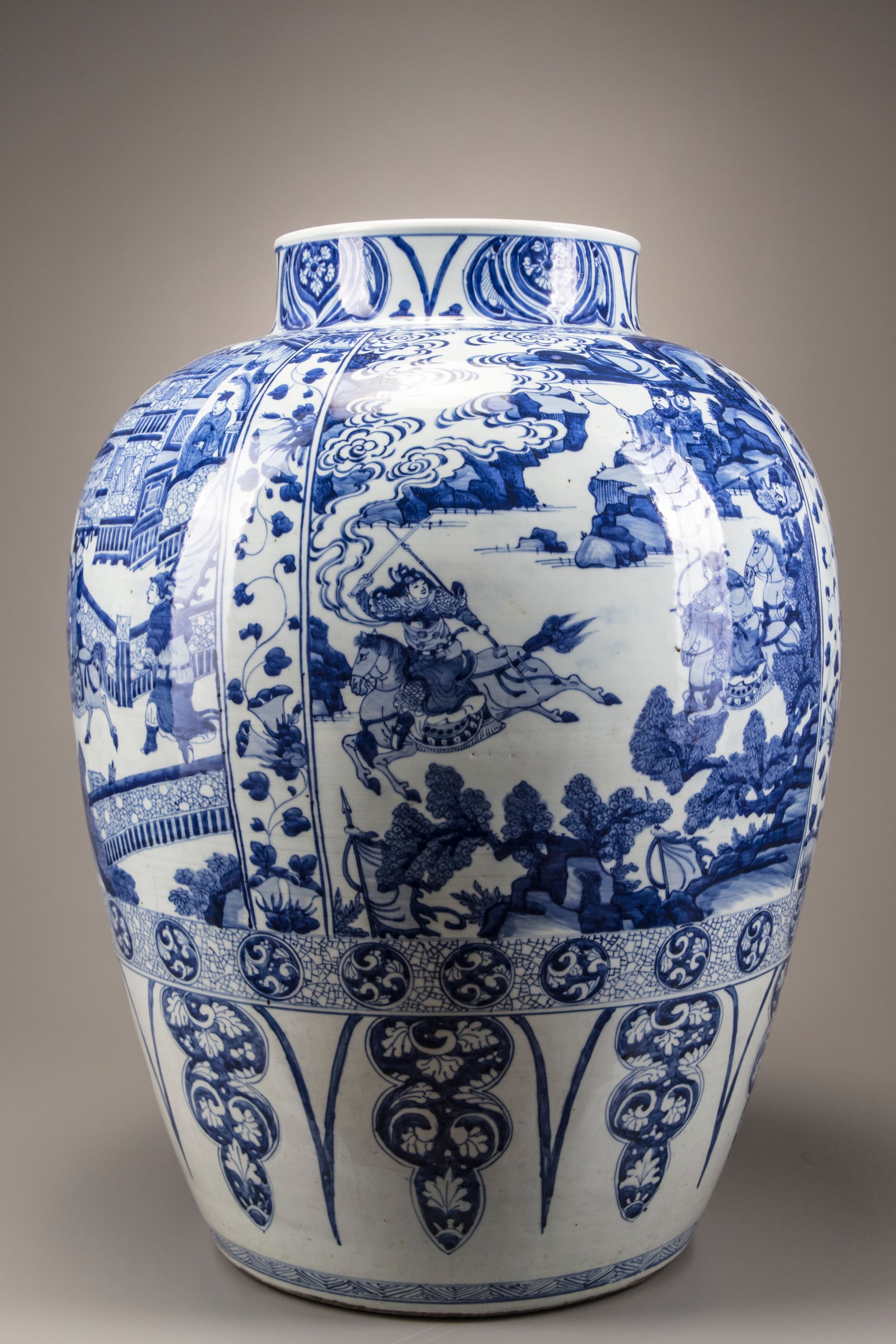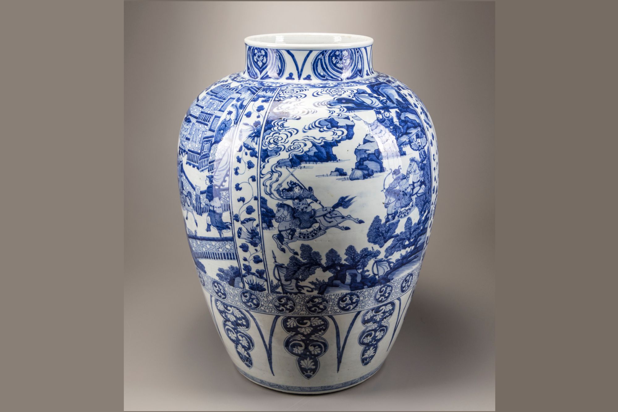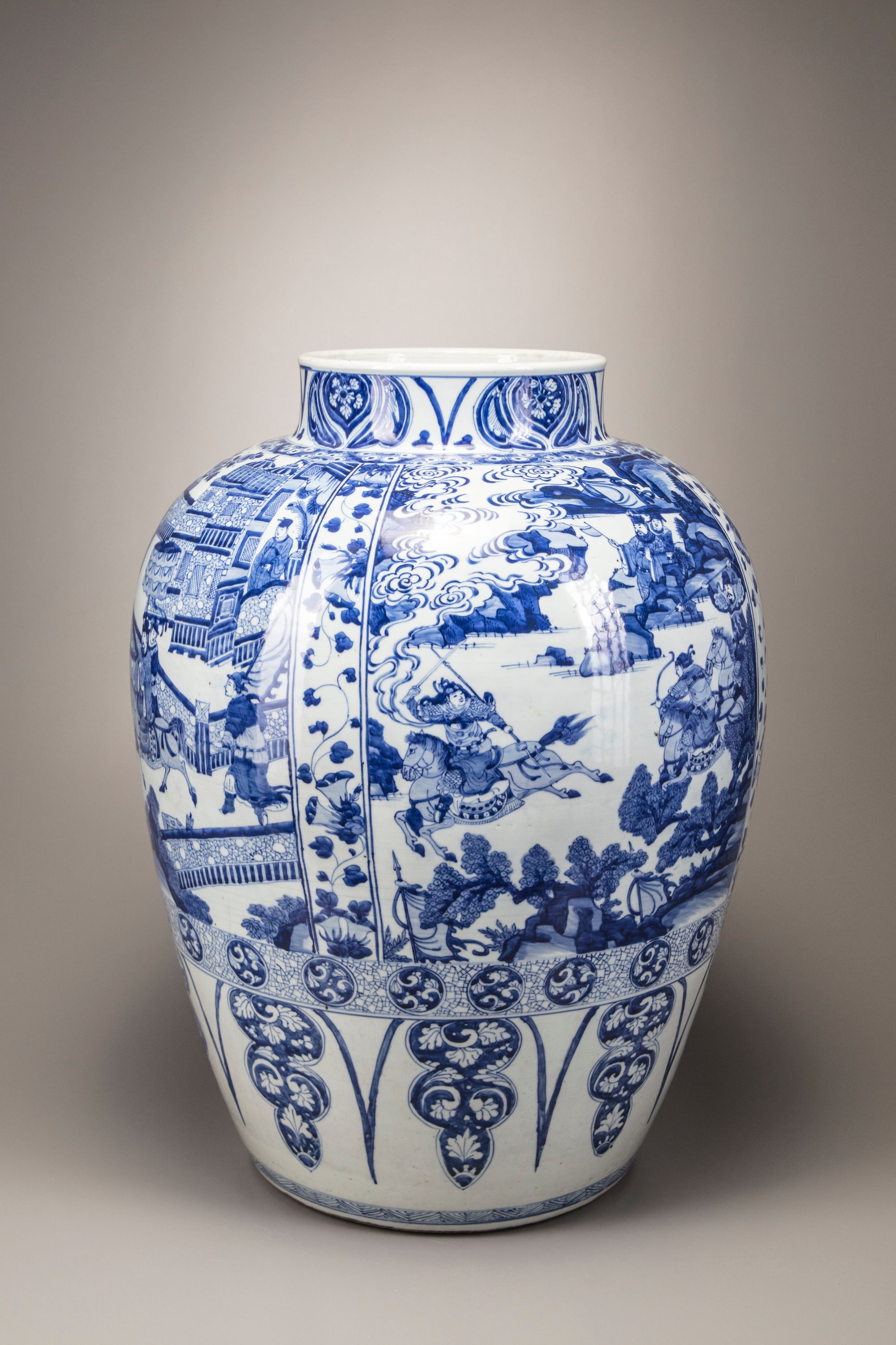 Catalogue notes: An almost identical but slightly larger massive blue and white vase (with an associated cover), was sold at Christie's New York, 26 January 2015, lot 80. A soldier vase and cover also with narrative scenes and a similar morning glory band with provenance dating back to Augustus the Strong (1670-1733) was sold at Bonhams London, 12 May 2011, lot 317.