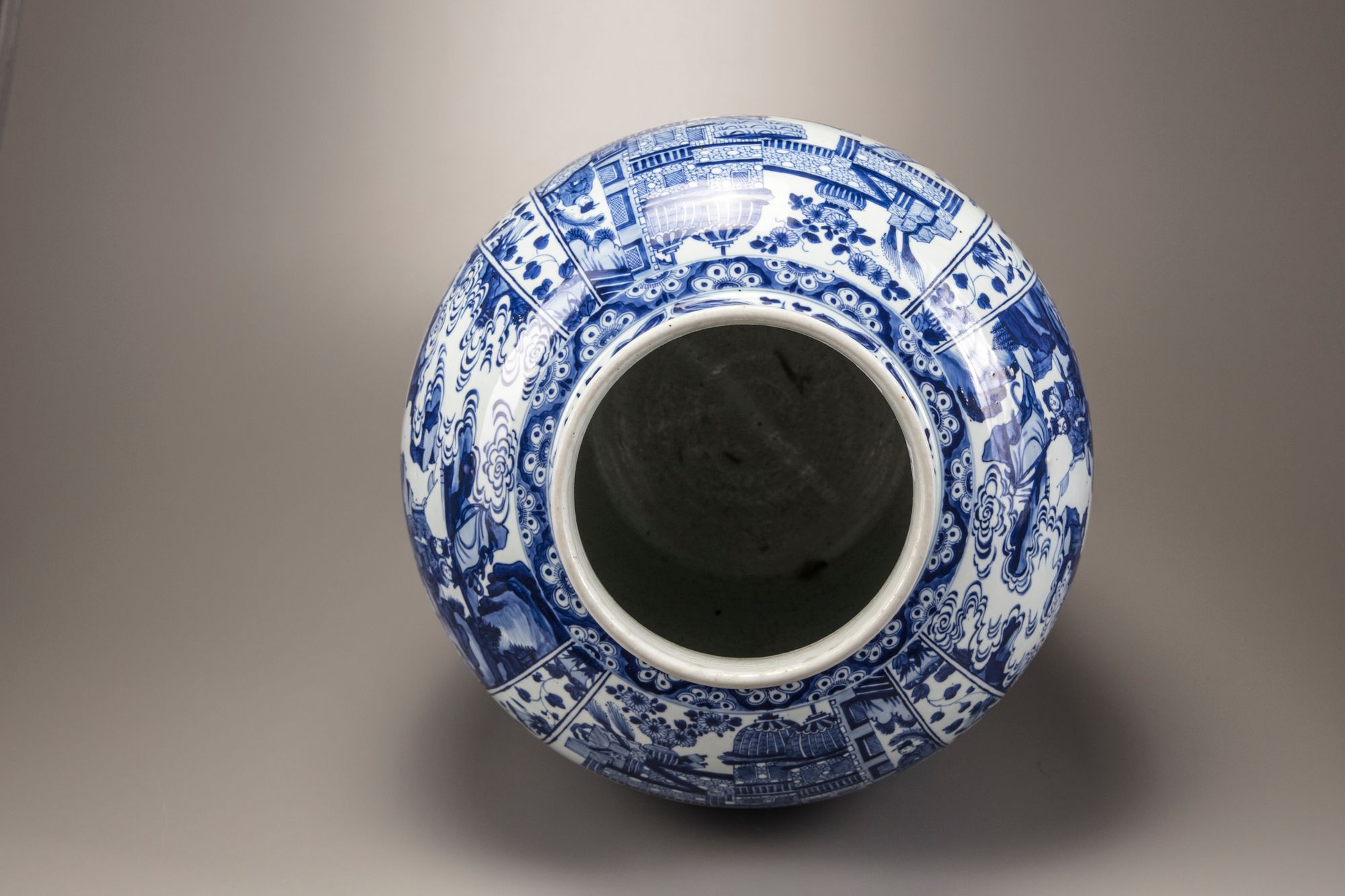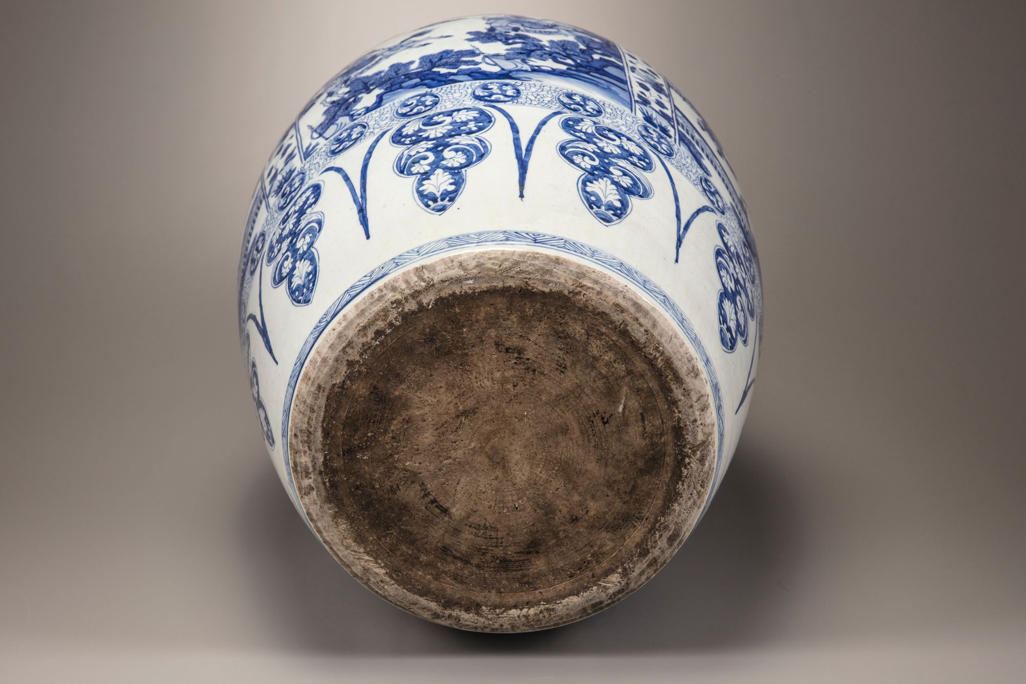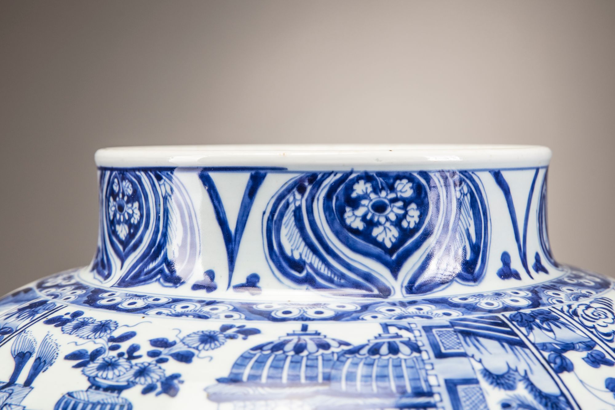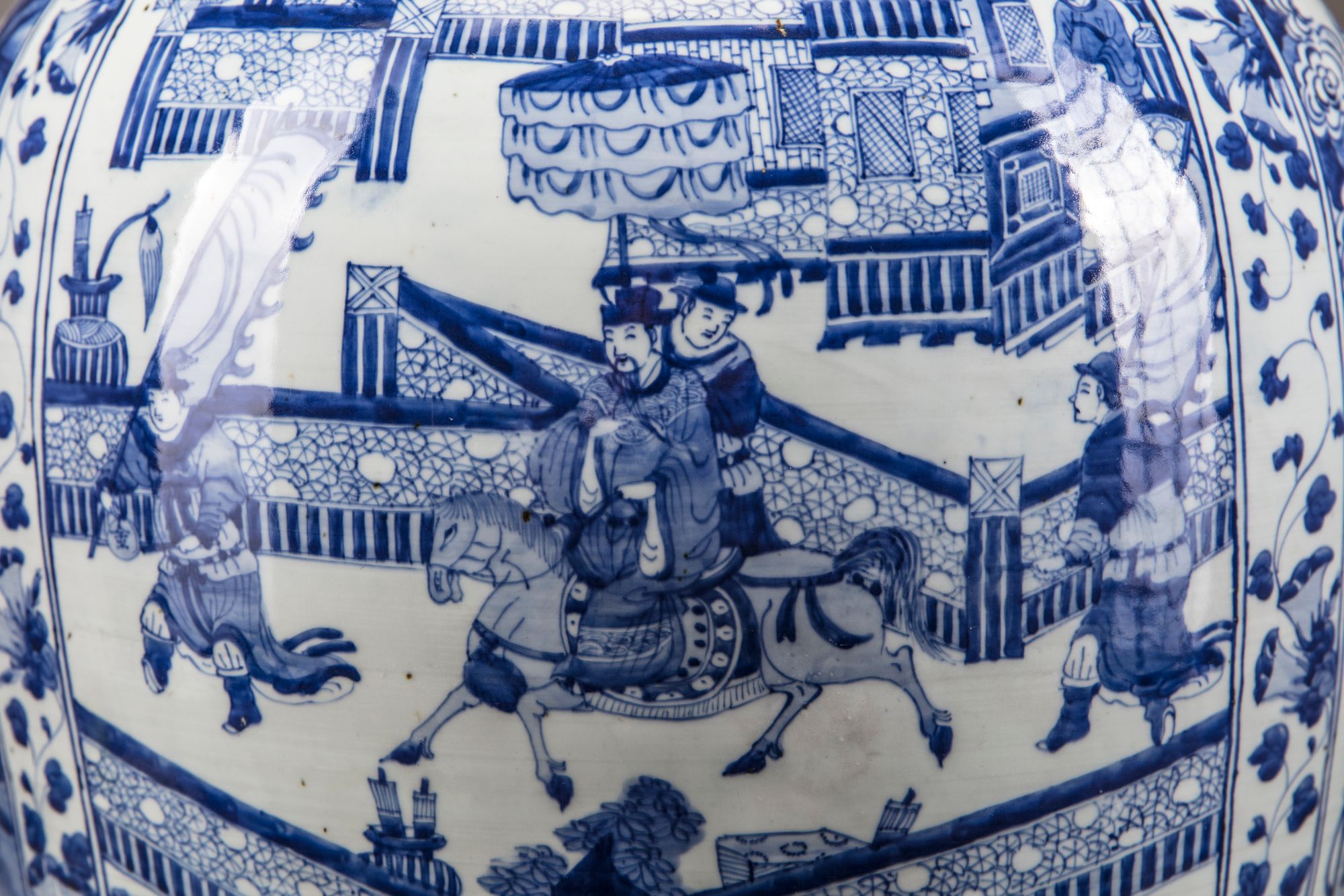 Catalogue notes: An almost identical but slightly larger massive blue and white vase (with an associated cover), was sold at Christie's New York, 26 January 2015, lot 80. A soldier vase and cover also with narrative scenes and a similar morning glory band with provenance dating back to Augustus the Strong (1670-1733) was sold at Bonhams London, 12 May 2011, lot 317.