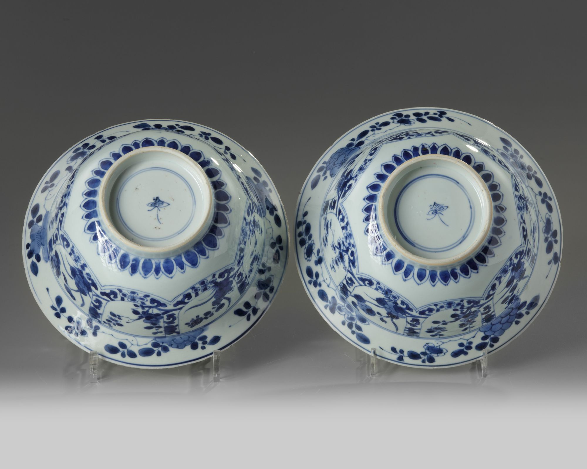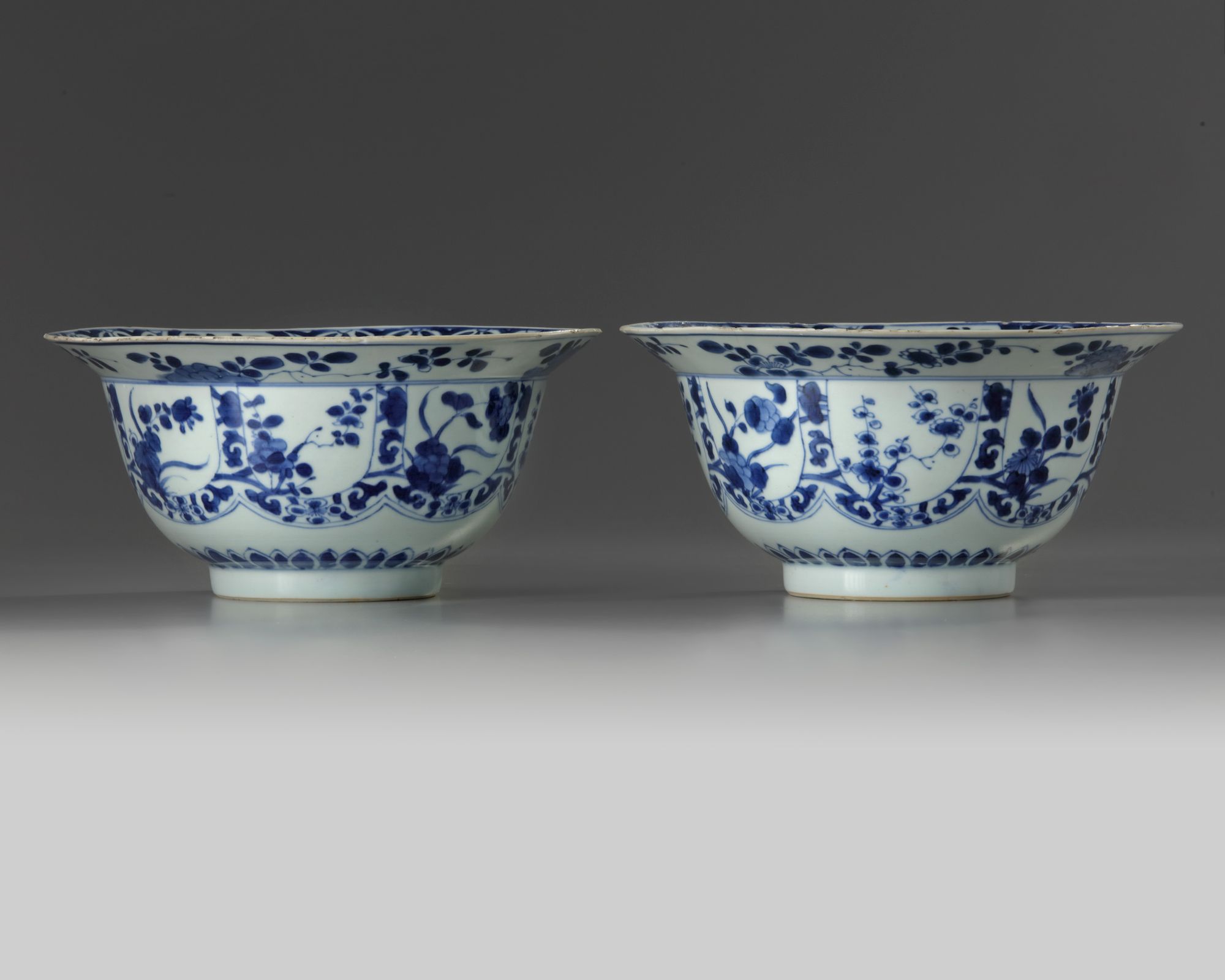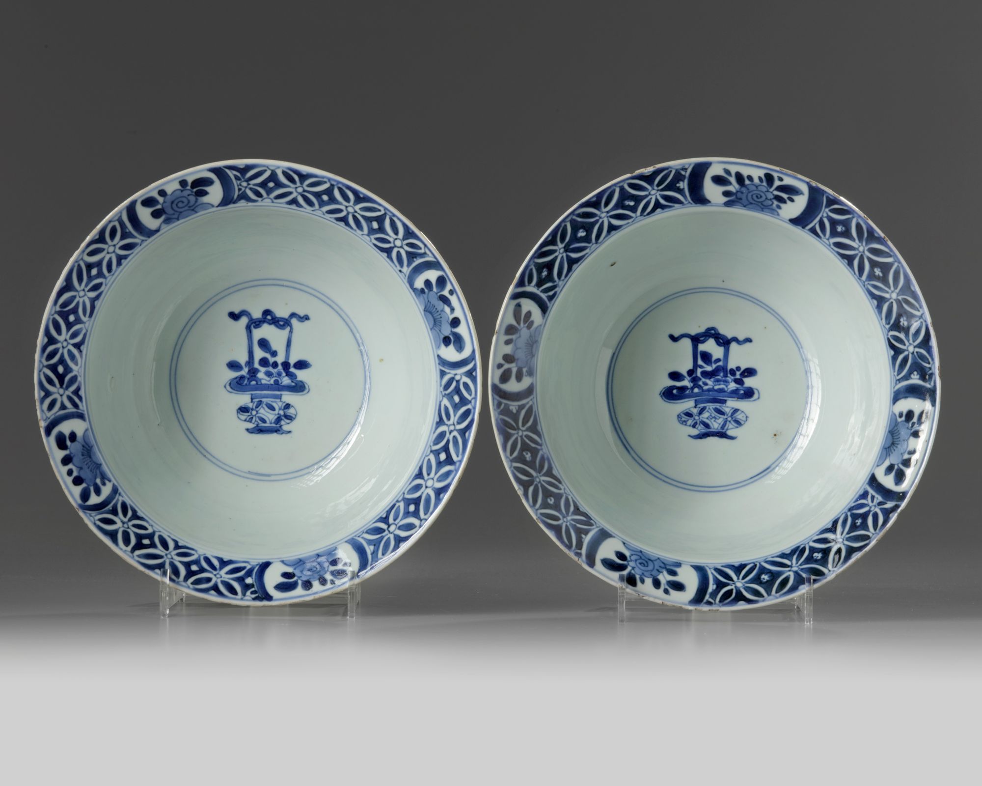 Each bowl is decorated with suspended petal-shaped panels enclosing various flowers surrounded by a scrolling foliage border. The exterior of the everted rim is decorated with flower sprays, the interior is decorated with a thick trellis band interspersed with floral cartouches. The interior is decorated with a flower basket and the base with a lingzhi mark within a double circle.