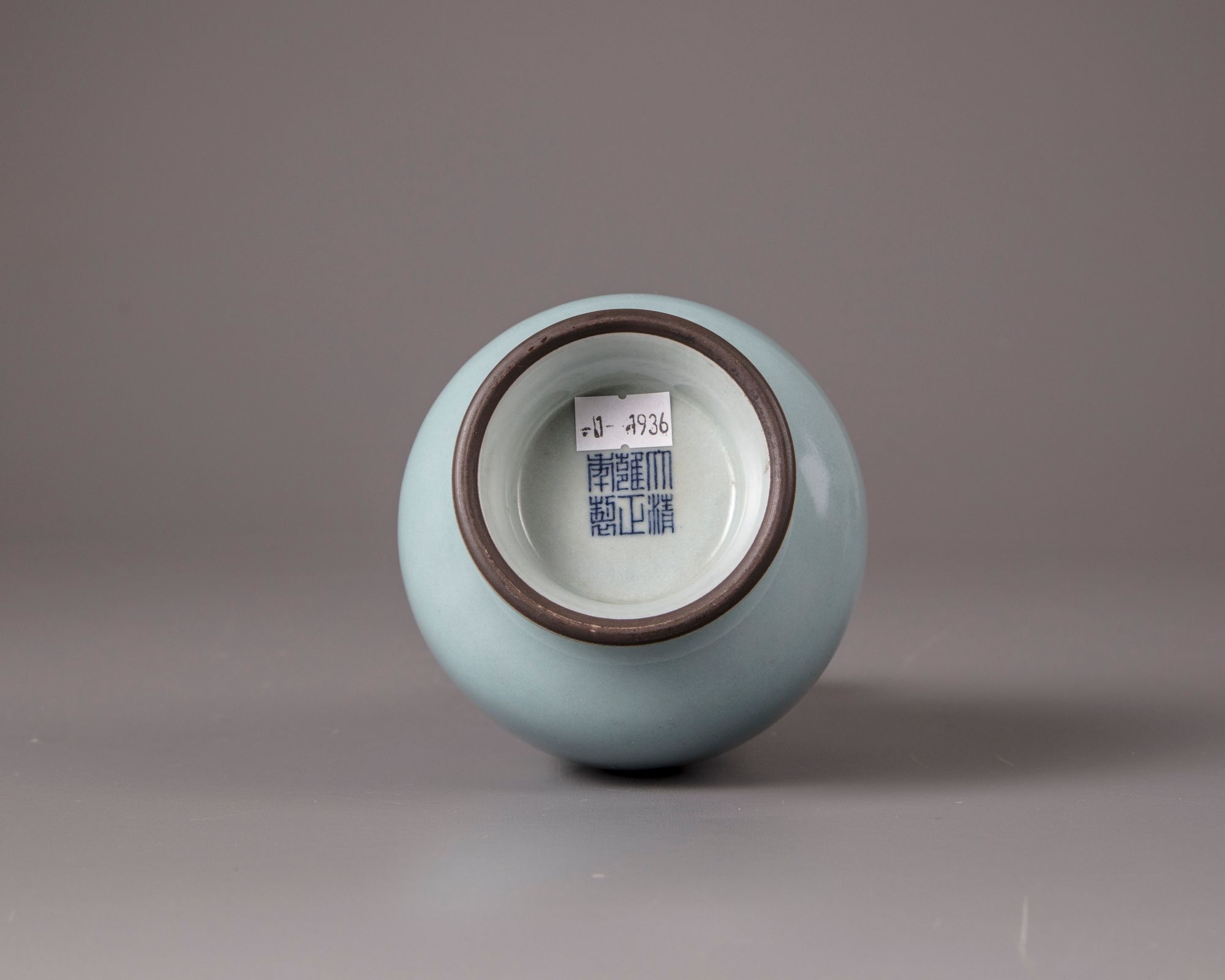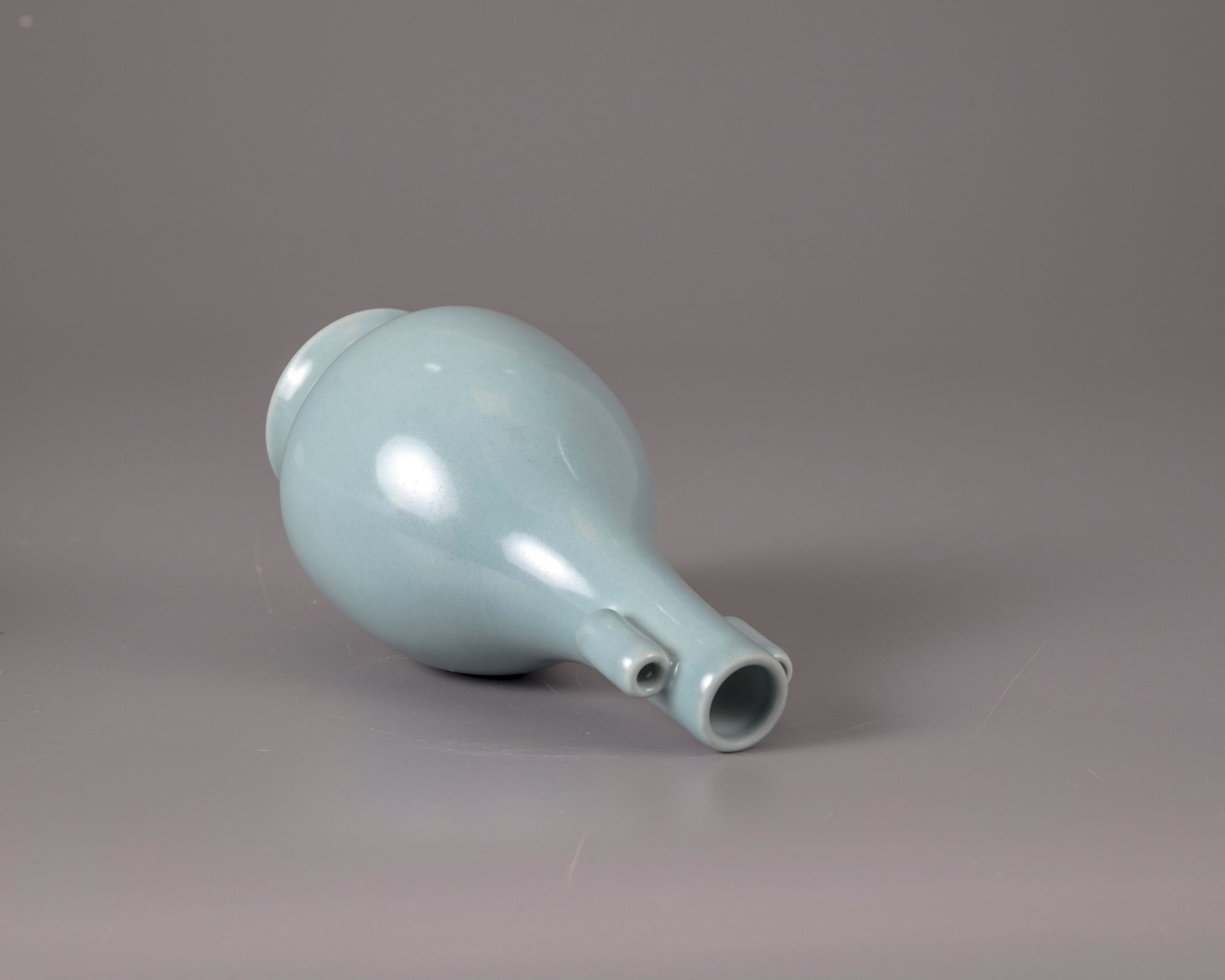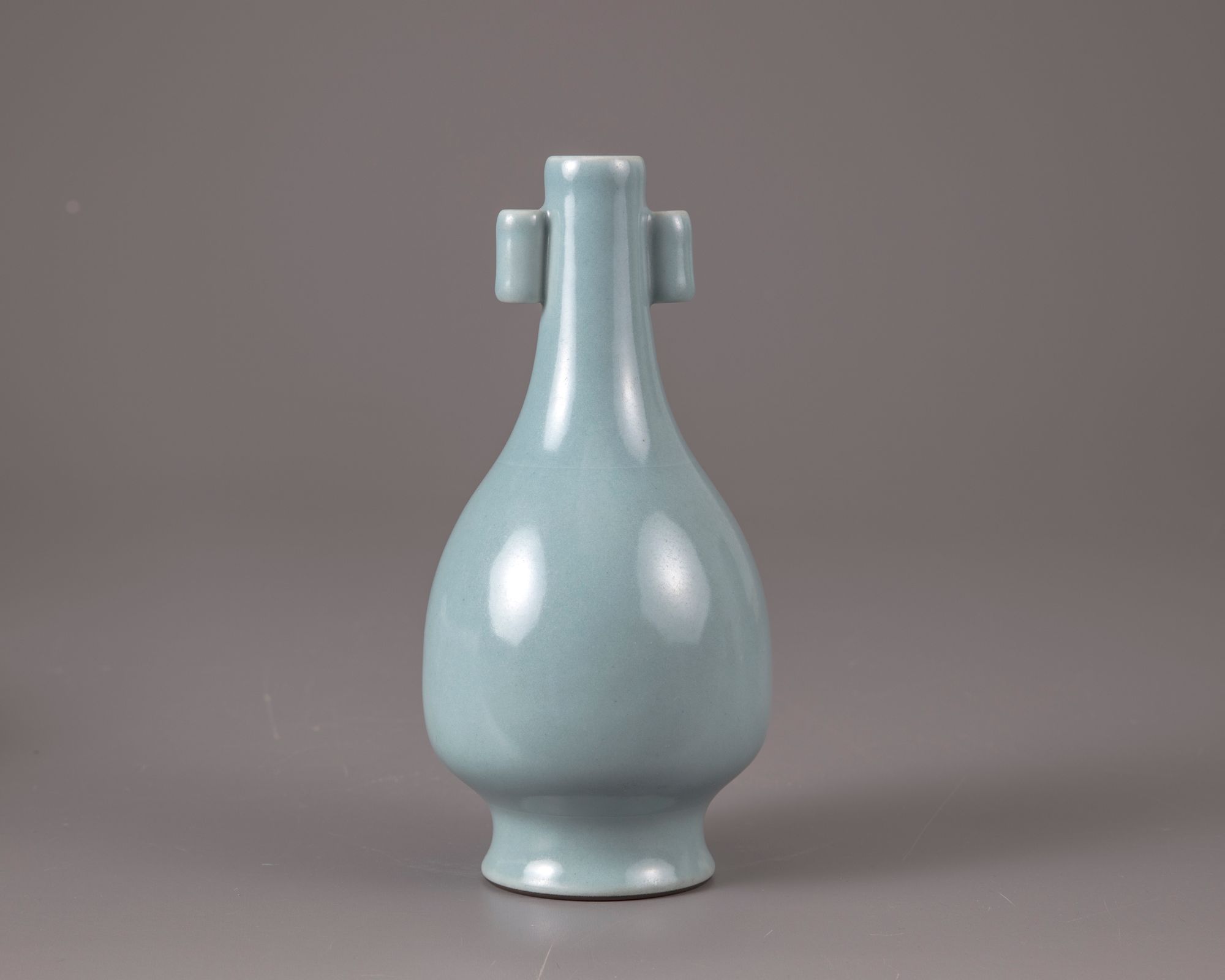 The vase is decorated with two cylindrical handles and covered all in light bluish glaze. The base with an apocryphal Yongzheng seal mark.