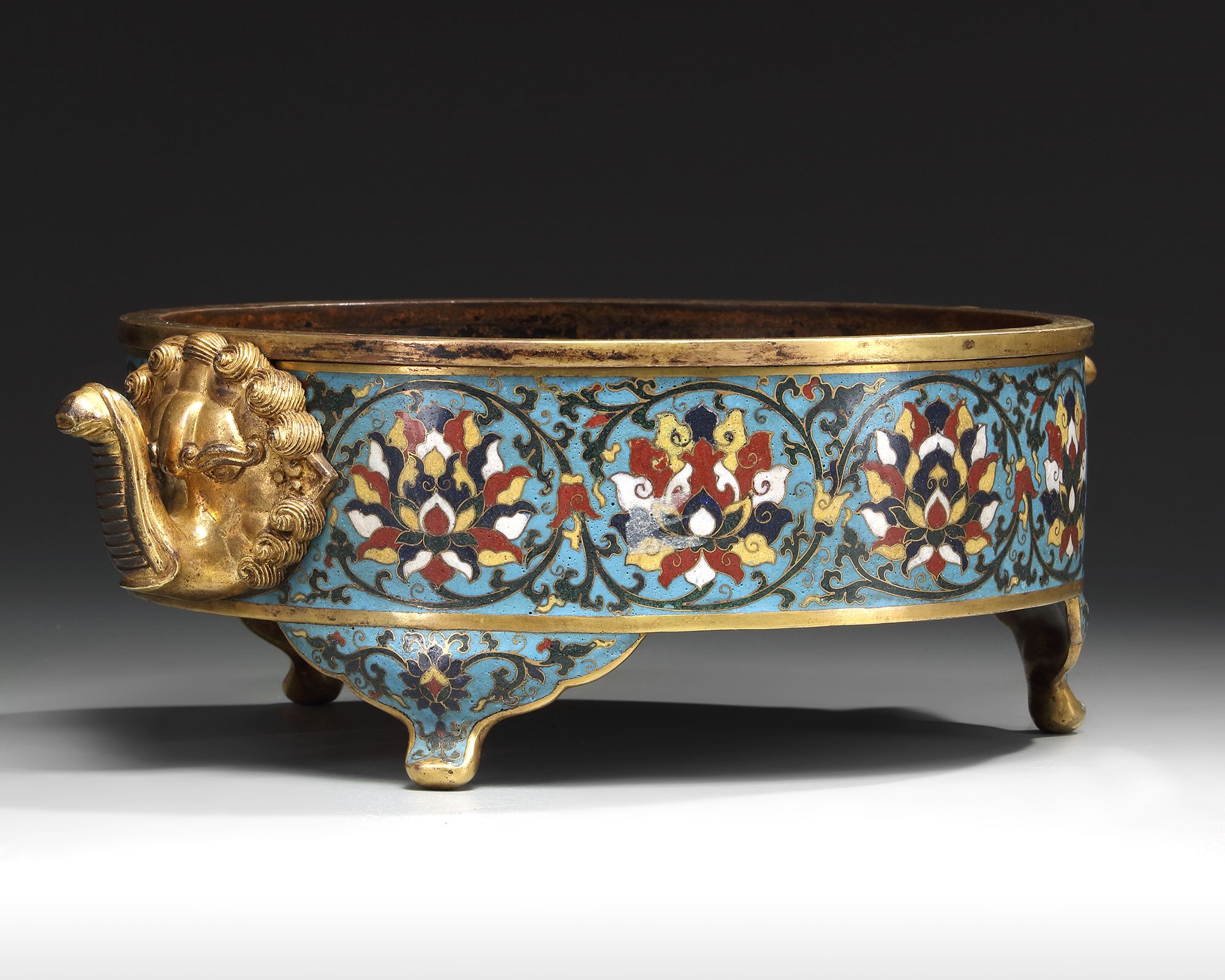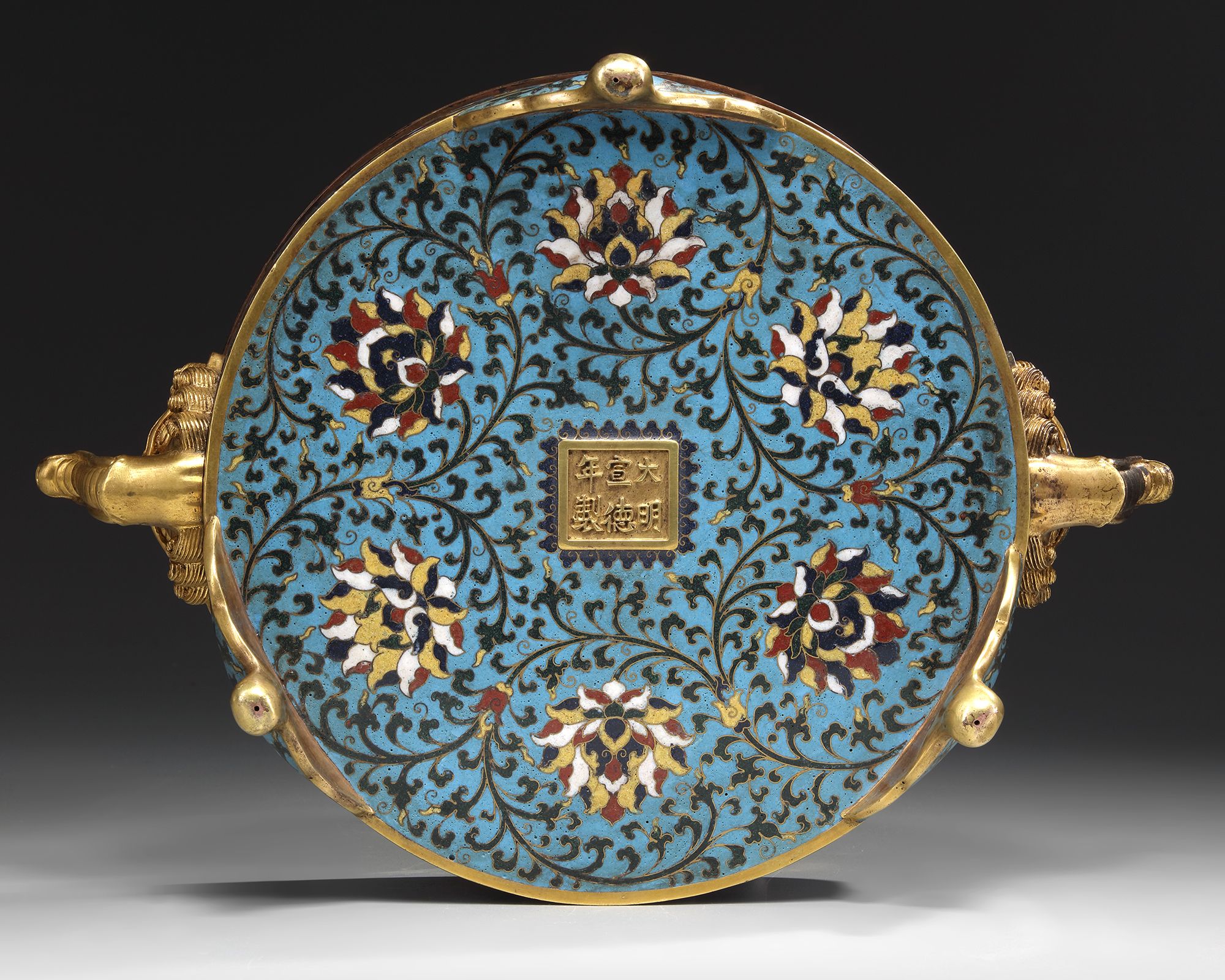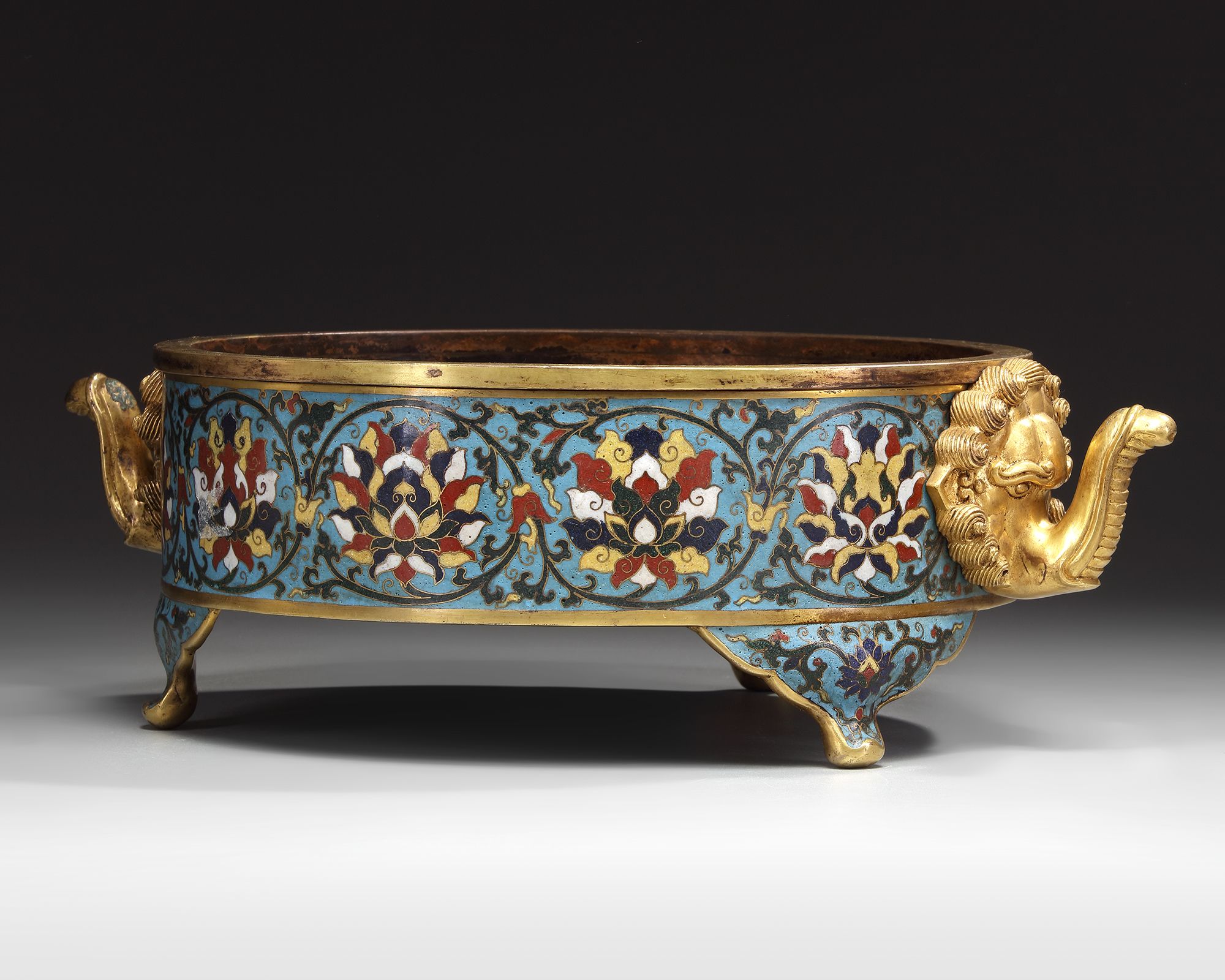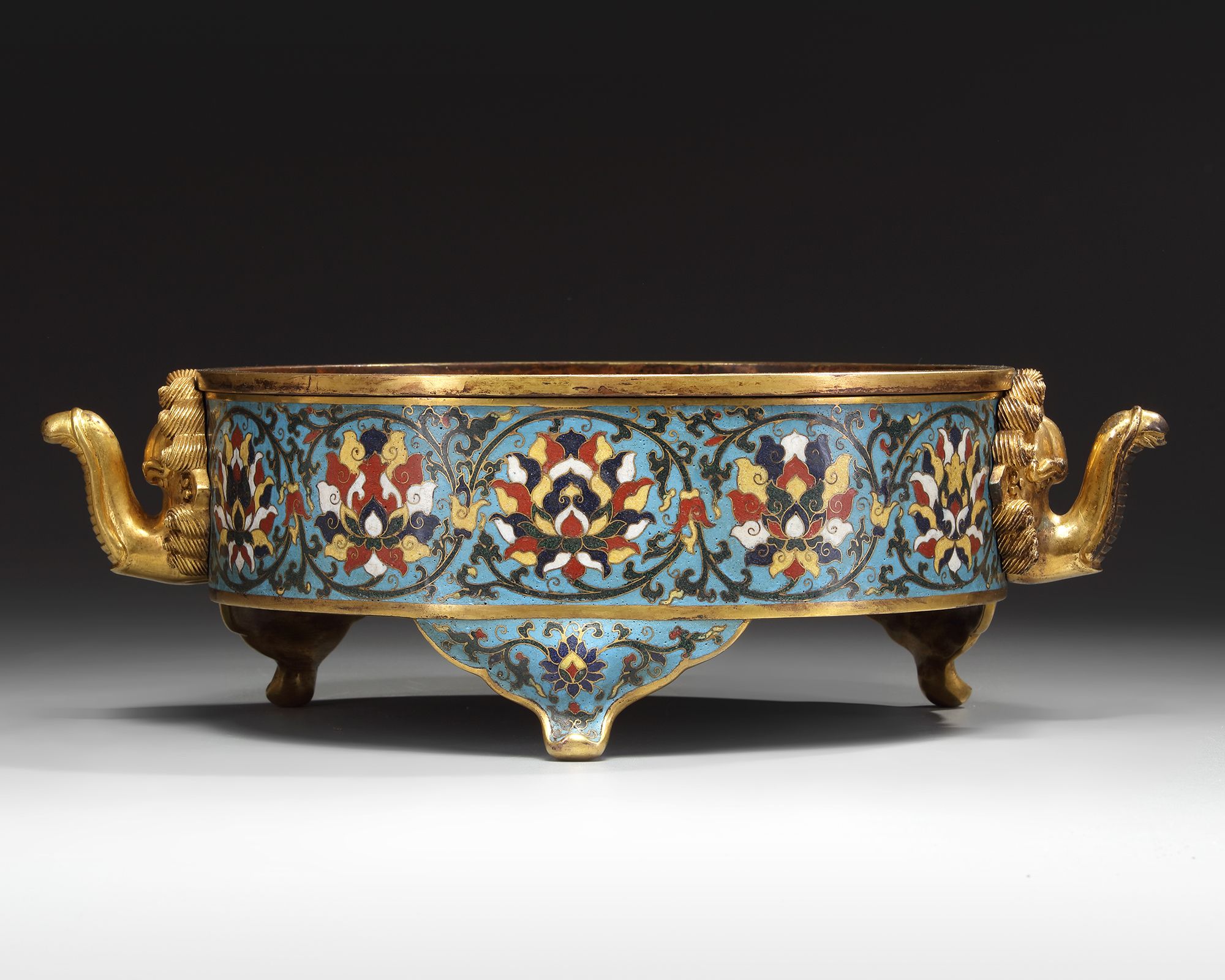 The censer is decorated with two elephant-mask handles to the sides, the straight walls are decorated to the exterior with lotus scrolls. The censer stands on three cabriole feet. The base is decorated with lotus scrolls surrounding an apocryphal Xuande mark. 11.6 by 36.8 cm.