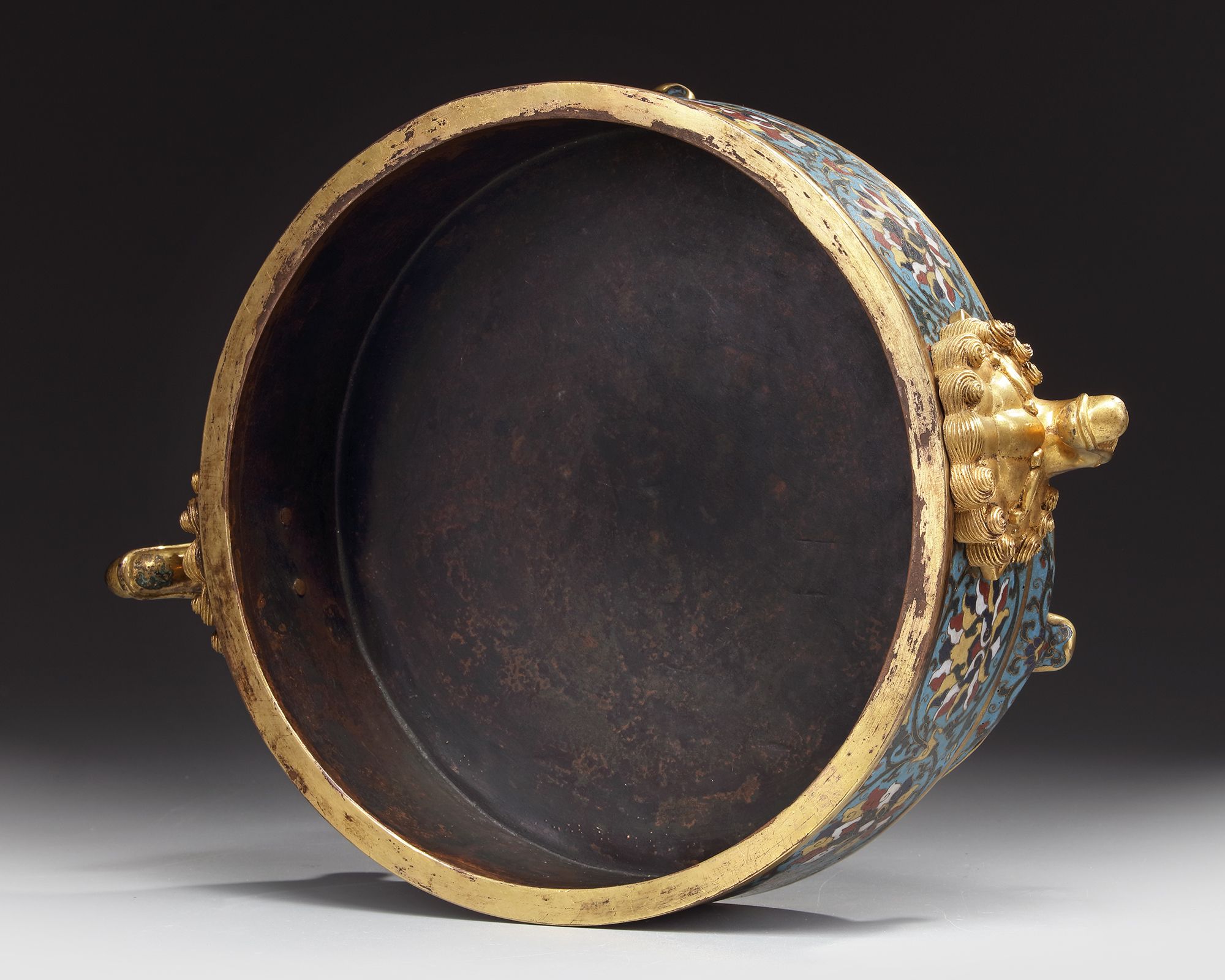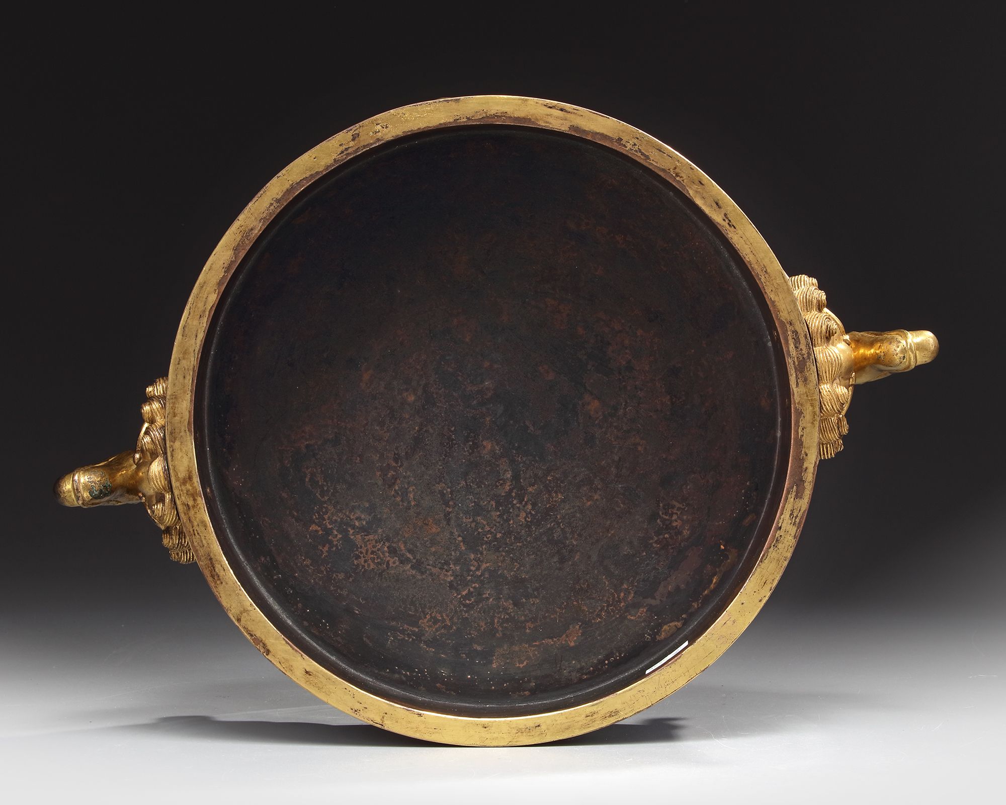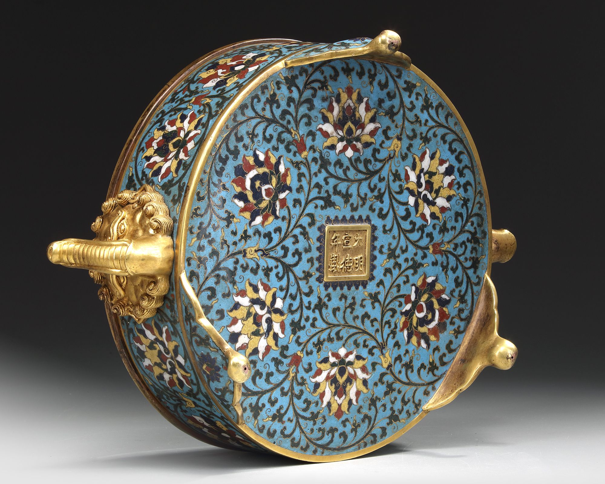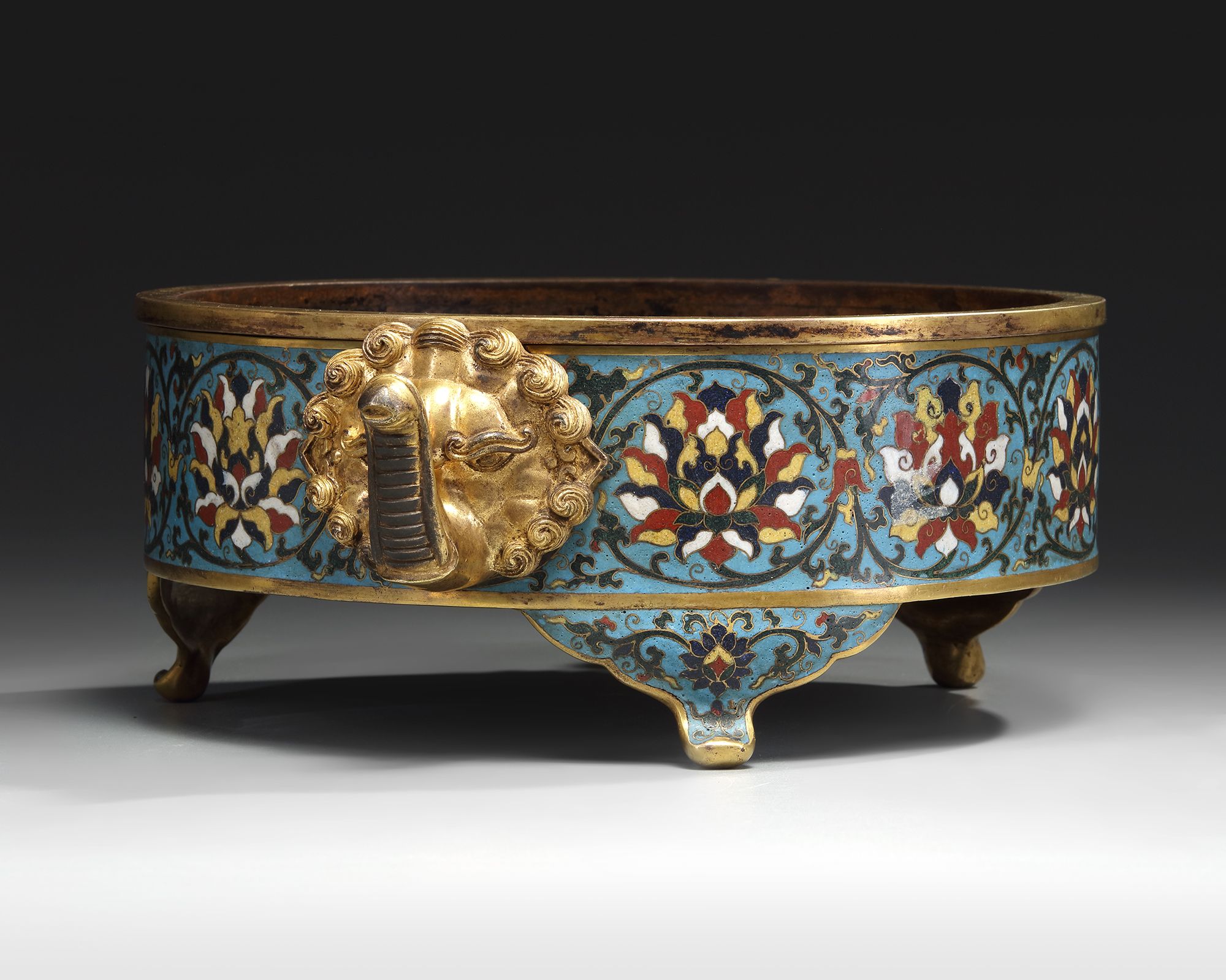 The censer is decorated with two elephant-mask handles to the sides, the straight walls are decorated to the exterior with lotus scrolls. The censer stands on three cabriole feet. The base is decorated with lotus scrolls surrounding an apocryphal Xuande mark. 11.6 by 36.8 cm.
