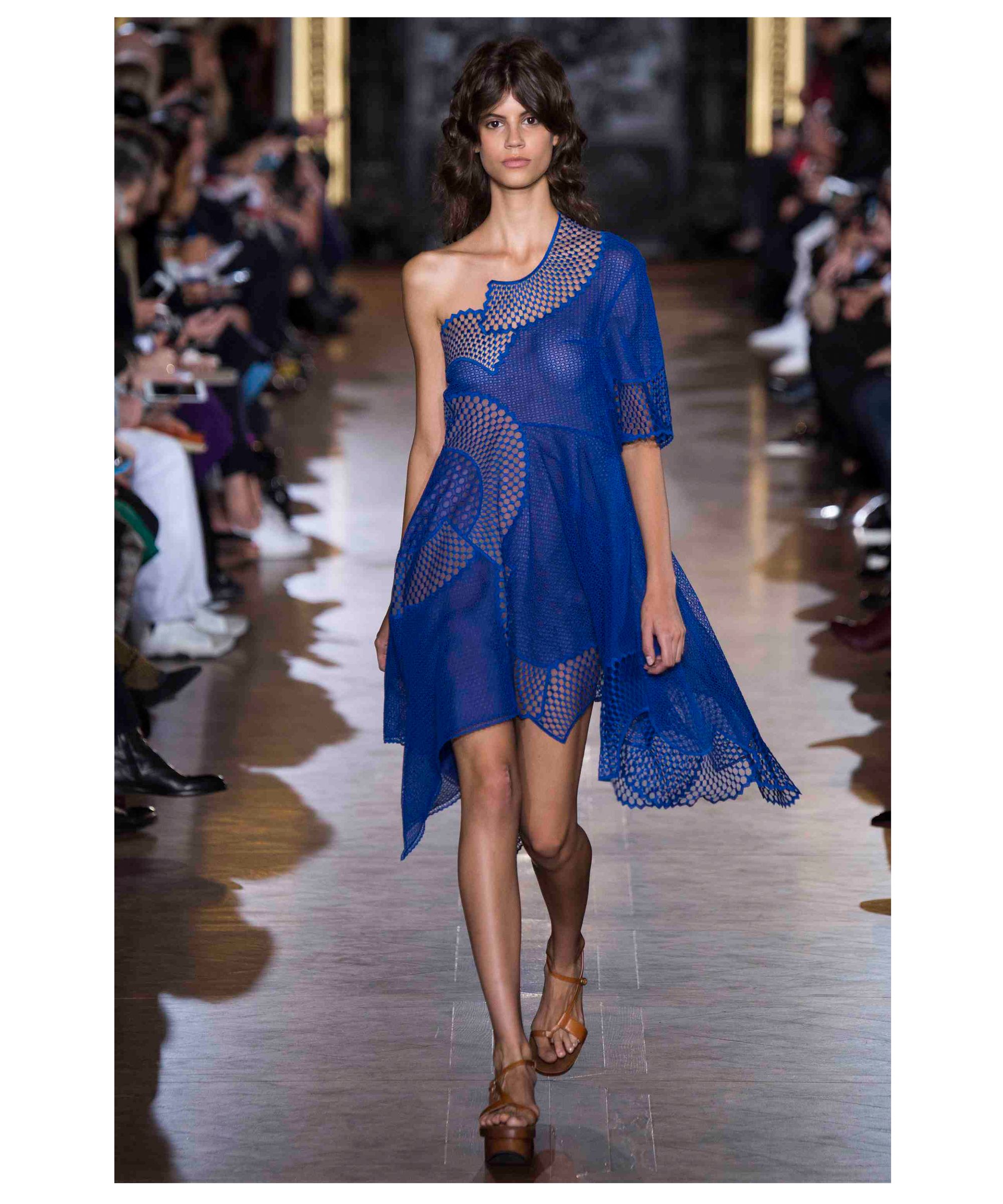 This blue Stella Mccartney asymmetric mesh cut-out dress is from the brand's striking new season collection. Crafted in Italy from soft cotton, the piece has been cut to a flattering knee length and showcases a flirtatious handkerchief hem and fun mesh cut-out detailing all over. For an on-brand take on warm weather dressing style yours with athleisure-inspired flatforms.