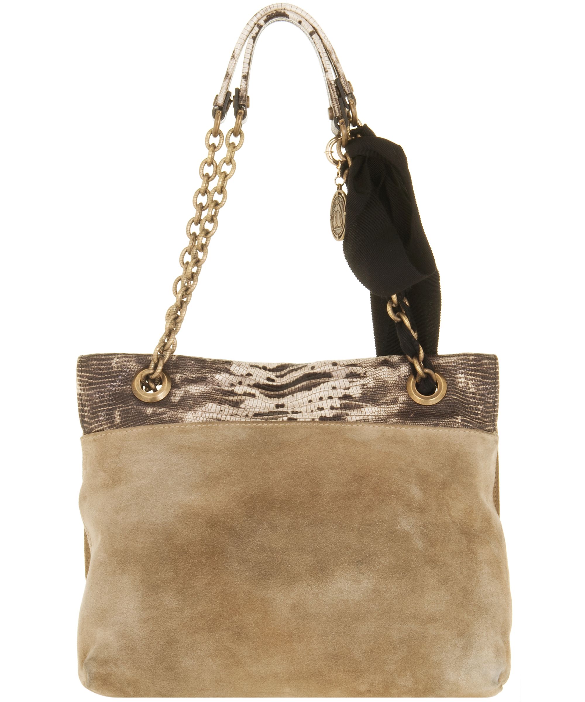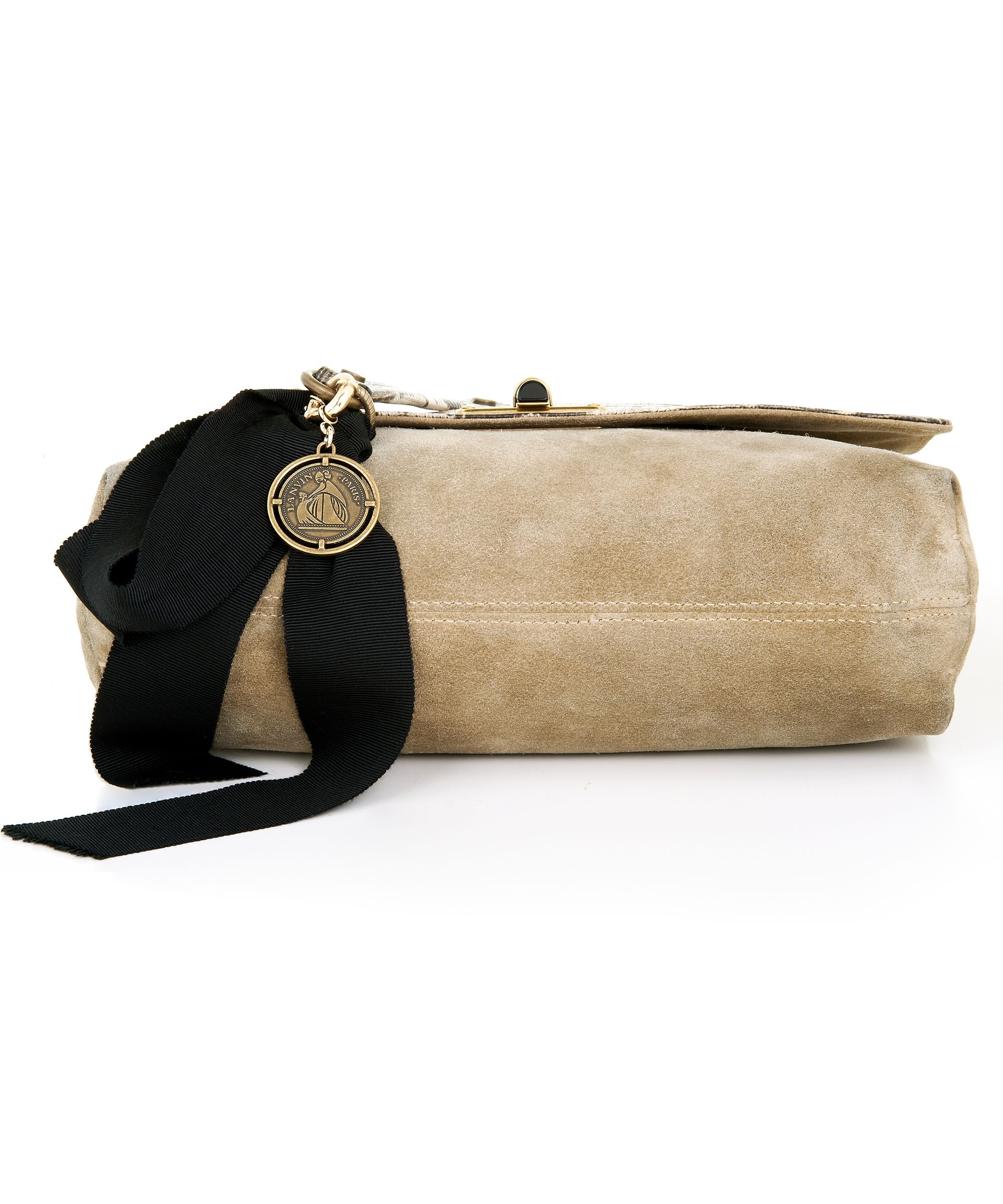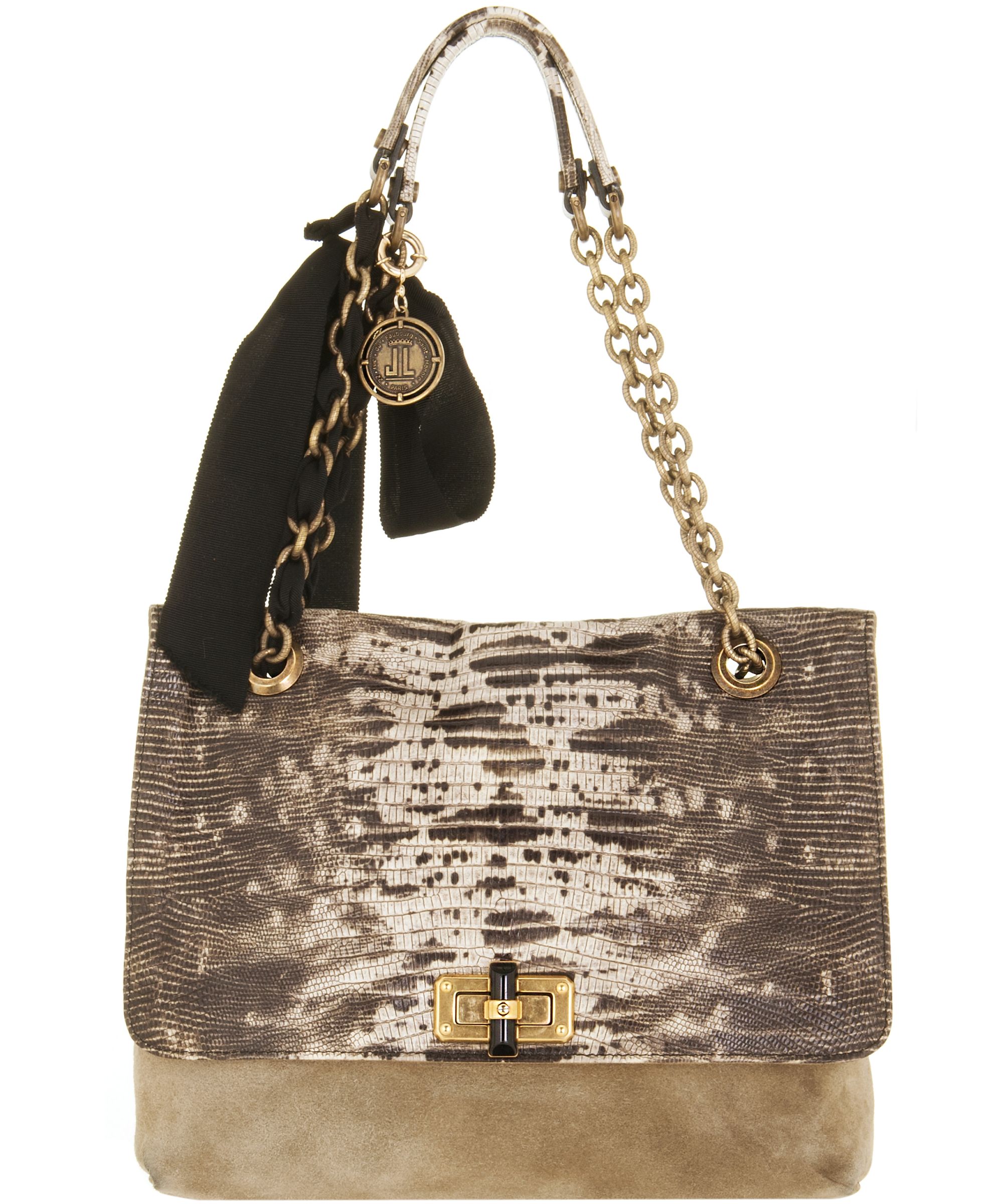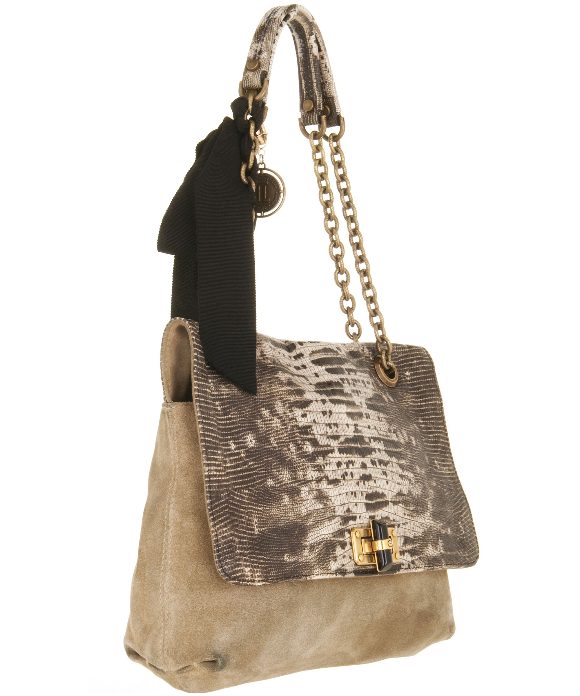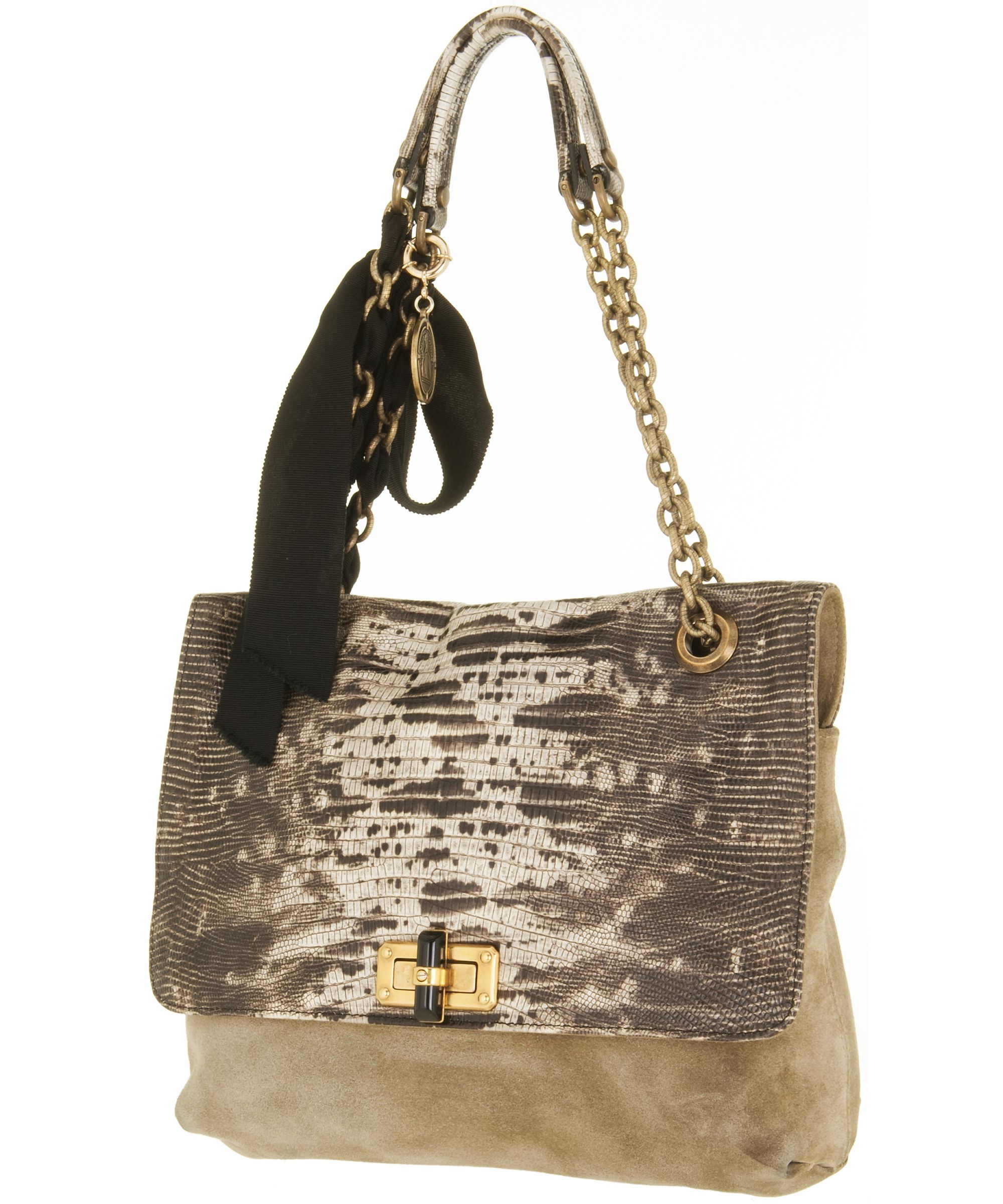 Lanvin reworked its iconic 'Happy' bag in fabulously lizard-print leather. Beautifully complemented by stone suede and black grosgrain ribbons, it encapsulates everything that we love about the sophisticated label. Set it against a neutral palette to perfect Parisian chic.