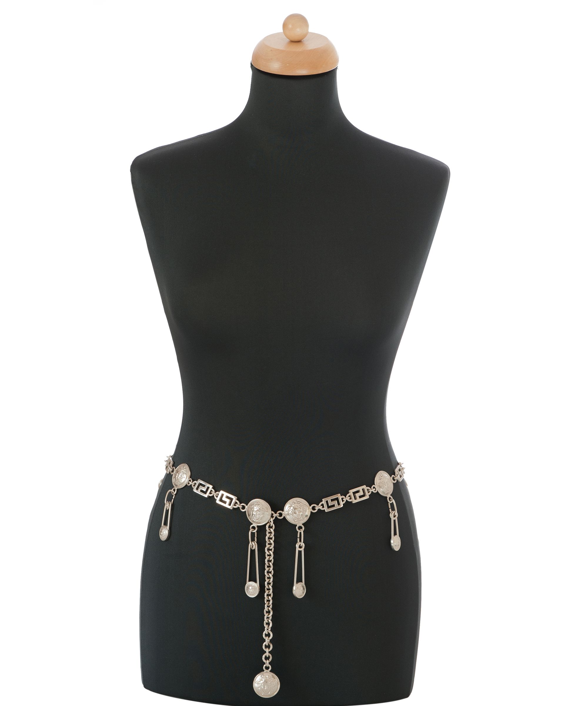 Iconic safety pin and Medusa belt from Gianni Versace. This silvertoned chain belt features circular Medusa heads, dangling safety pins, and an adjustable hook closure. Can also be worn as a necklace.