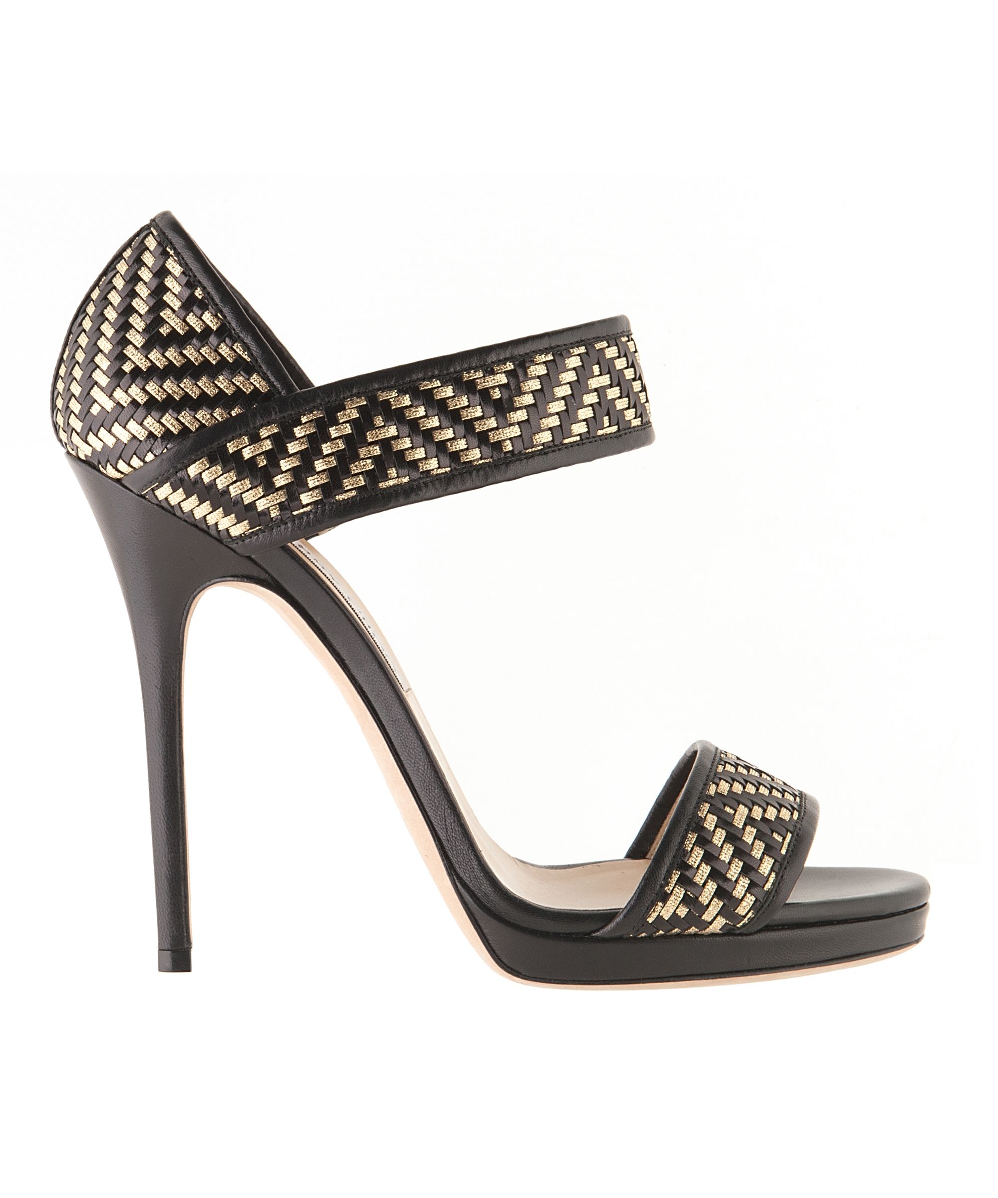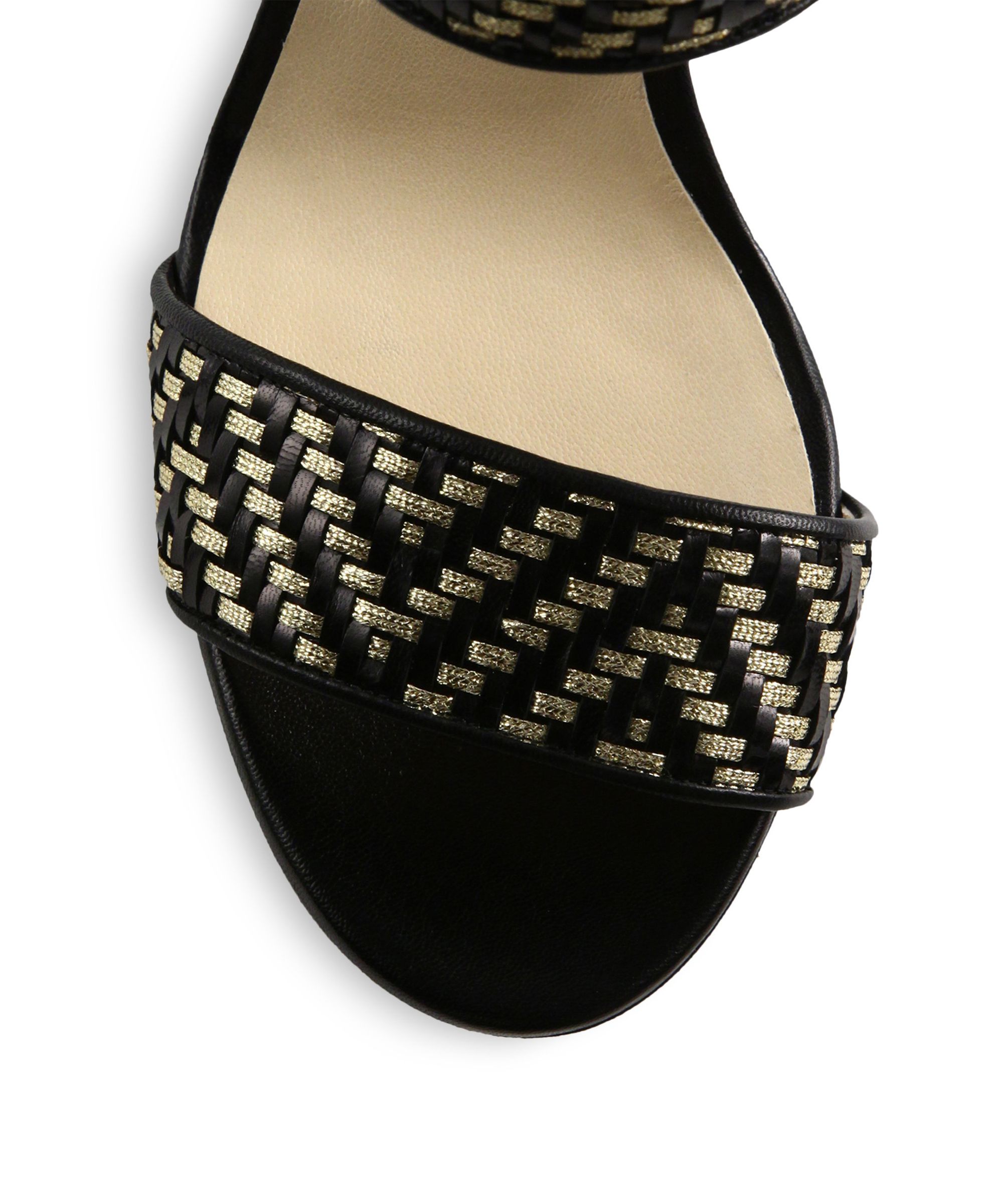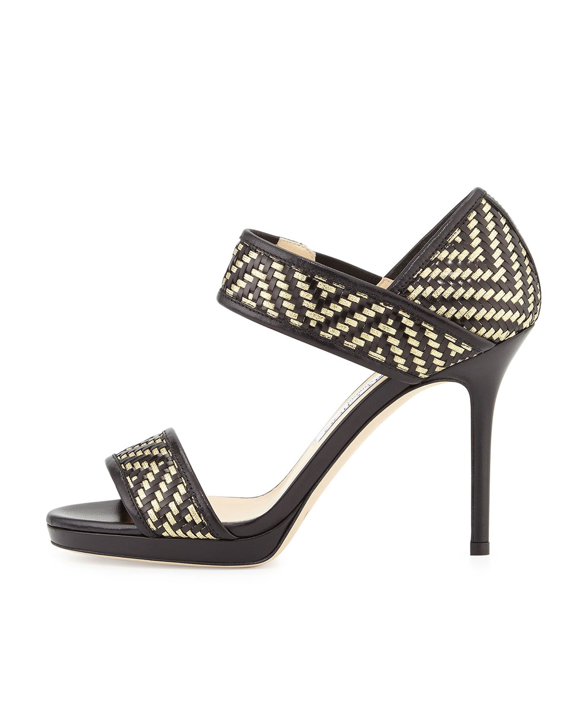 Rich smooth leather and shimmering metallic leather are beautifully interwoven in a wide-strap sandal on a sleek heel.