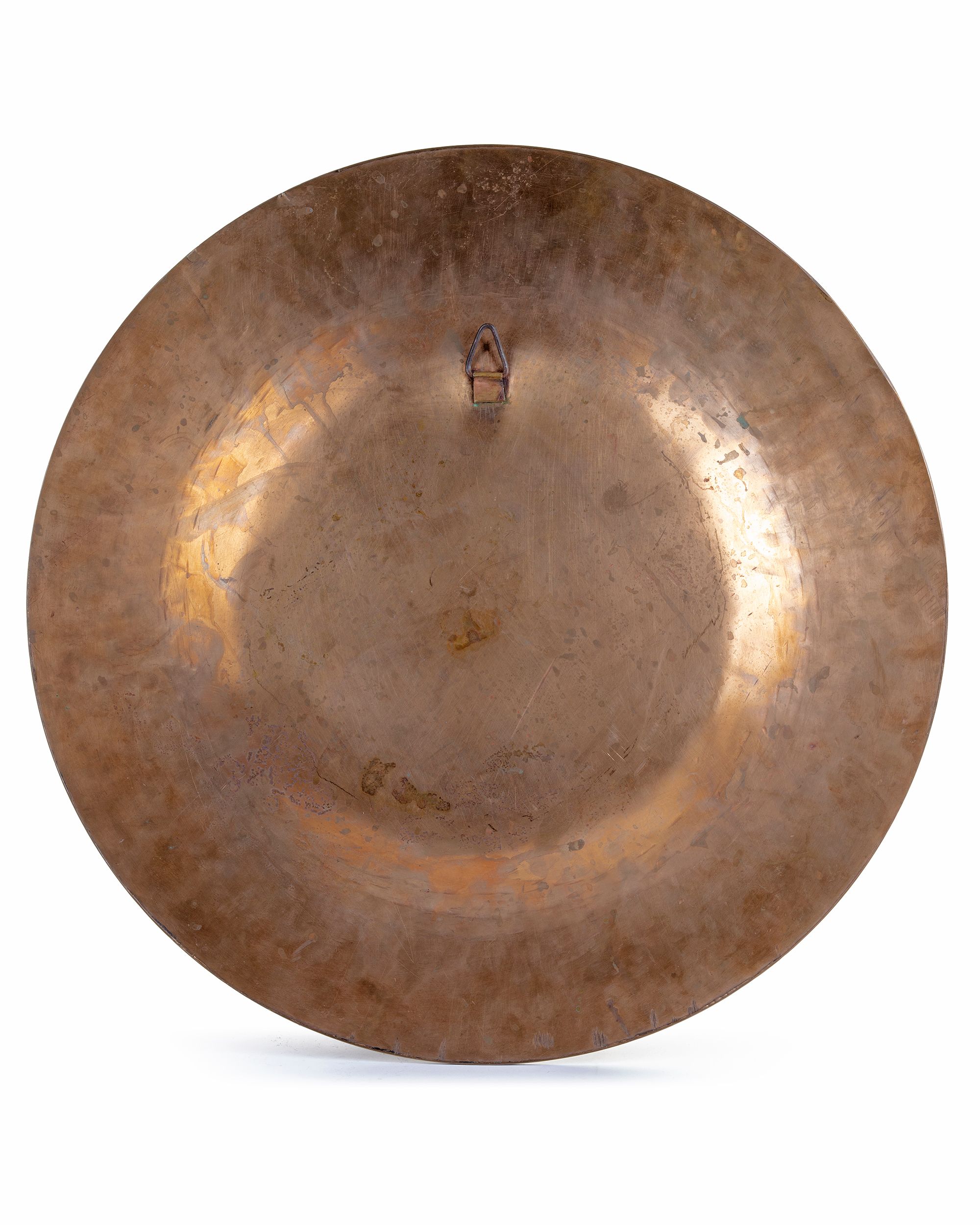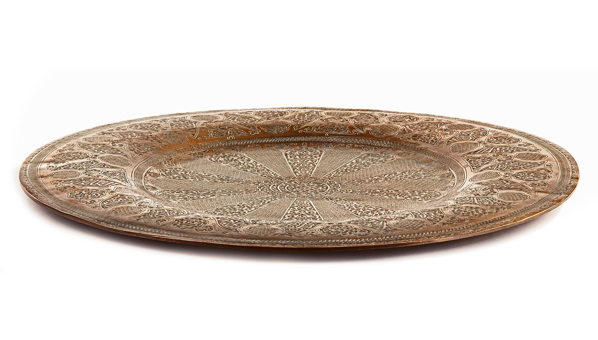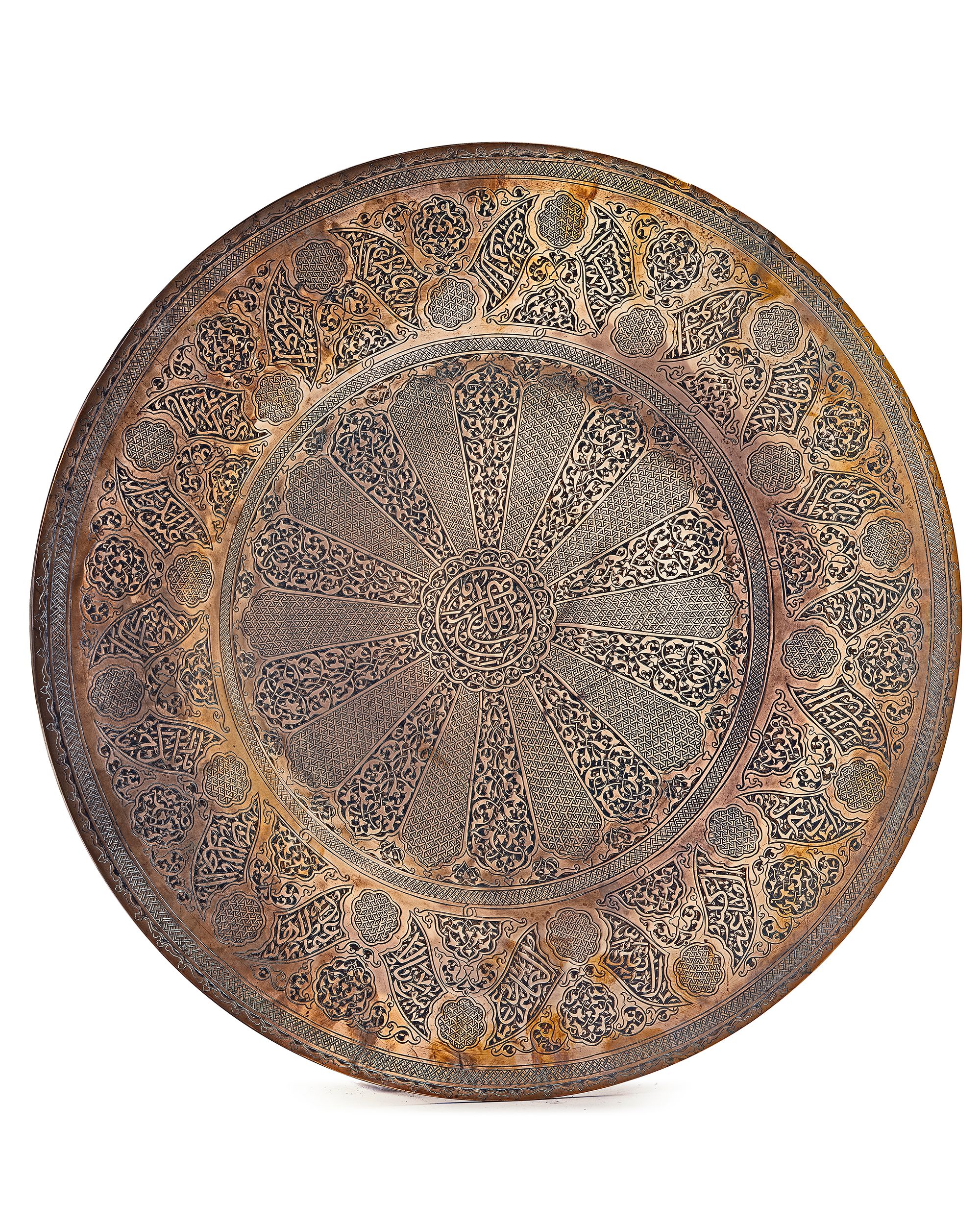 A Persian bronze tray with flaring sides, engraved to the centre with radiating panels enclosing Arabesque and foliage, the sides with cartouches enclosing Arabic inscriptions and Arabesque.
