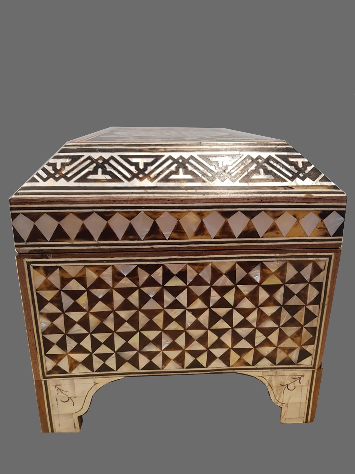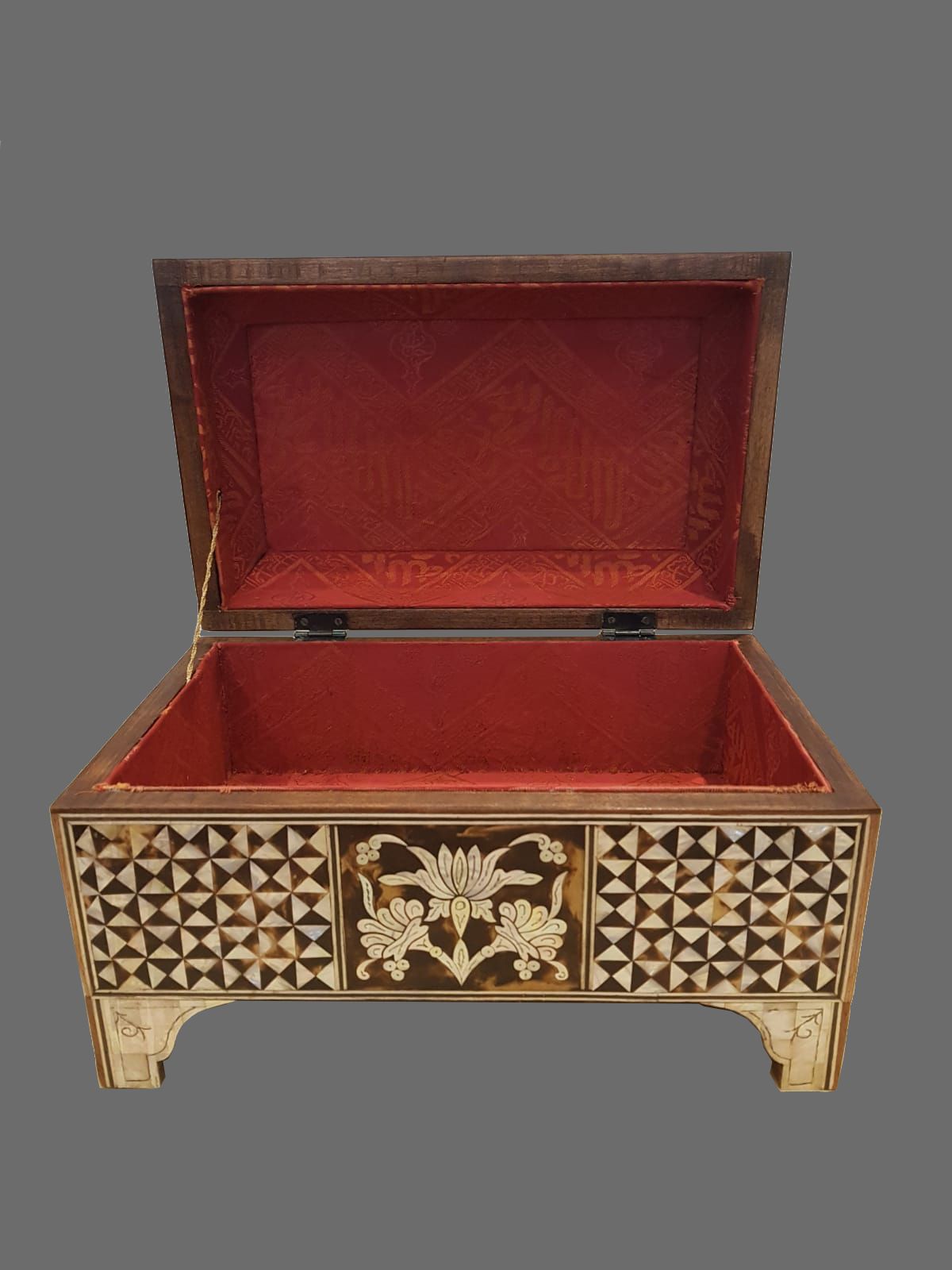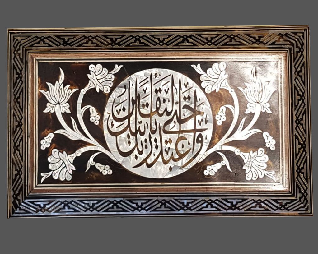 A wooden box with inlays of mother of pearl and turtle shell fragments, stylized with the 99th verse of Al-Ḥijr (ِArabic: الْحِجْر, "The Stoneland" or "The Rocky Tract") is the 15th chapter (sūrah) of the Qur'an.