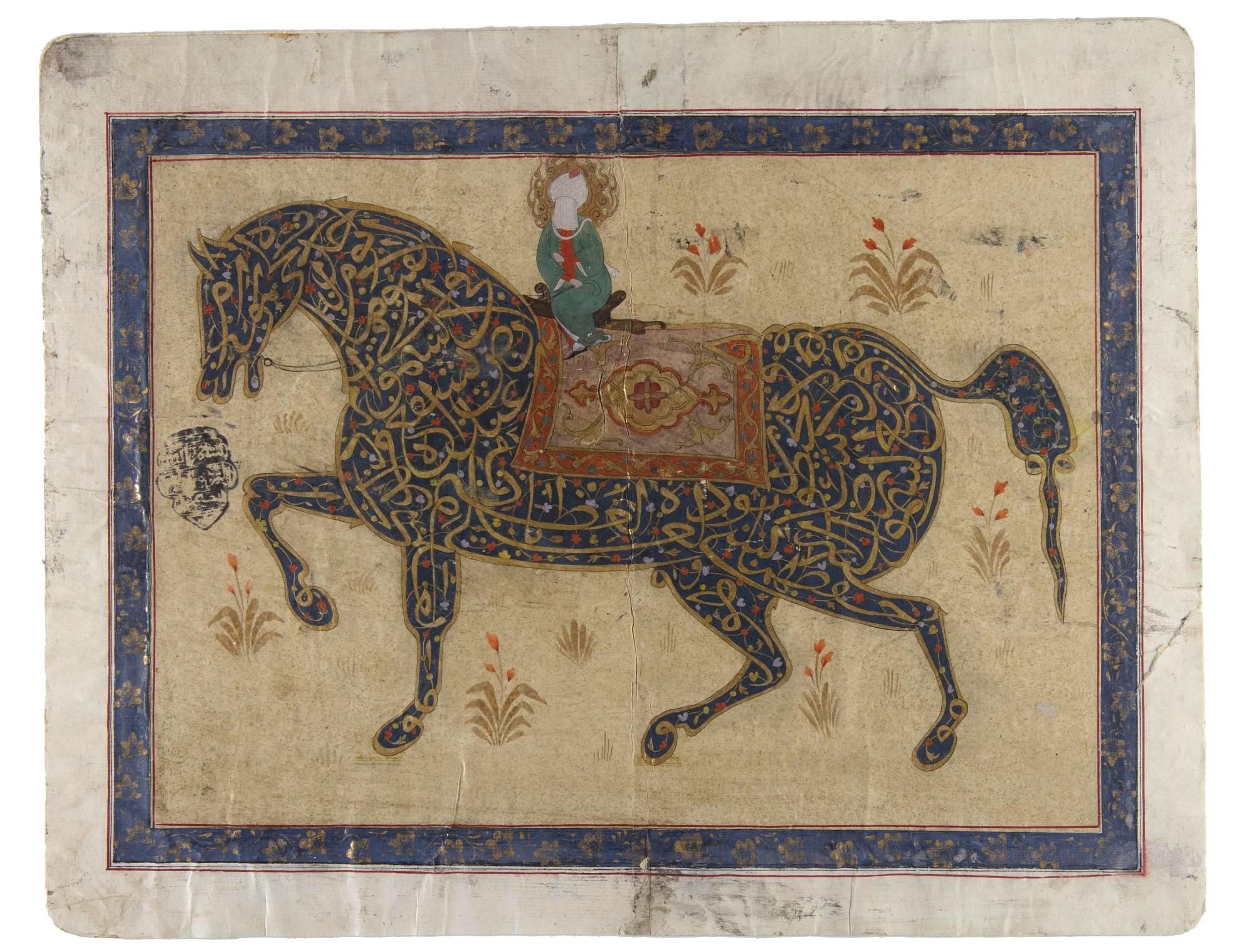 Text: Quran 2 surah Al-Baqarah v.255 Ink, opaque watercolor and gold on paper The text of the Throne Verse begins at the horse’s head; the first half of the verse is written in the area in front of the saddle; the second half of the verse is written in the area behind the saddle, and the final words are spread across the area below the saddle from the hind quarters to just above the vertical front leg. 36 by 28 cm.
