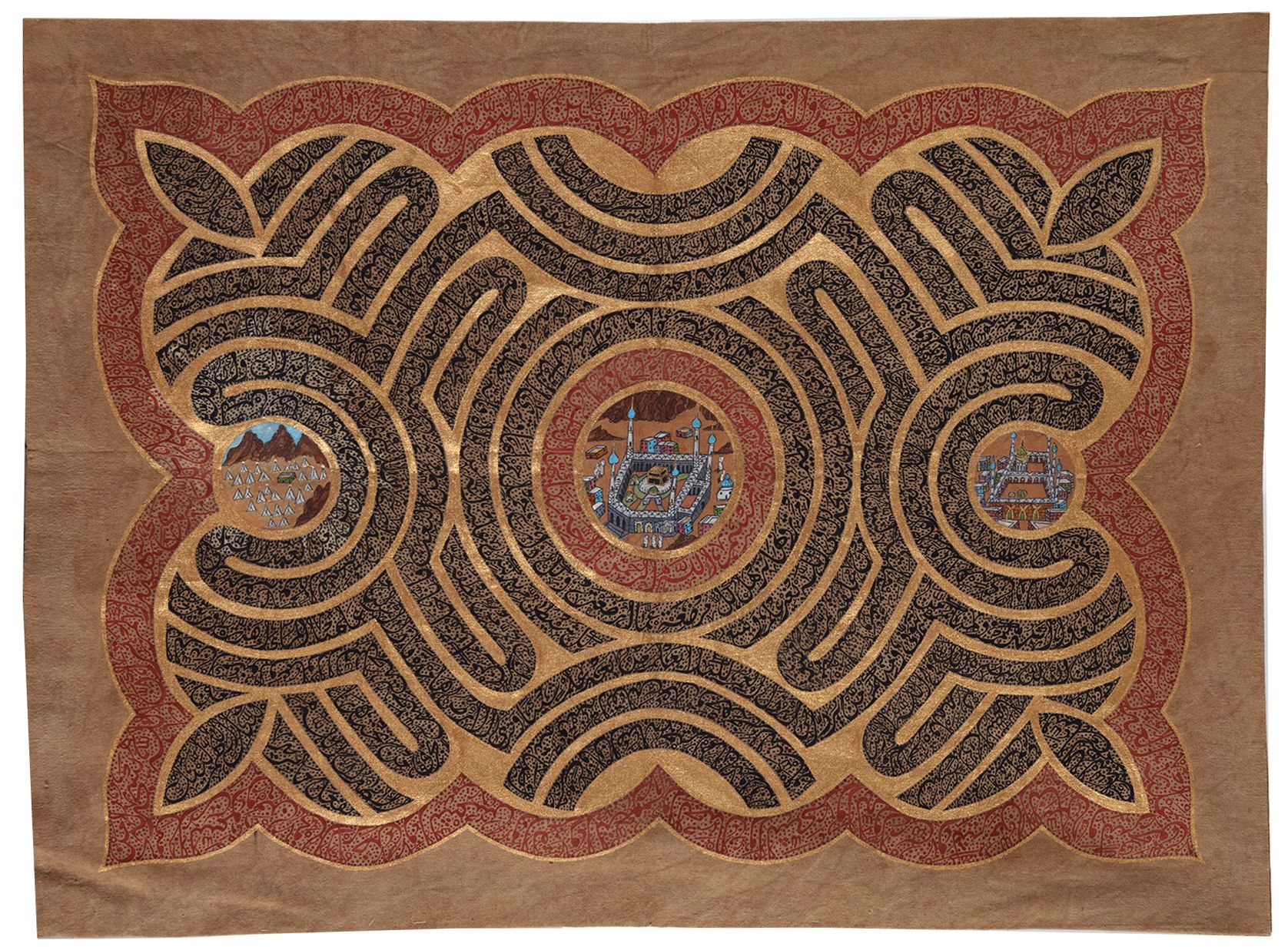 Inscribed in red and black ink in elegant naskh script and three painted roundels. The three roundels of a view of Mecca, Al-Medina and Tents at Mina, surrounded by a floral design enclosing Quran 22 surah Al-Ḥajj v.1-v.18 in black and red naskh script on a gilt ground. 53 by 73 cm.
