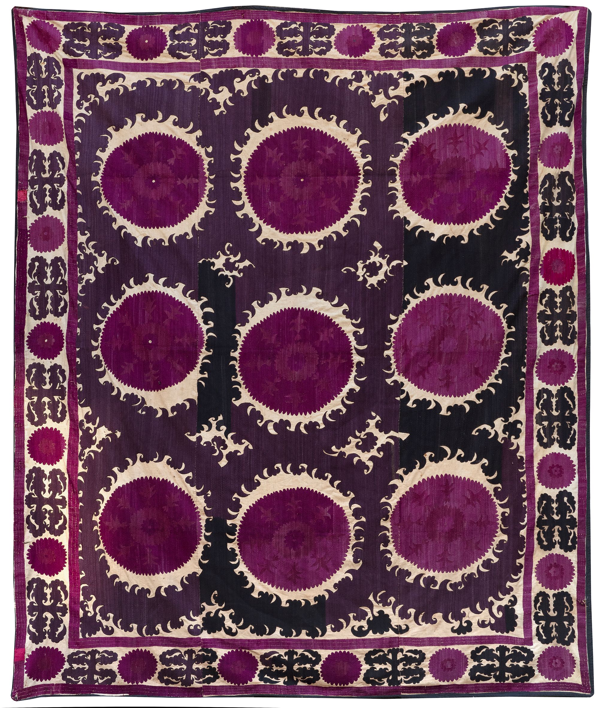 A suzani embroidered in purple and black on a cream ground with roundels enclosing large flower heads and bordered with smaller flower heads and foliage.