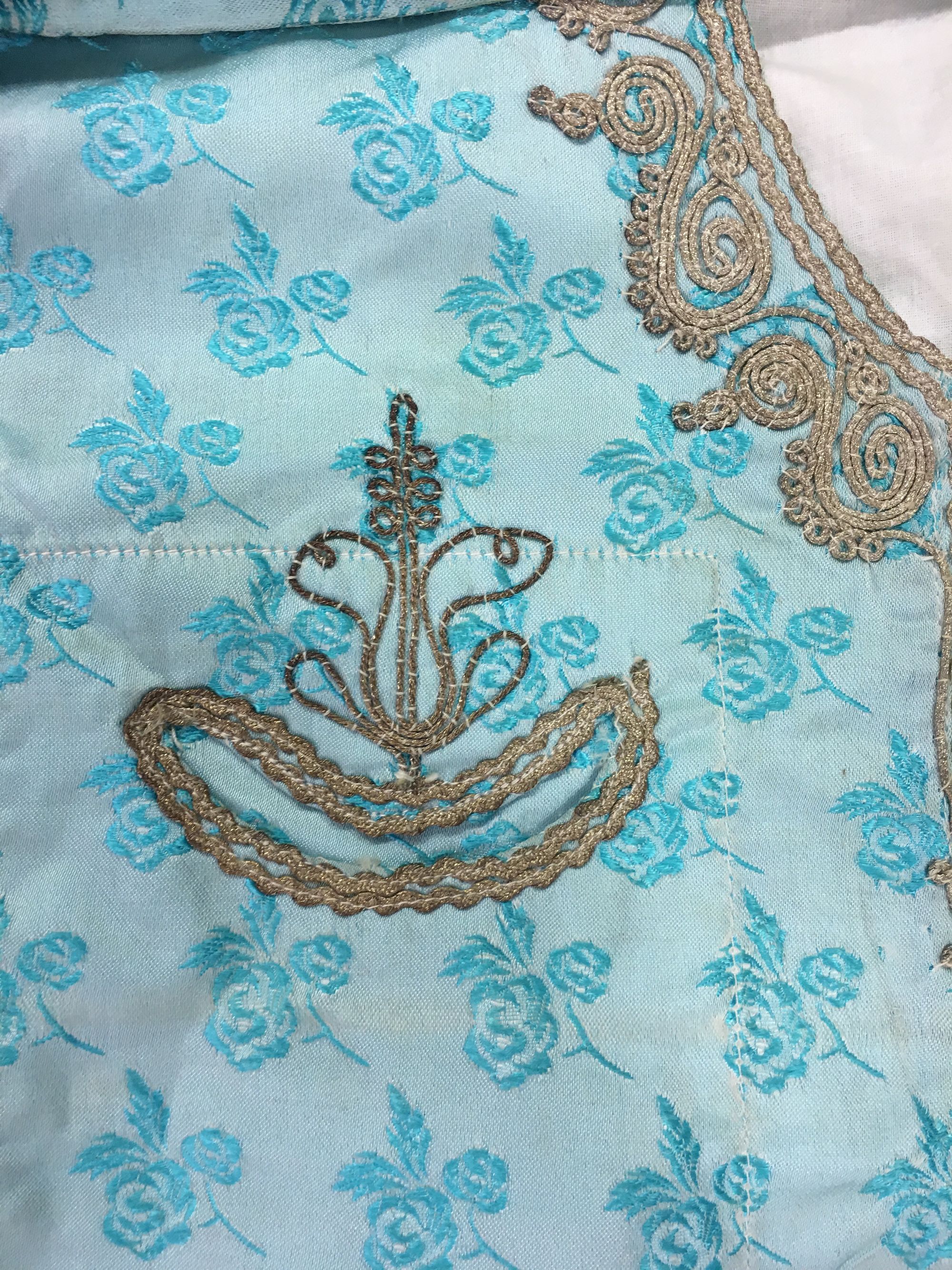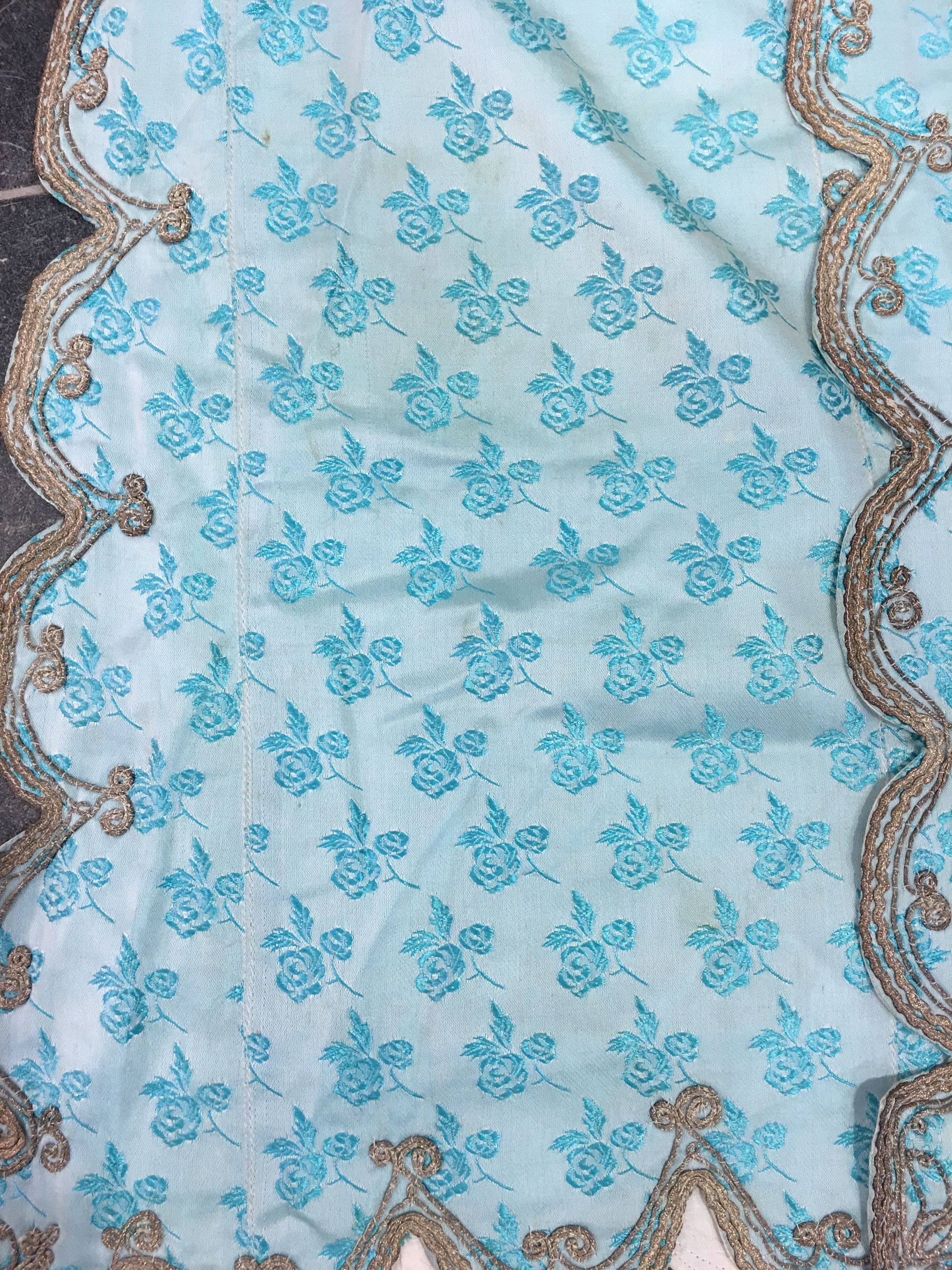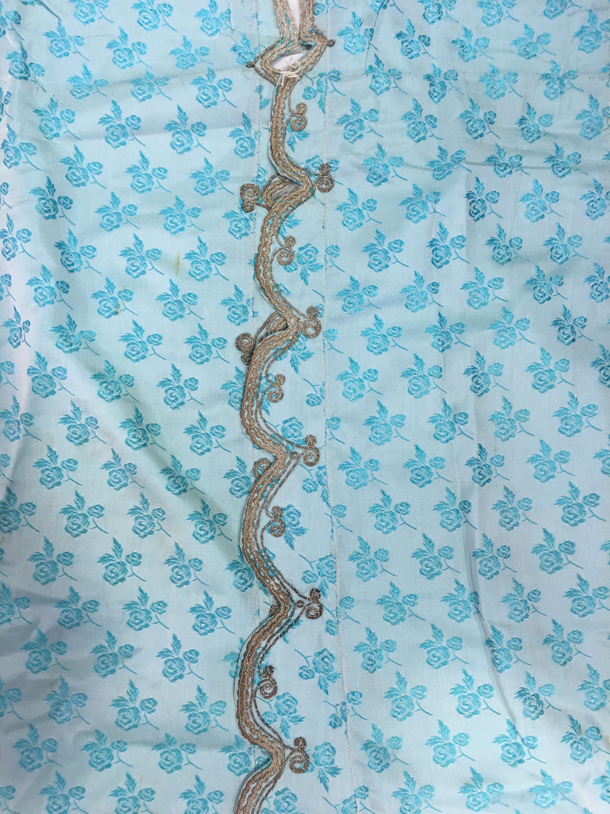 Of light sky blue silk woven with a floral sprig, embroidered to the edges with silver threads, together with a salwar.