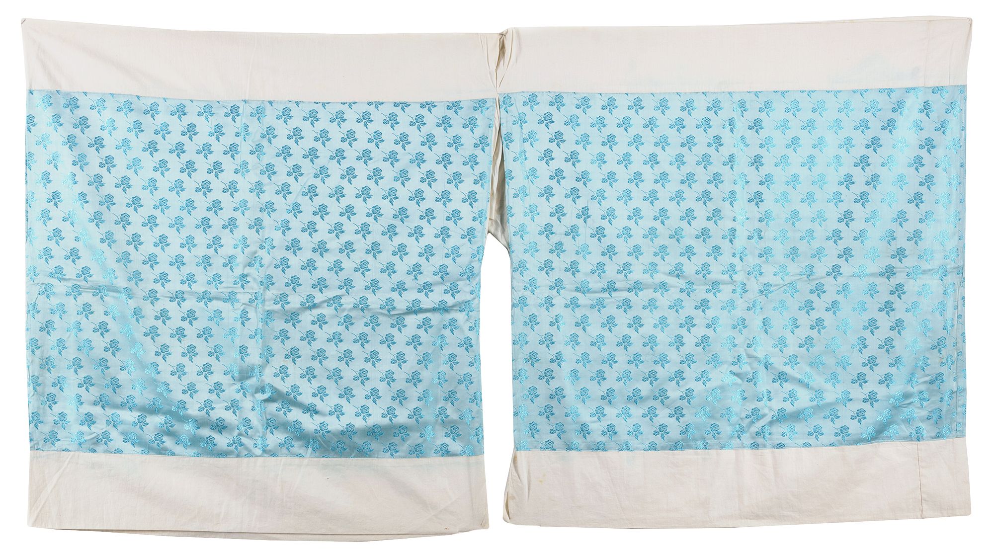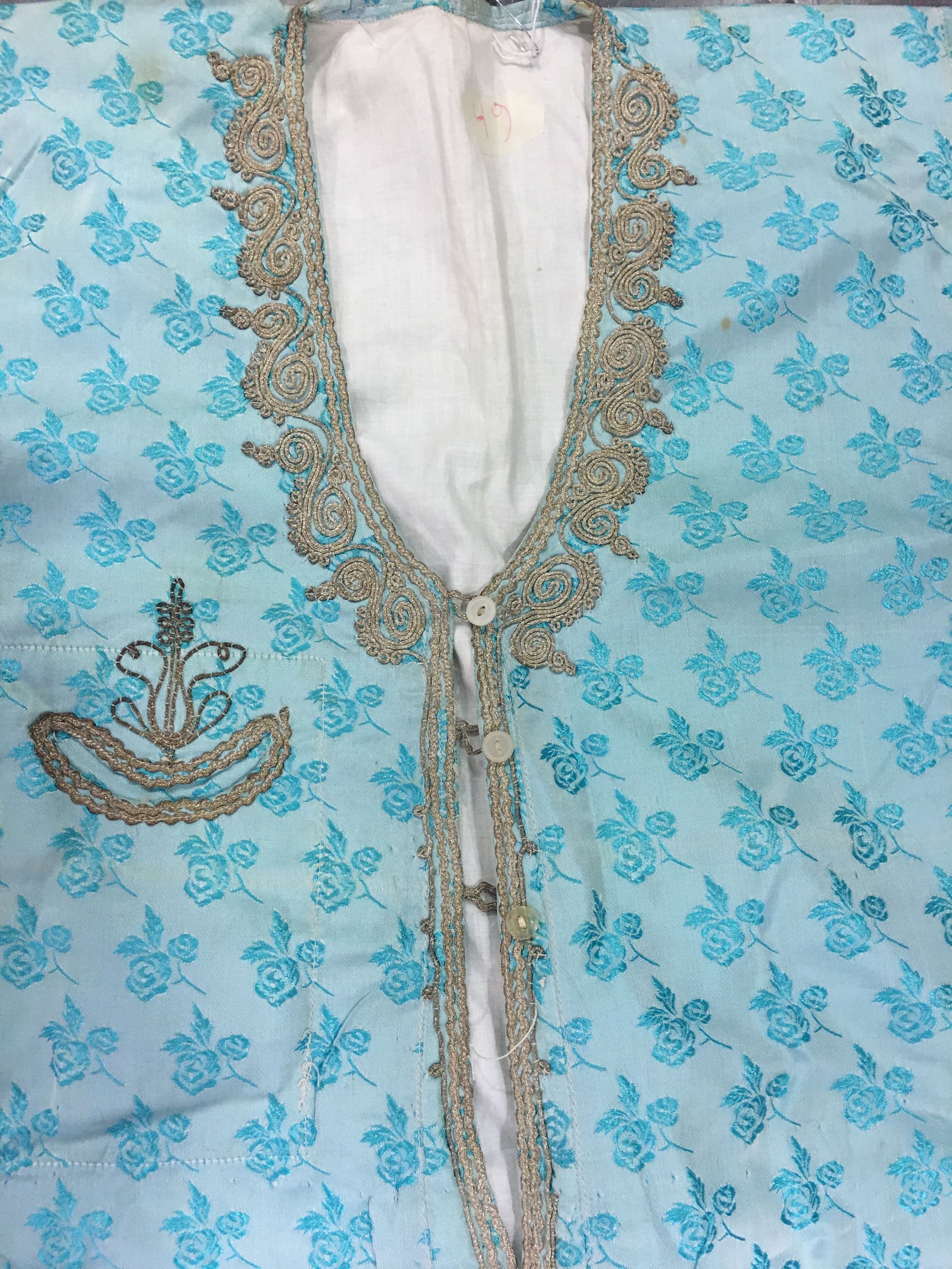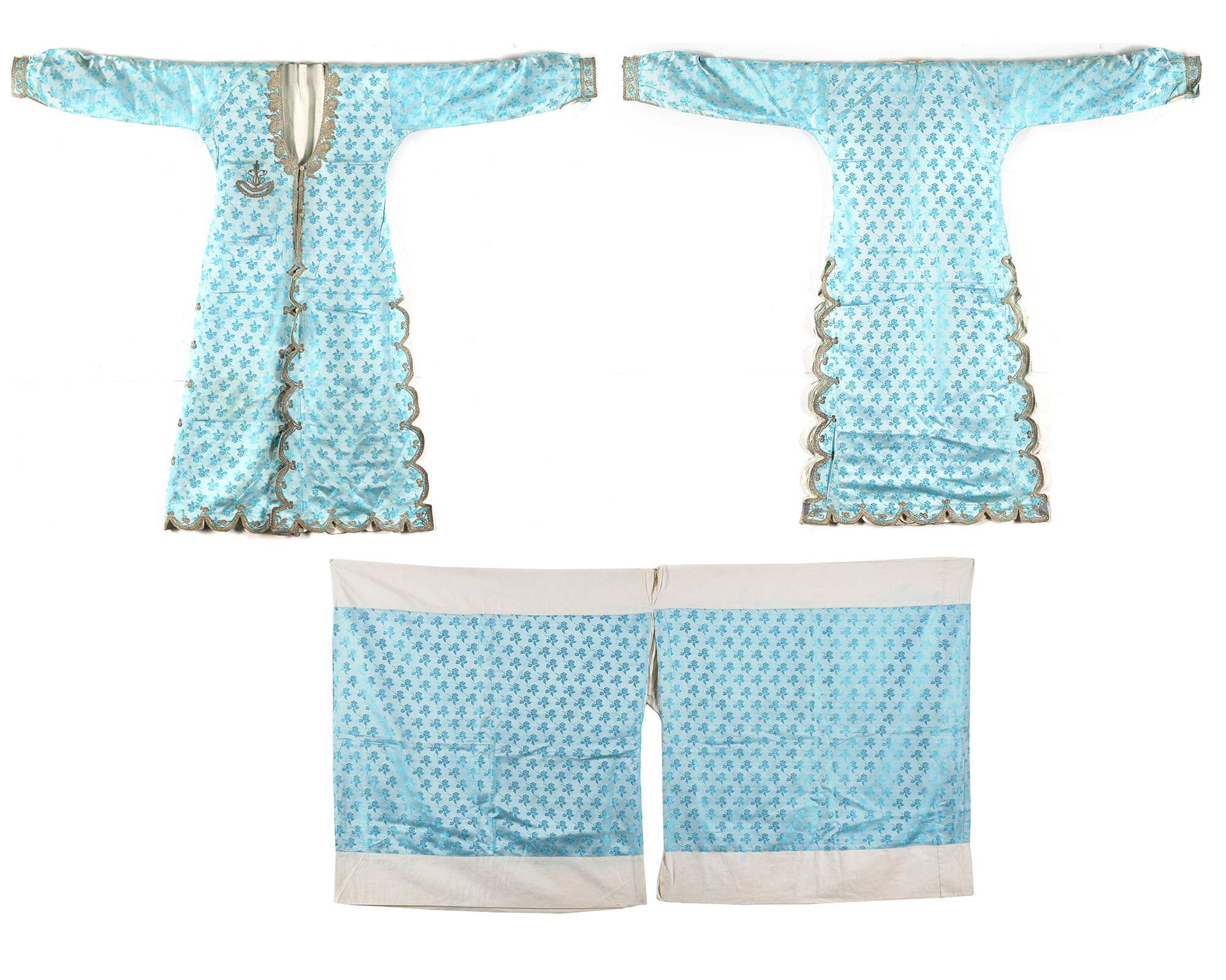 Of light sky blue silk woven with a floral sprig, embroidered to the edges with silver threads, together with a salwar.