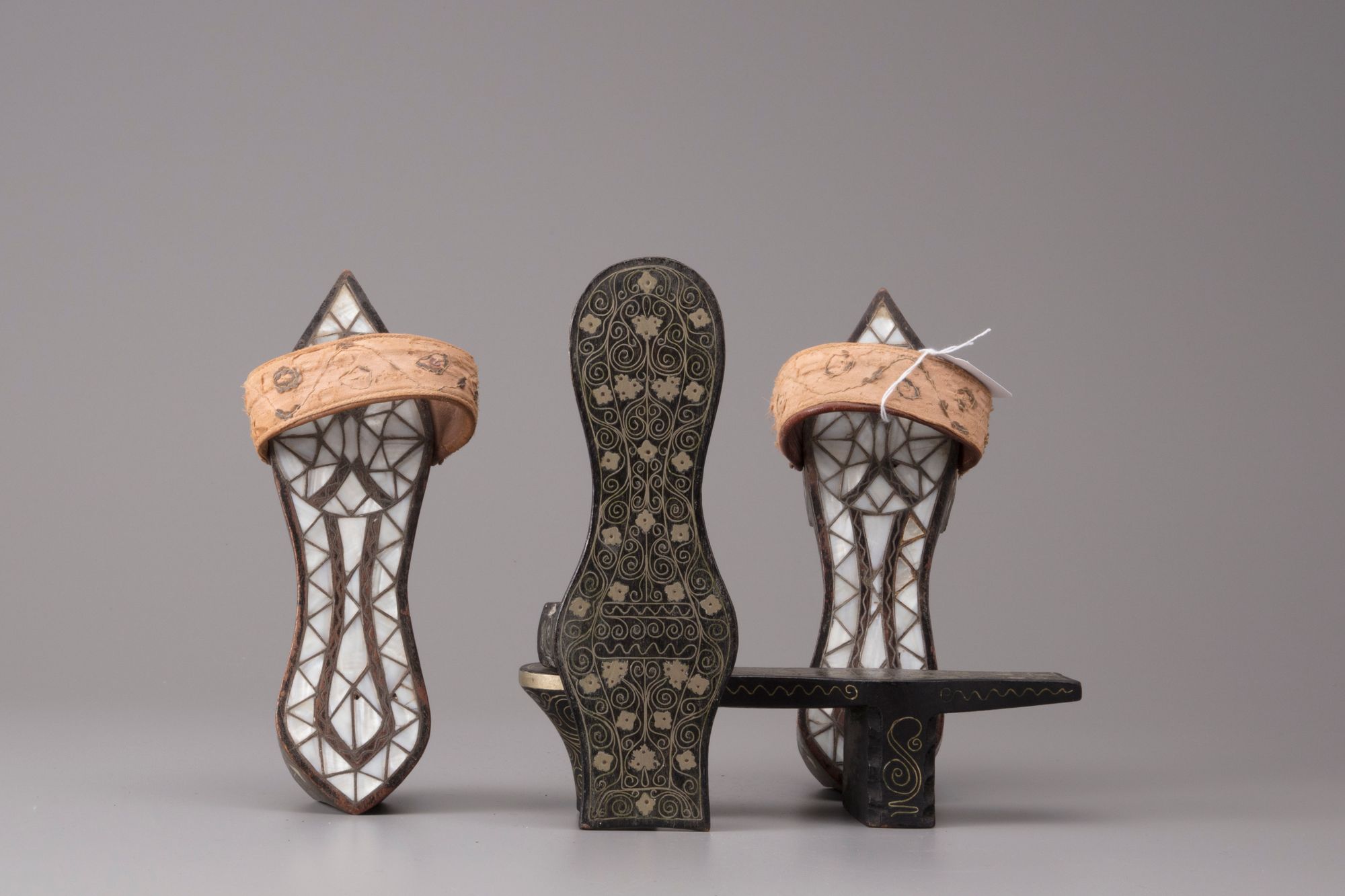Each with flat base resting on twin splayed trumpet feet, the surface inlaid with floral and geometric shapes.